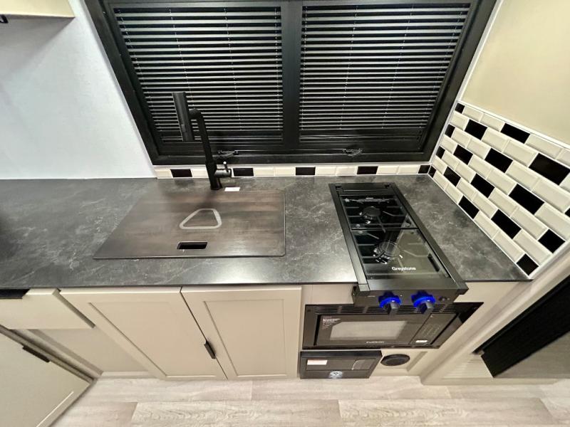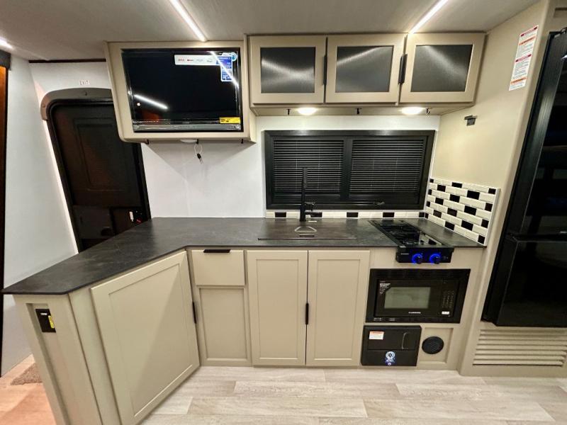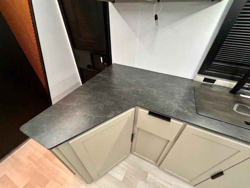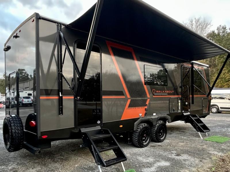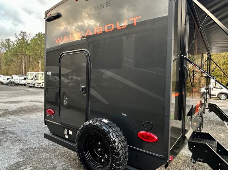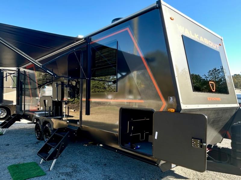 Each Keystone Walkabout travel trailer features a rugged automotive-grade aluminum exterior, designed to withstand the rigors of travel. The 11-gauge aluminum powder corner rails add strength and durability while keeping the trailer lightweight. It is known that storage is key to a comfortable trip. That's why these trailers are designed with maximum storage in mind, providing ample space for all your gear and equipment. You'll also feel like you're gliding down the road, not bouncing along, thanks to the Kurt Touring suspension that ensures a smooth ride, even on rough terrain. Further, the composite solid steps are durable and easy to clean, while the composite Thinscape countertop offers a stylish, low-maintenance surface for food prep and relaxation. Finally, with the 110-volt outlets throughout the trailer, you'll have plenty of power to keep your devices charged and your appliances running.