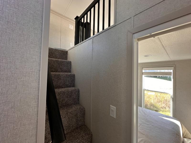 Grab this Lakeside Series park model and set it up at your favorite campsite for the winter! You can escape the harsh cold in the North by getting away to this unit somewhere in the warmer South. You'll have a comfortable living area with a hide-a-bed sofa, swivel rocker chair, end table, and entertainment center with optional fireplace. The rear private bedroom offers you a queen bed for sleeping, and there is a loft above for others to use as a sleeping space. Each morning you can prepare breakfast quite easily with the four-burner range, and there is a table with four chairs to enjoy your meals at!