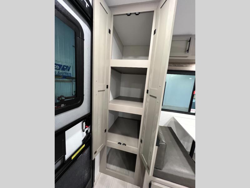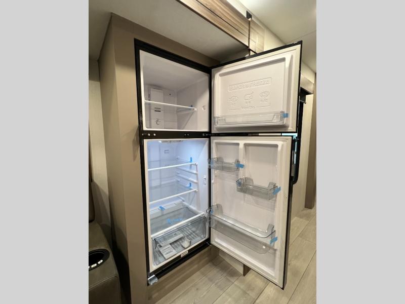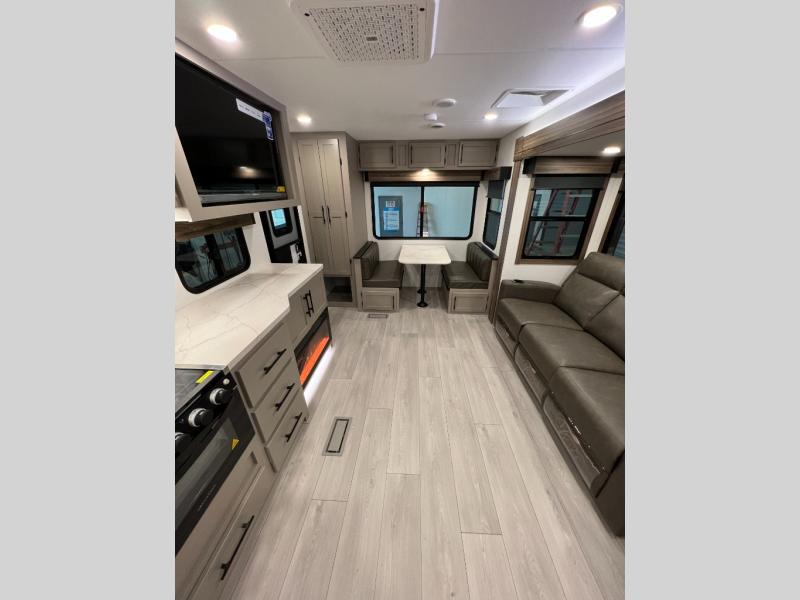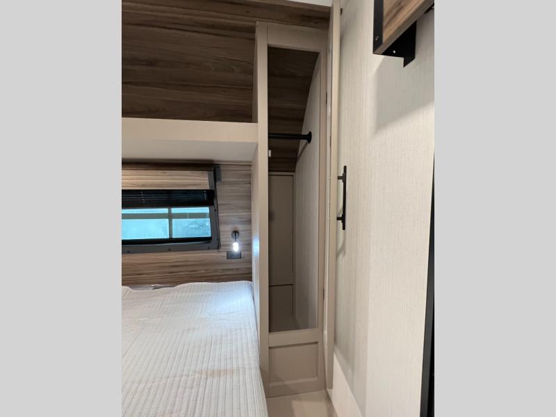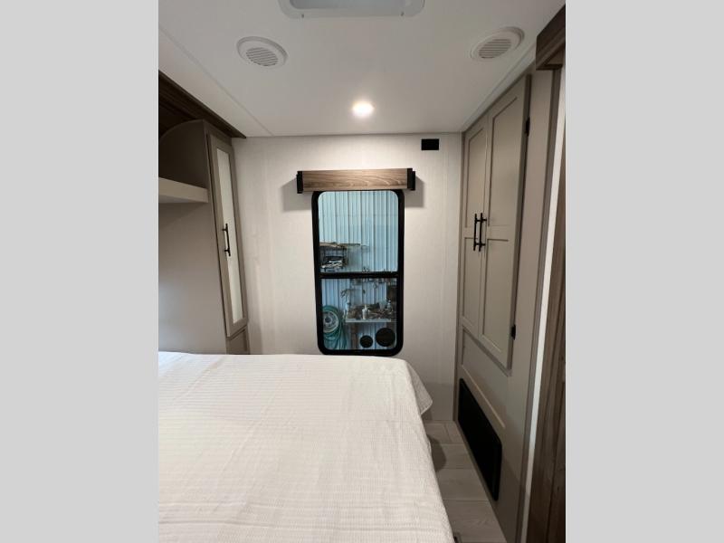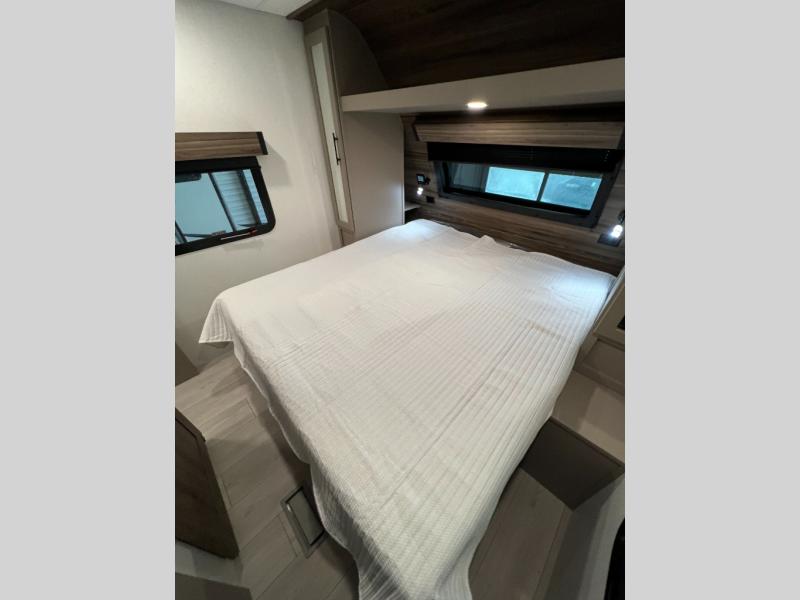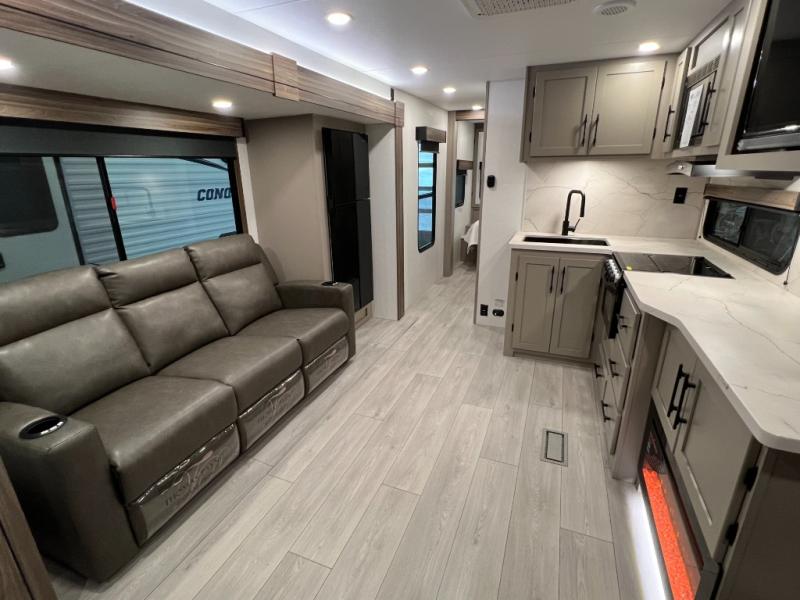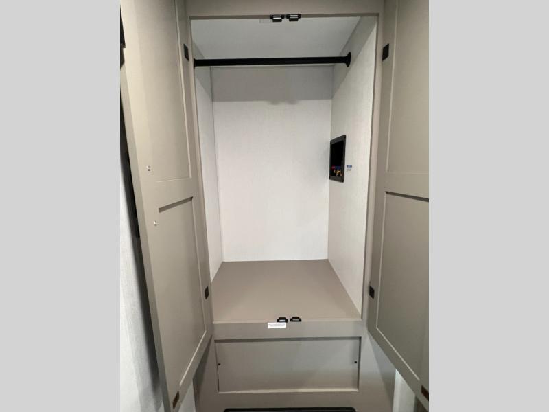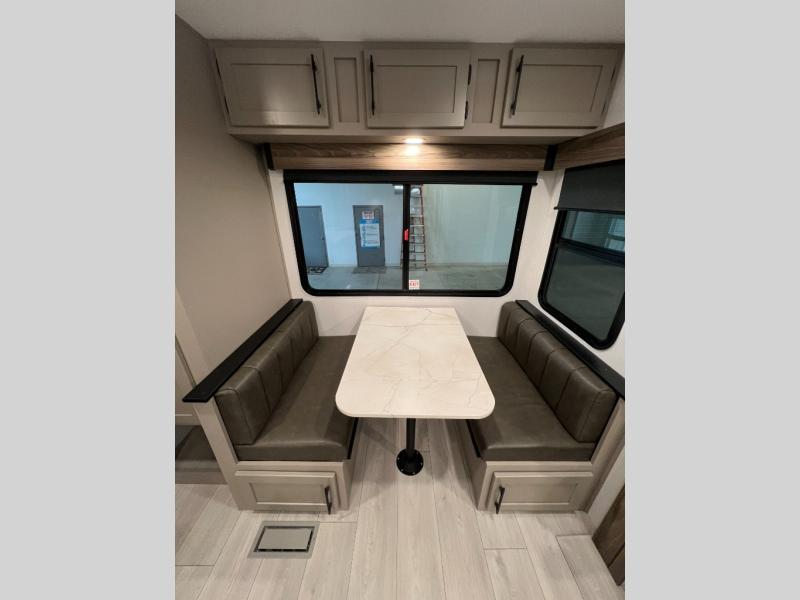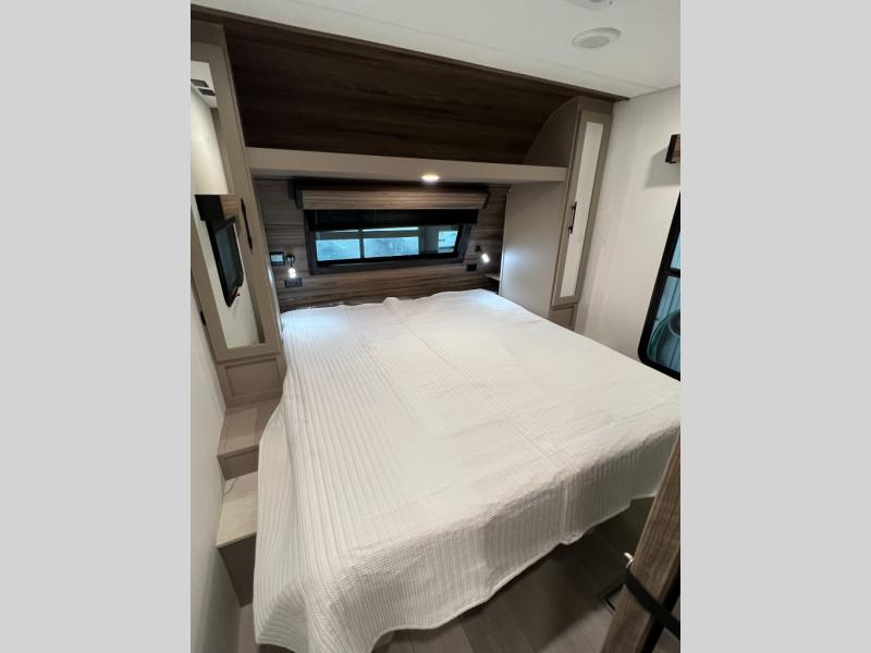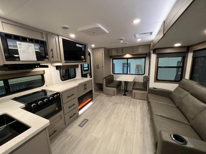 This is the perfect couple's travel trailer! You will enjoy the added space in the living area because of the slide that holds the theater seating with USB charging ports to charge your phone while you recharge relaxing! Another convenient feature is the swing arm TV to adjust better to view your favorite show. You will be quite surprised to find a king-size bed in the front bedroom, along with dual closets with clothes rods to keep your things organized. A pass-through storage on the exterior allows you to bring along extra gear, and the interior is kept cozy on chilly fall evenings with the 34" fireplace. Enjoy some quality time even outdoors when traveling under the 20' awning with LED lights.
