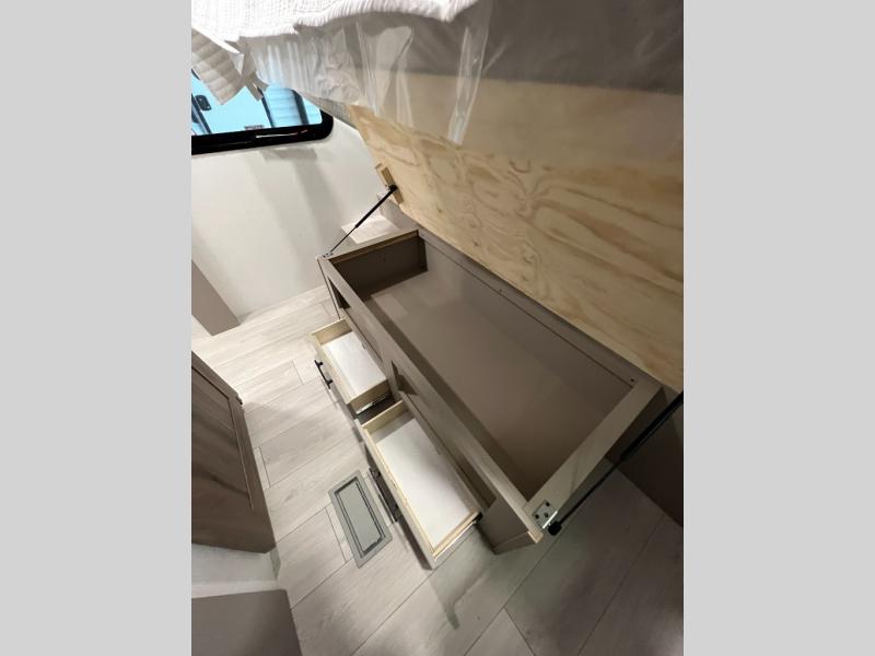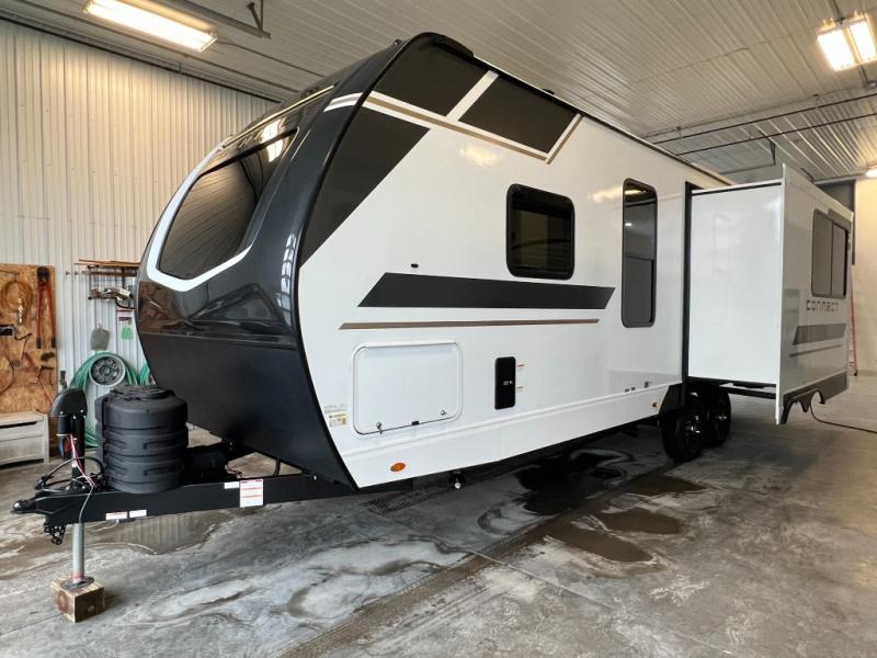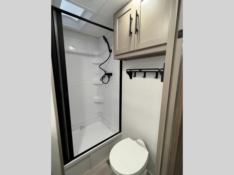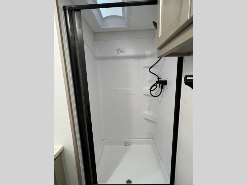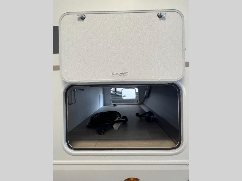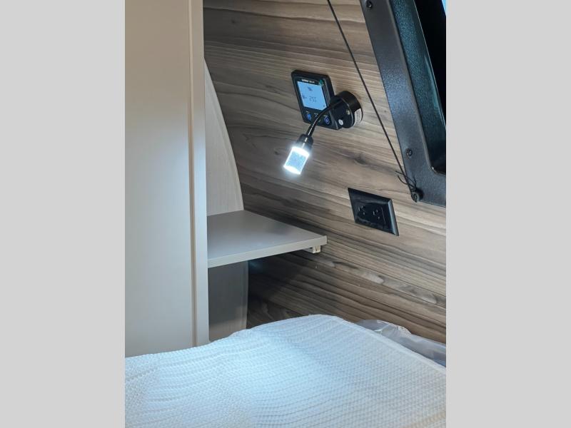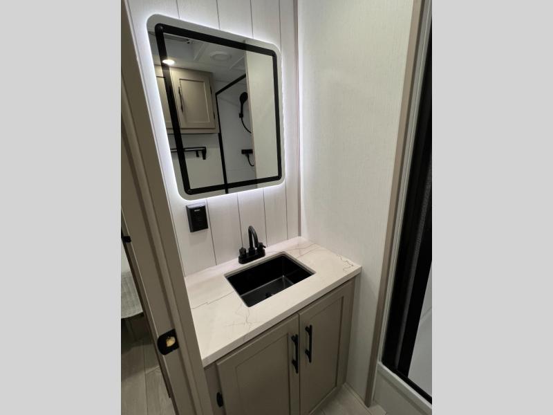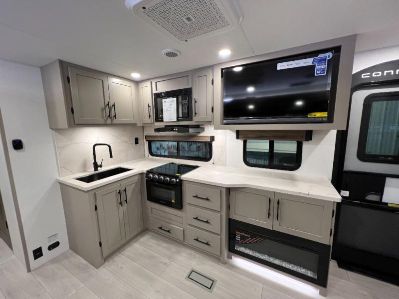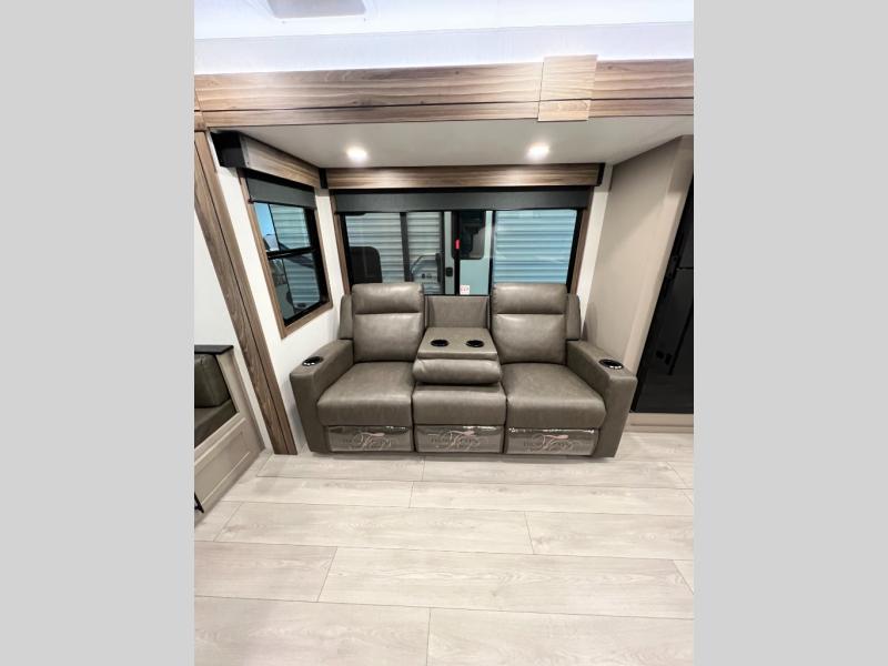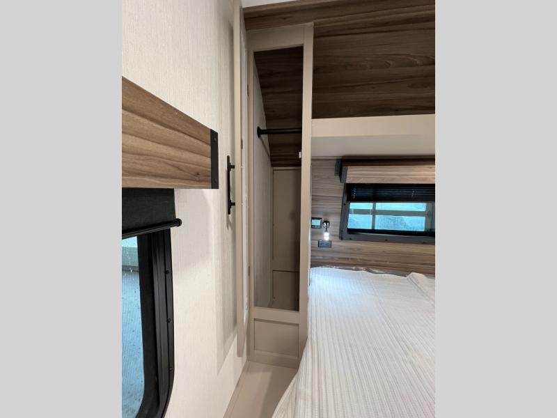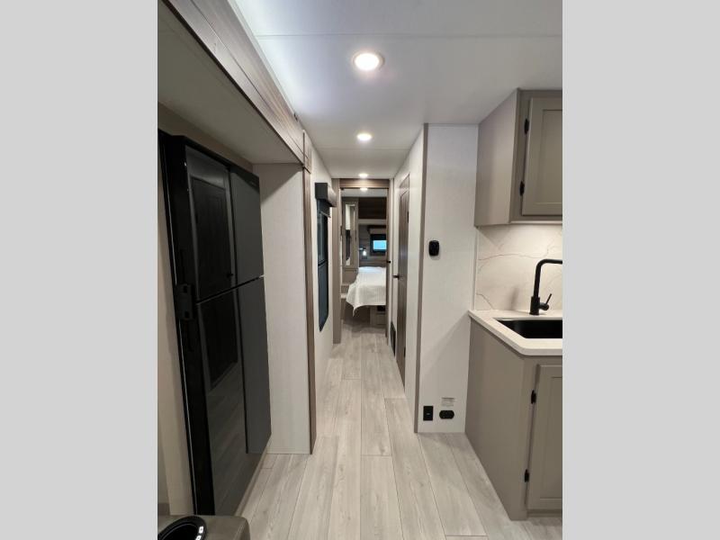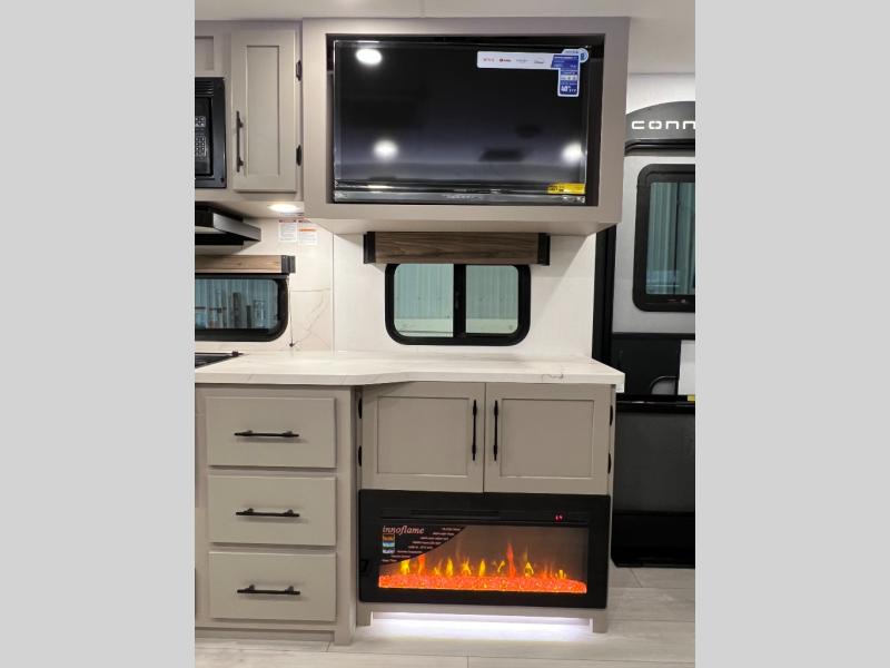 This is the perfect couple's travel trailer! You will enjoy the added space in the living area because of the slide that holds the theater seating with USB charging ports to charge your phone while you recharge relaxing! Another convenient feature is the swing arm TV to adjust better to view your favorite show. You will be quite surprised to find a king-size bed in the front bedroom, along with dual closets with clothes rods to keep your things organized. A pass-through storage on the exterior allows you to bring along extra gear, and the interior is kept cozy on chilly fall evenings with the 34" fireplace. Enjoy some quality time even outdoors when traveling under the 20' awning with LED lights.
