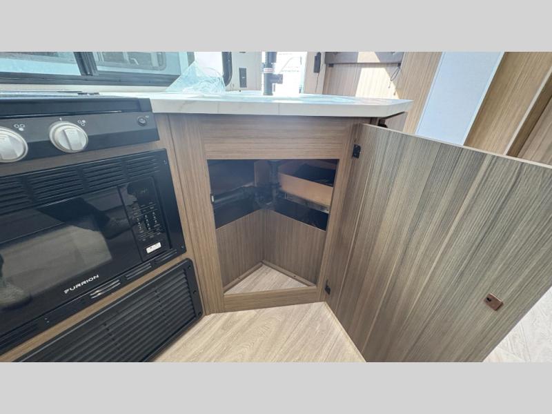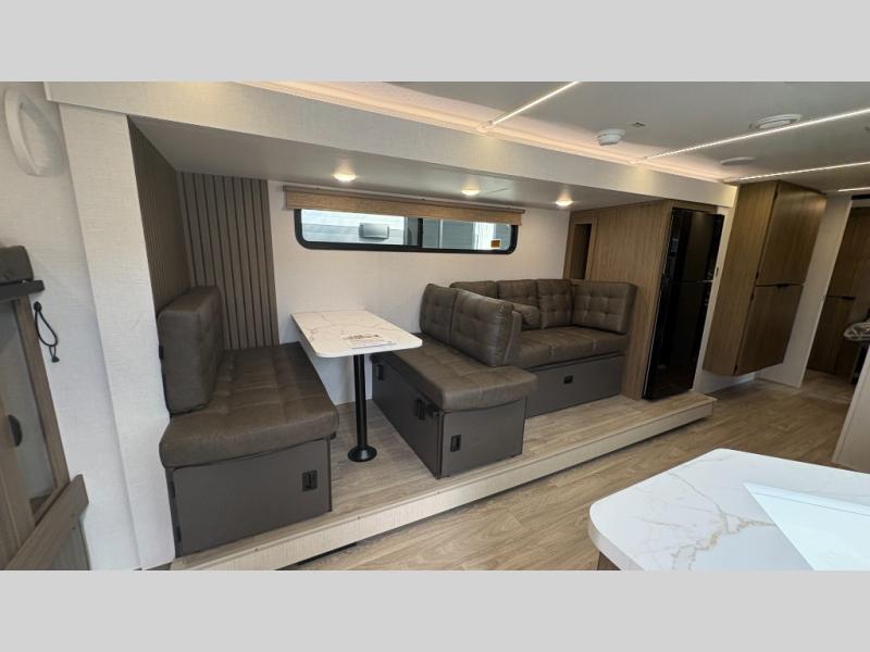 The perfect couple's trailer is found in this Connect! After you wake up each morning on the king bed slide, you can use the walk-in closet to get ready for the day. There is also a dresser here and a TV mount if you want the option to watch movies in bed. A three burner range and microwave oven in the full kitchen will let you make breakfast before heading out for the day, and the theater seating will provide a place to relax once you get back. The entertainment center with a fireplace will make this room feel more like home, and the kitchen island includes ample counter space with its flip-up top. The full rear bath includes dual bath sinks so you both can get ready at the same time, and the wardrobe with washer and dryer prep gives you the option to add these appliances.