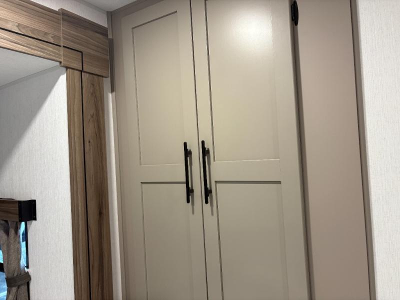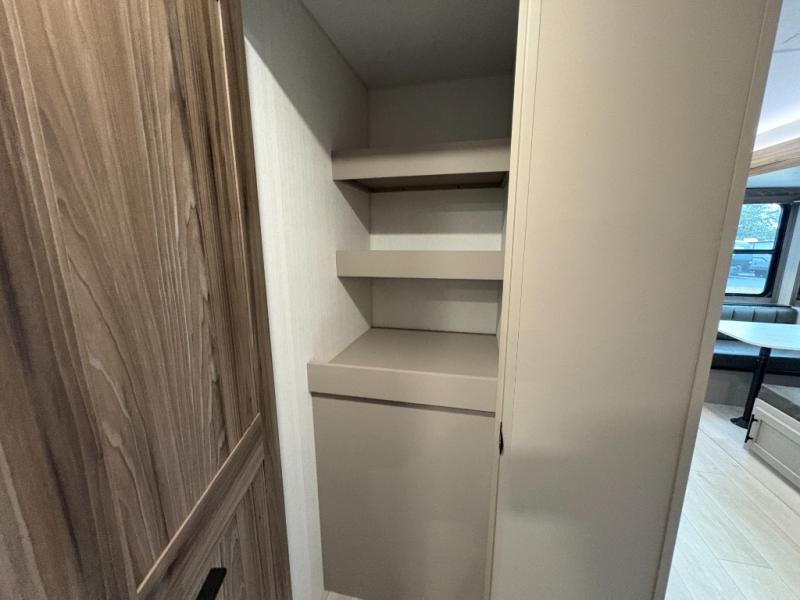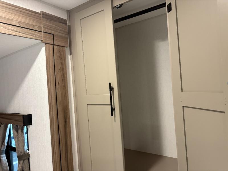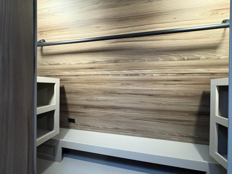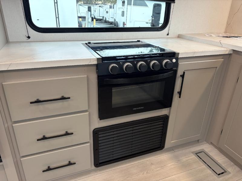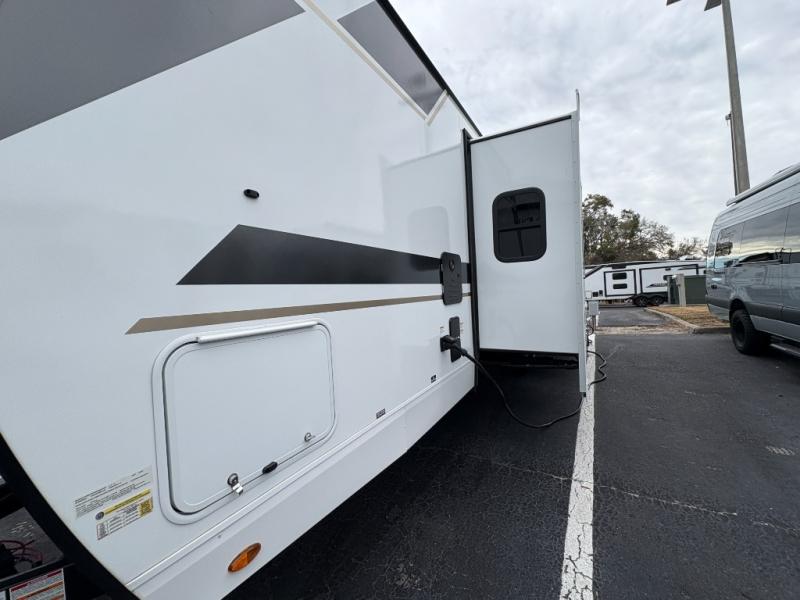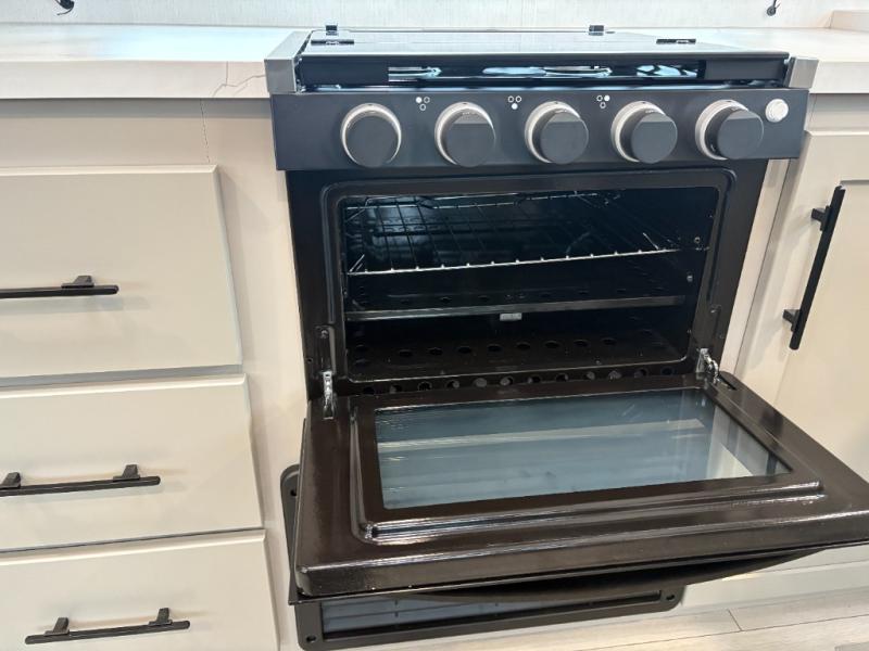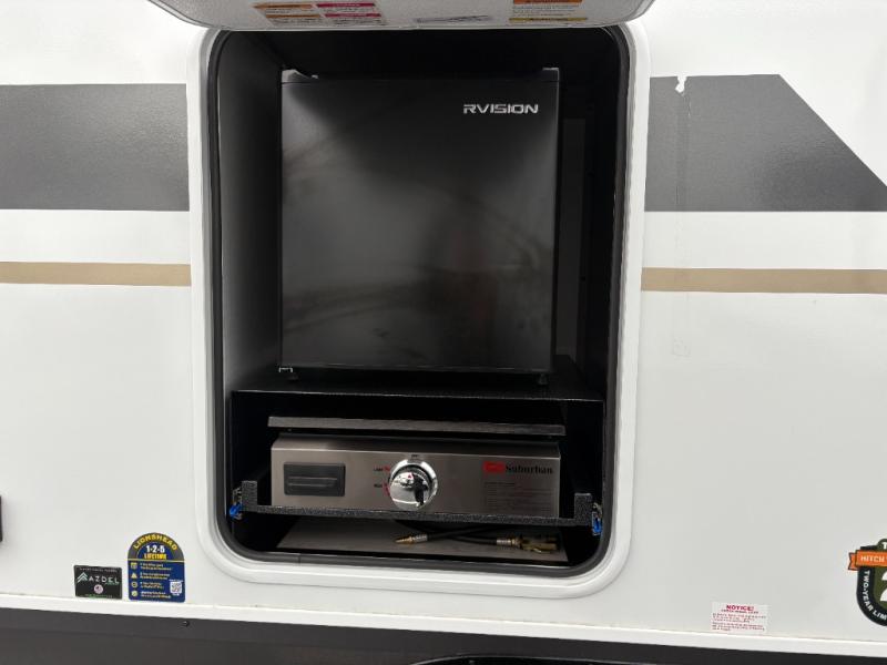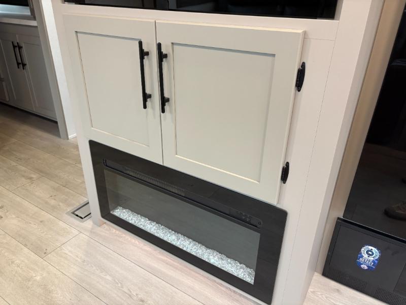 Pack your bags and head to the lake in this cozy travel trailer for five. Once you unload your gear from the pass-through storage, prepare a quick lunch on the mini outside kitchen with a griddle and relax under the patio awning. If the weather is raining on your parade, just head indoors to cook on the three burner cooktop, and you'll find ample counter space in this rear kitchen to set out drinks and sides. Your crew can relax on the hide-a-bed sofa and booth dinette within the large slide out, and there is an LED TV and a 34" fireplace for a more at-home atmosphere. One of your favorite features of this trailer will probably be the master suite with a king bed slide out, a dresser and an entertainment center, plus easy access to the front full bath. Here, you'll find dual bath sinks, a spacious shower, plus a walk-in closet with a closet rod to keep your outfits wrinkle free. There is even a wardrobe in the bedroom with washer and dryer prep so you can keep all those clothes fresh and clean!