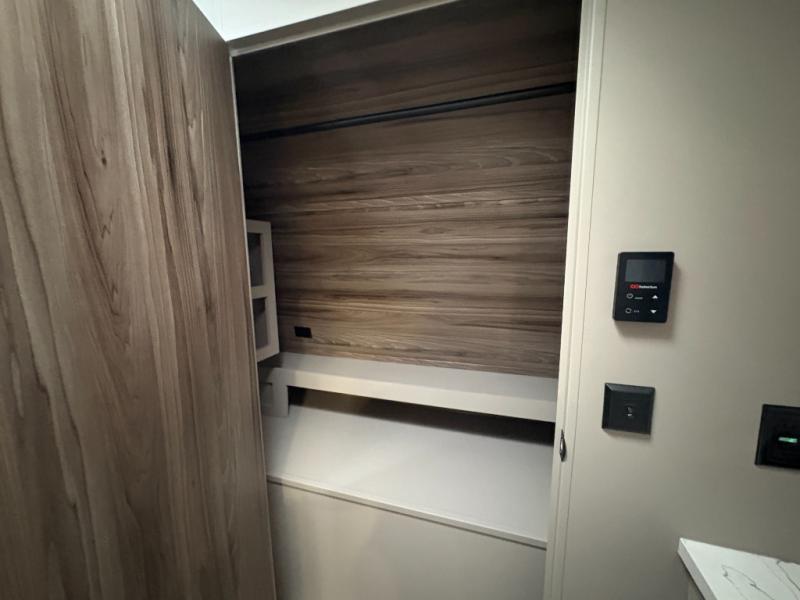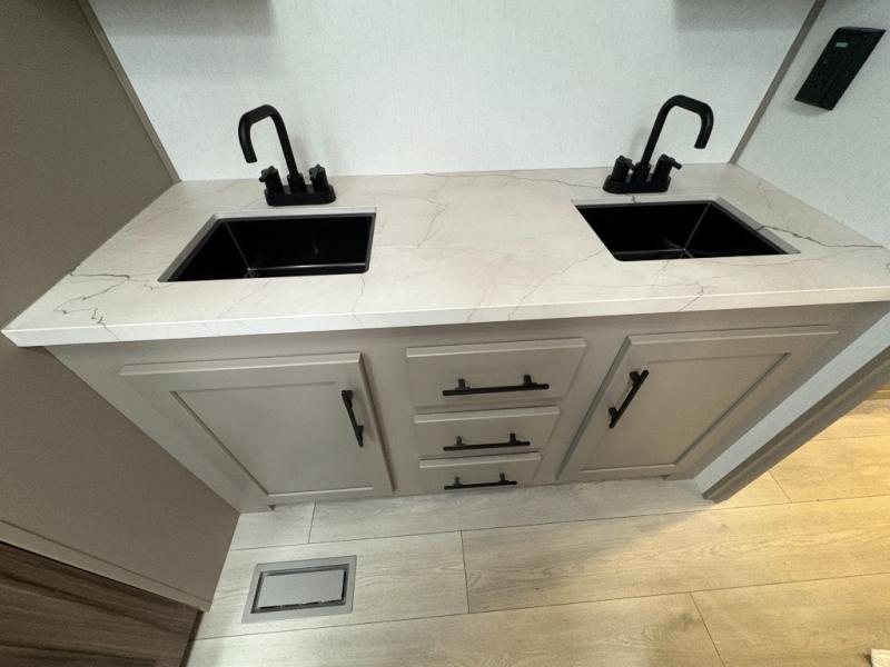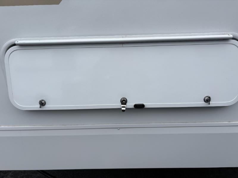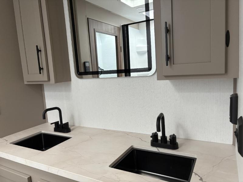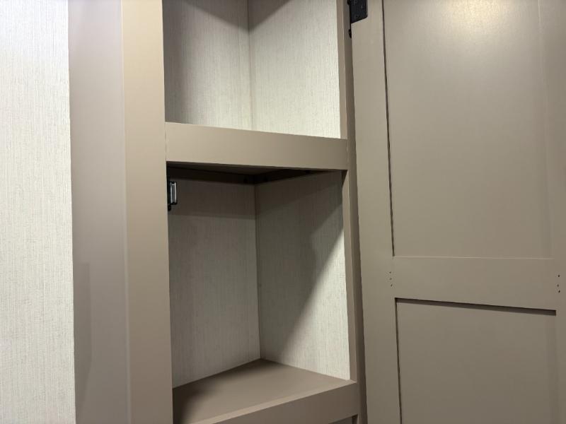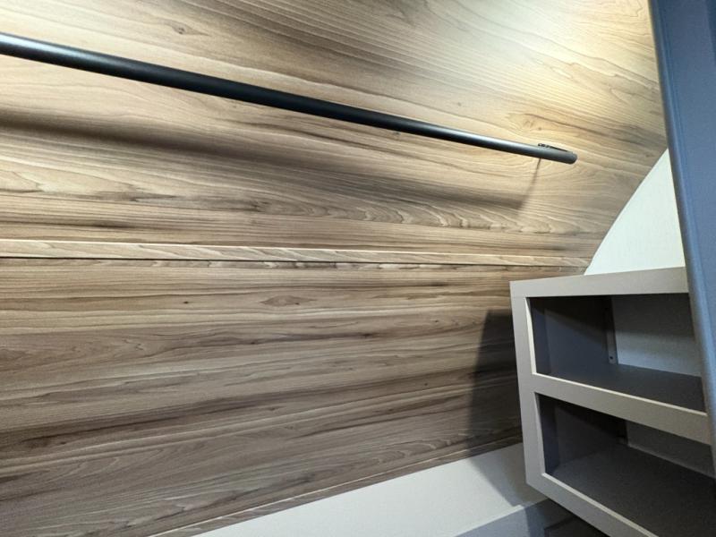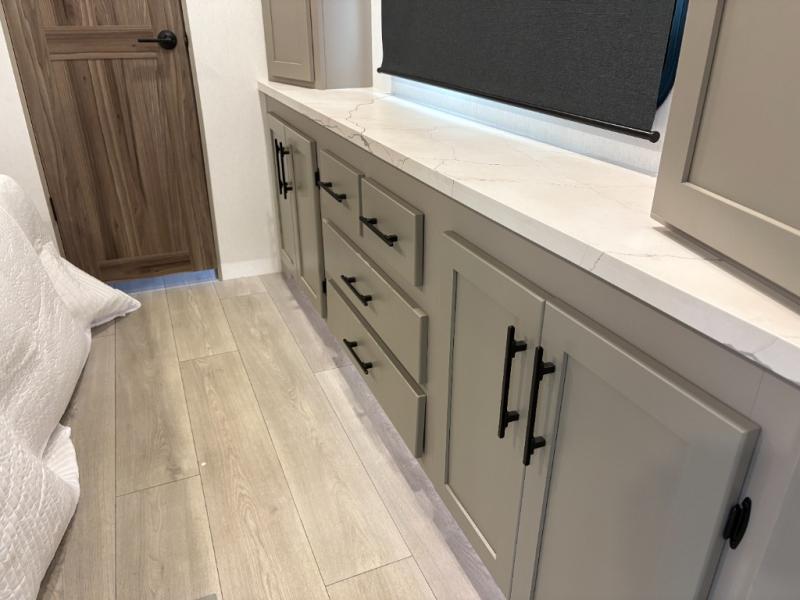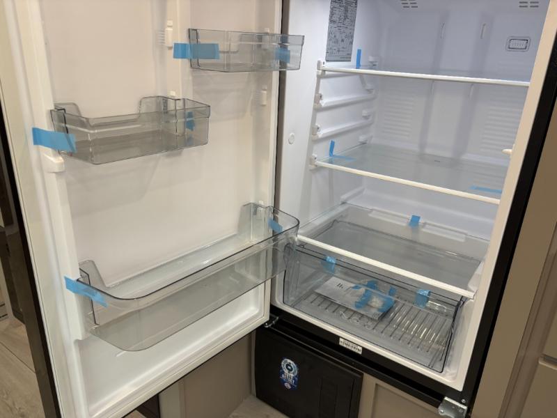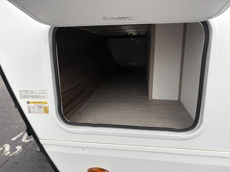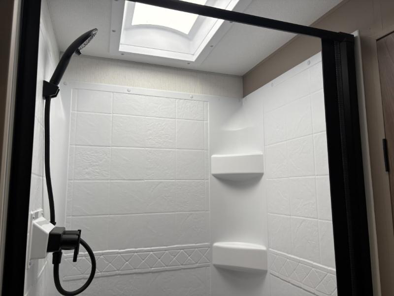 Pack your bags and head to the lake in this cozy travel trailer for five. Once you unload your gear from the pass-through storage, prepare a quick lunch on the mini outside kitchen with a griddle and relax under the patio awning. If the weather is raining on your parade, just head indoors to cook on the three burner cooktop, and you'll find ample counter space in this rear kitchen to set out drinks and sides. Your crew can relax on the hide-a-bed sofa and booth dinette within the large slide out, and there is an LED TV and a 34" fireplace for a more at-home atmosphere. One of your favorite features of this trailer will probably be the master suite with a king bed slide out, a dresser and an entertainment center, plus easy access to the front full bath. Here, you'll find dual bath sinks, a spacious shower, plus a walk-in closet with a closet rod to keep your outfits wrinkle free. There is even a wardrobe in the bedroom with washer and dryer prep so you can keep all those clothes fresh and clean!