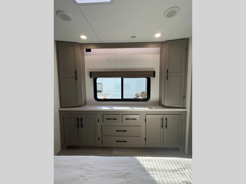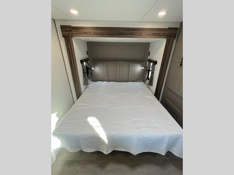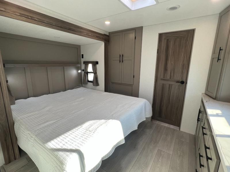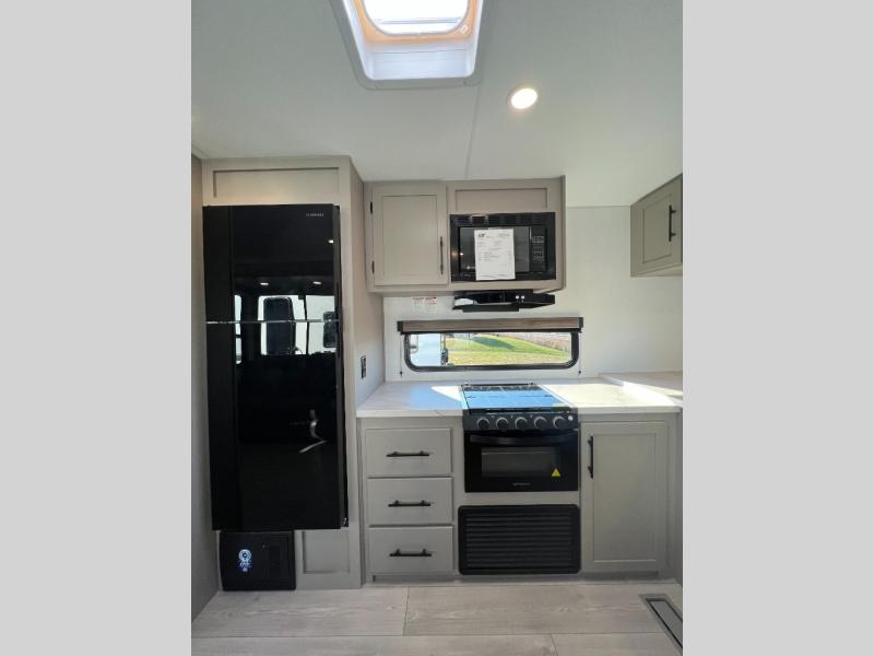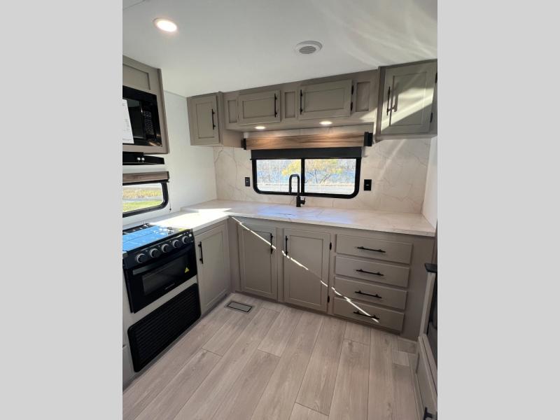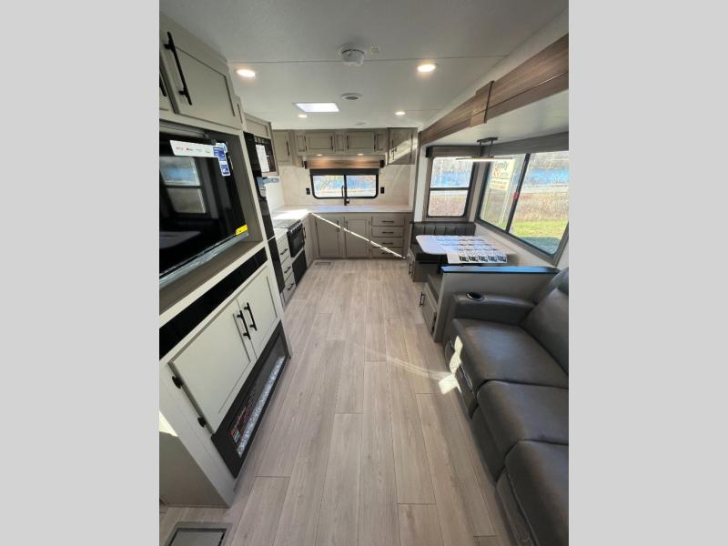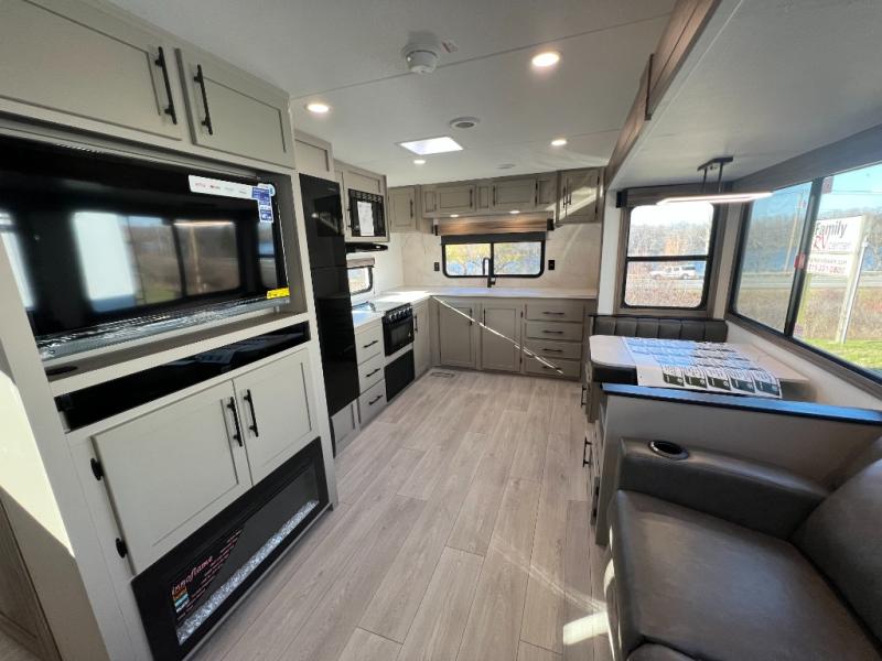 Pack your bags and head to the lake in this cozy travel trailer for five. Once you unload your gear from the pass-through storage, prepare a quick lunch on the mini outside kitchen with a griddle and relax under the patio awning. If the weather is raining on your parade, just head indoors to cook on the three burner cooktop, and you'll find ample counter space in this rear kitchen to set out drinks and sides. Your crew can relax on the hide-a-bed sofa and booth dinette within the large slide out, and there is an LED TV and a 34" fireplace for a more at-home atmosphere. One of your favorite features of this trailer will probably be the master suite with a king bed slide out, a dresser and an entertainment center, plus easy access to the front full bath. Here, you'll find dual bath sinks, a spacious shower, plus a walk-in closet with a closet rod to keep your outfits wrinkle free. There is even a wardrobe in the bedroom with washer and dryer prep so you can keep all those clothes fresh and clean!