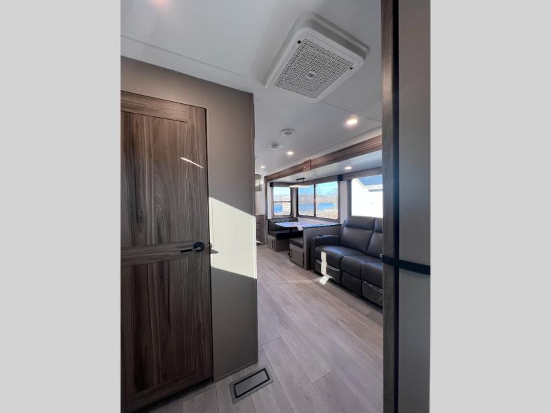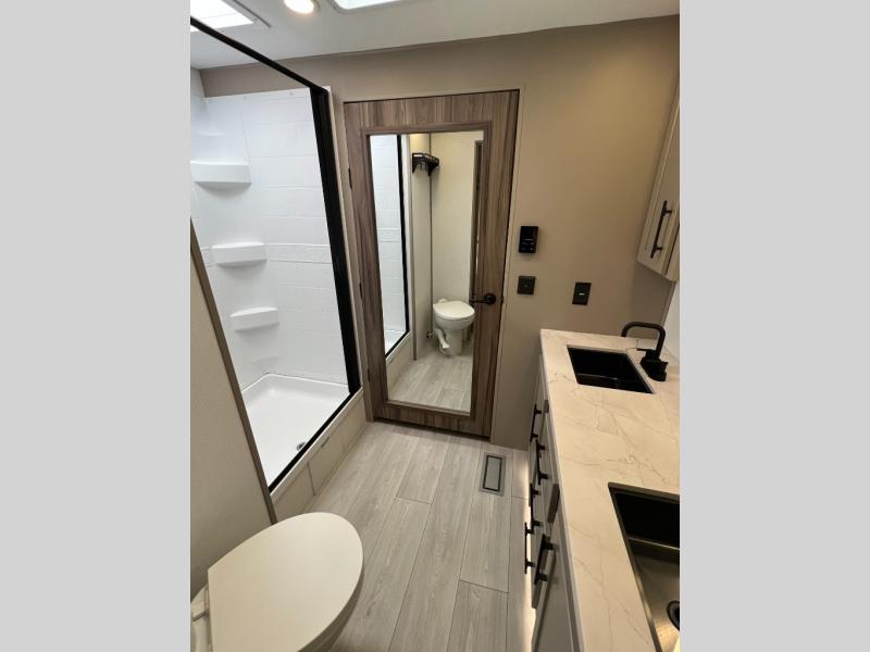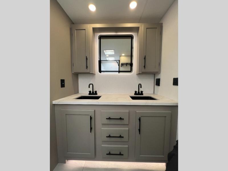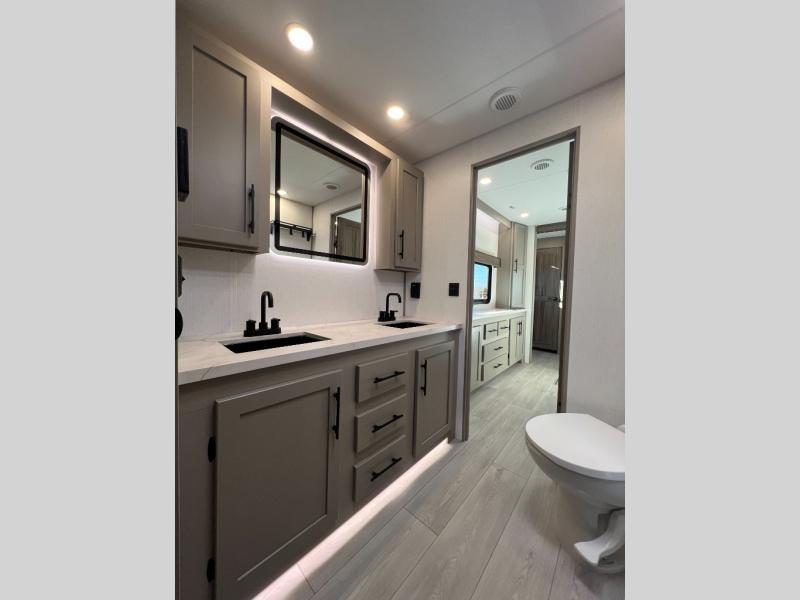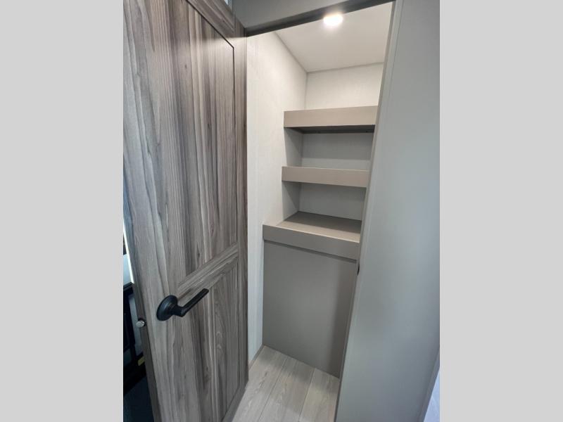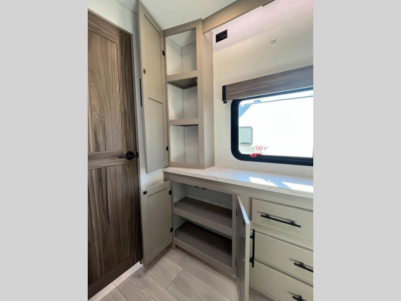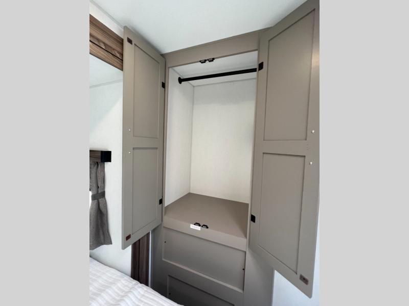 Pack your bags and head to the lake in this cozy travel trailer for five. Once you unload your gear from the pass-through storage, prepare a quick lunch on the mini outside kitchen with a griddle and relax under the patio awning. If the weather is raining on your parade, just head indoors to cook on the three burner cooktop, and you'll find ample counter space in this rear kitchen to set out drinks and sides. Your crew can relax on the hide-a-bed sofa and booth dinette within the large slide out, and there is an LED TV and a 34" fireplace for a more at-home atmosphere. One of your favorite features of this trailer will probably be the master suite with a king bed slide out, a dresser and an entertainment center, plus easy access to the front full bath. Here, you'll find dual bath sinks, a spacious shower, plus a walk-in closet with a closet rod to keep your outfits wrinkle free. There is even a wardrobe in the bedroom with washer and dryer prep so you can keep all those clothes fresh and clean!