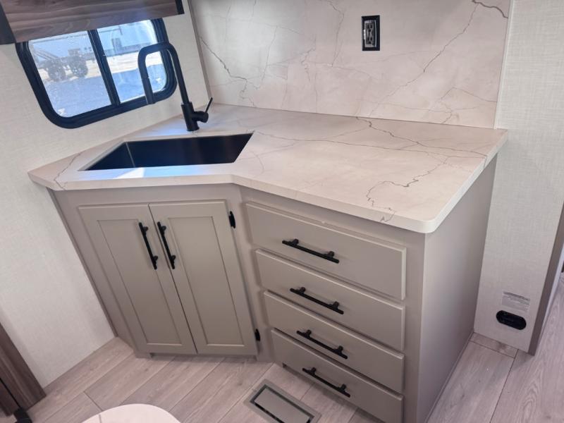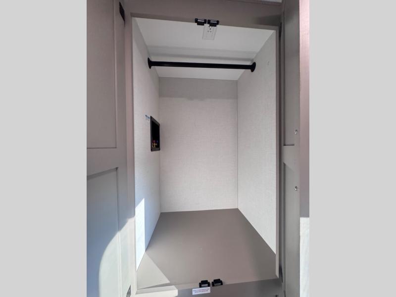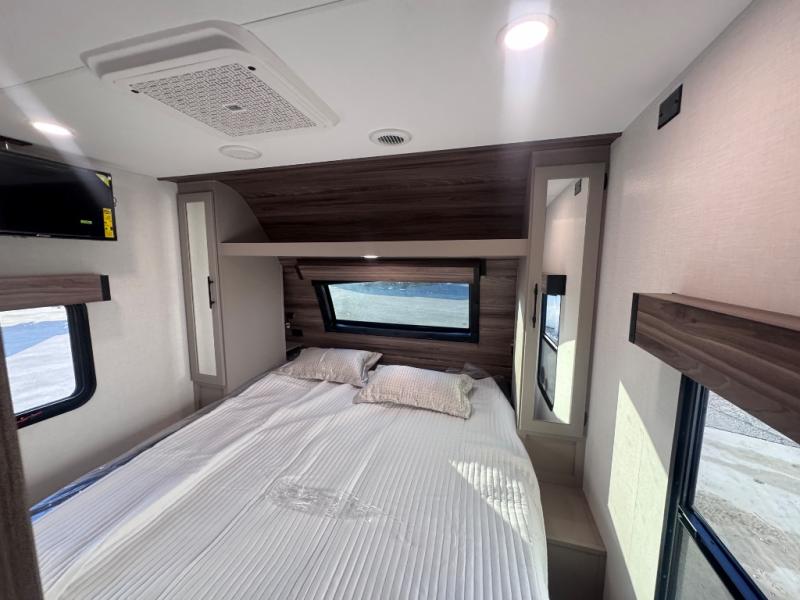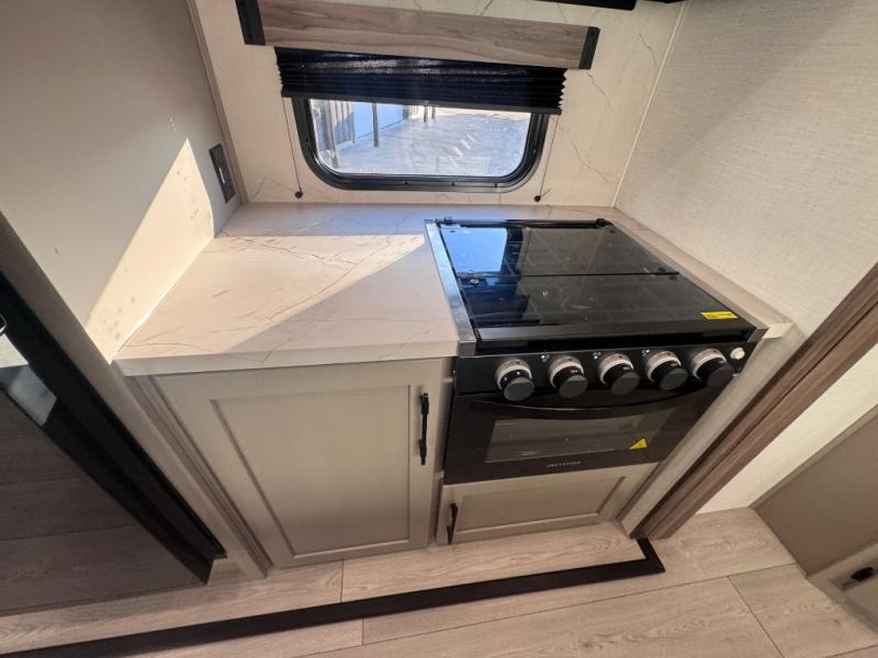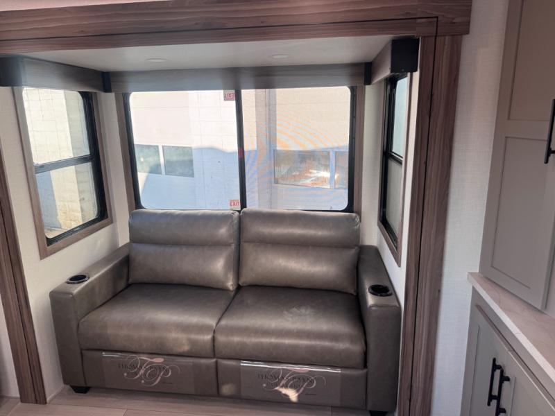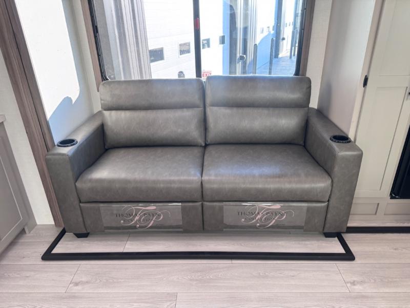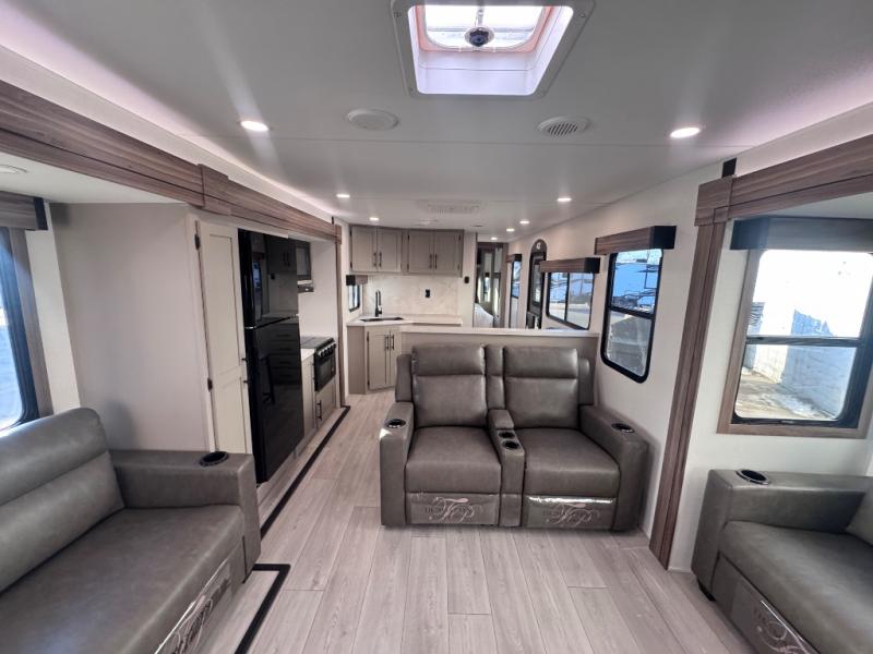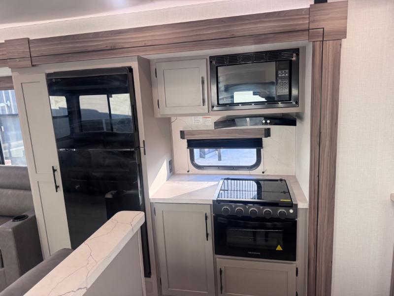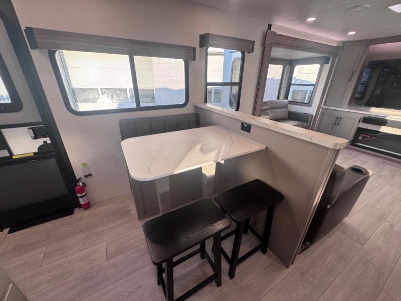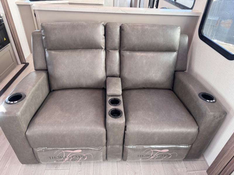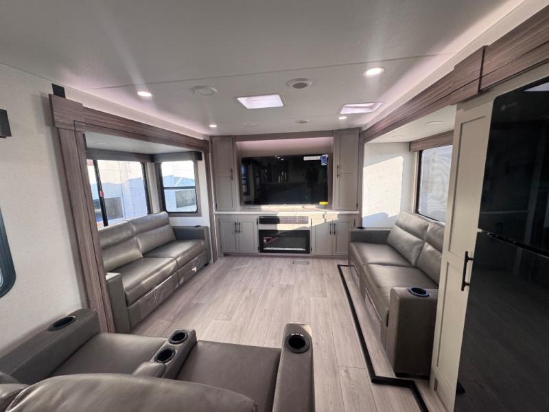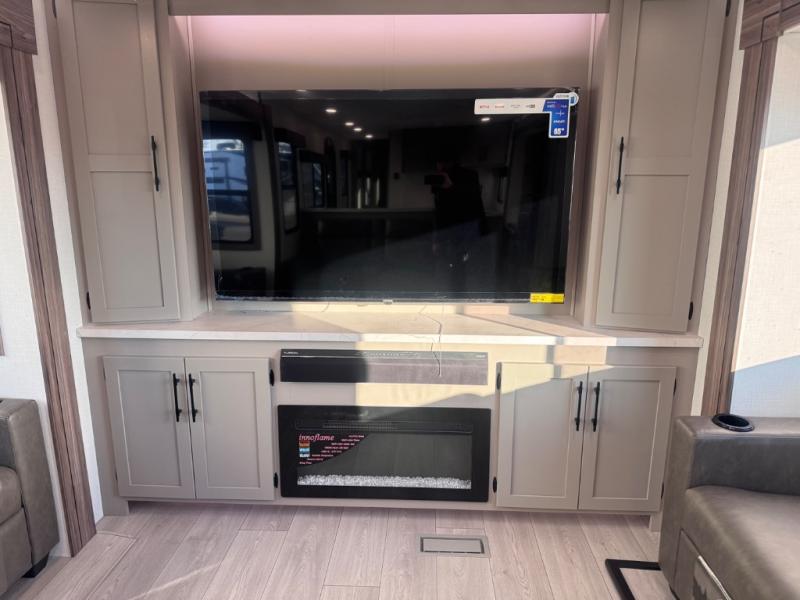 Head for the hills, lake, or woods in this spacious travel trailer. Once your gear is unloaded from the pass-through storage, set up the 19' power awning with LED lights and relax with a cold drink. Once you head inside you can make lunch on the three burner range and dine at the dinette that includes two chairs and bench seating. The rear living area includes a rear entertainment center with an LED TV and a 34" fireplace for a cozy atmosphere. There is also theater seating here and two 70" sofas within the dual opposing slides where your guests can sleep. And you will enjoy the front private bedroom with a king bed all to yourselves!
