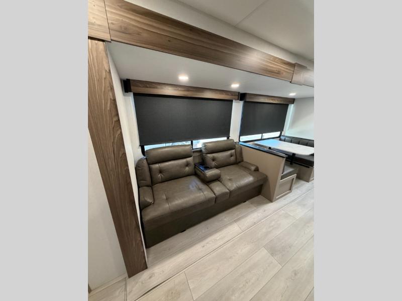 Your family will love this travel trailer. Sleep comfortably with your partner in the amazing queen bed situated in the front room, which has dual wardrobes perfect for storing your clothing. This unit is fitted with a full walk-through bathroom and a half bathroom in the rear part of the trailer, both ideal for refreshing yourself on a hot day. You can relax a little in the 70" sofa equipped with a 34" fireplace in front of it allowing you to enjoy a cozy atmosphere. You can also cook delicious meals in the incredible kitchen, fitted with a microwave, three cooktop burners, a walk-in pantry with coat hooks, a sink, a dinette, and a refrigerator, ideal for cooking any delicious dish. Finally, you will find an outdoor refrigerator and griddle excellent for cooking under the stars with your family, and a pass-through storage perfect for placing your stuff.