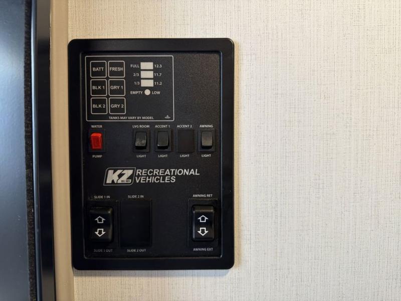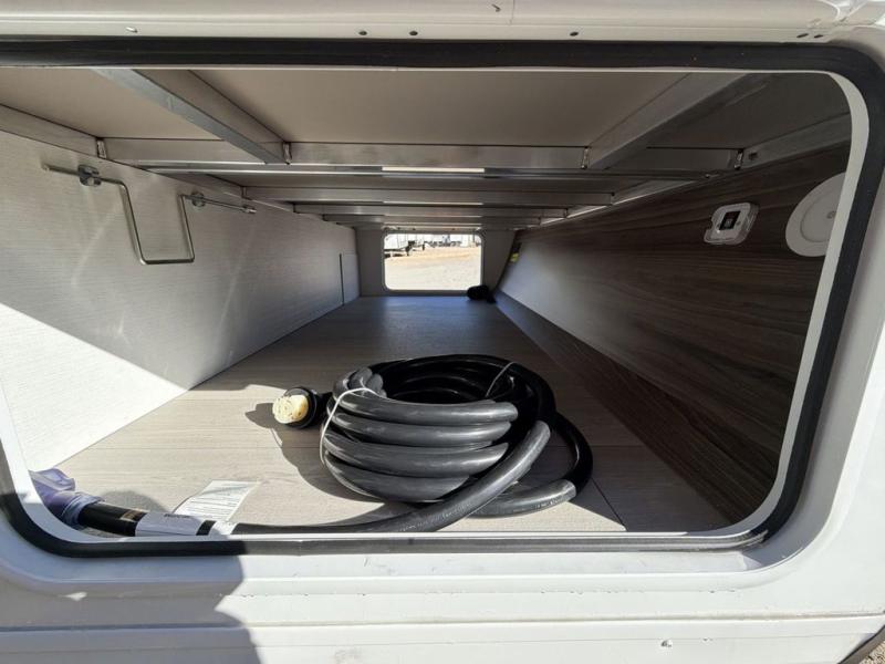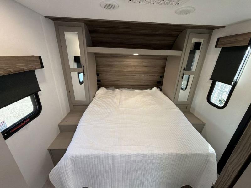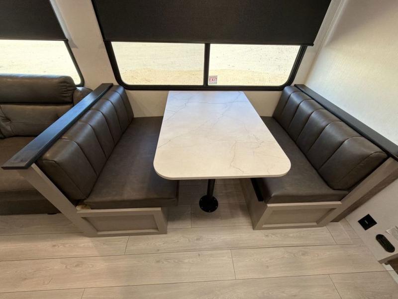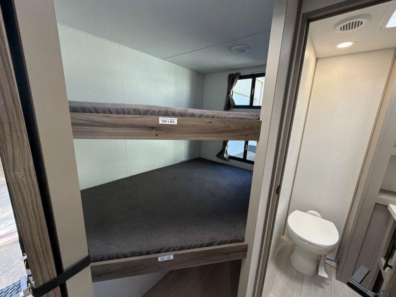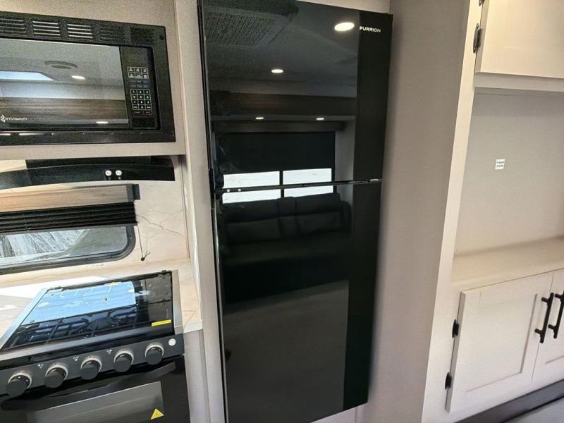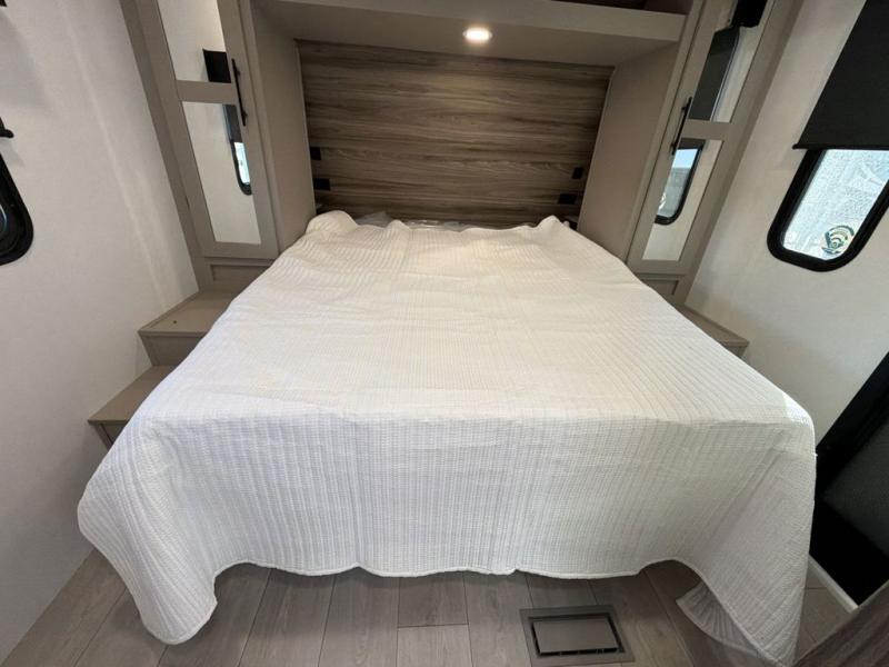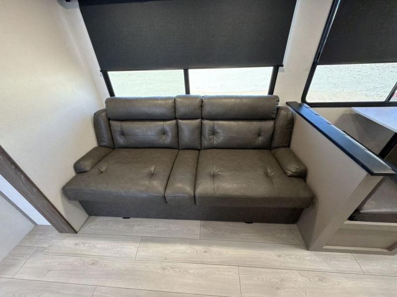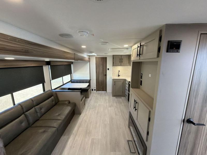 Your family will love this travel trailer. Sleep comfortably with your partner in the amazing queen bed situated in the front room, which has dual wardrobes perfect for storing your clothing. This unit is fitted with a full walk-through bathroom and a half bathroom in the rear part of the trailer, both ideal for refreshing yourself on a hot day. You can relax a little in the 70" sofa equipped with a 34" fireplace in front of it allowing you to enjoy a cozy atmosphere. You can also cook delicious meals in the incredible kitchen, fitted with a microwave, three cooktop burners, a walk-in pantry with coat hooks, a sink, a dinette, and a refrigerator, ideal for cooking any delicious dish. Finally, you will find an outdoor refrigerator and griddle excellent for cooking under the stars with your family, and a pass-through storage perfect for placing your stuff.