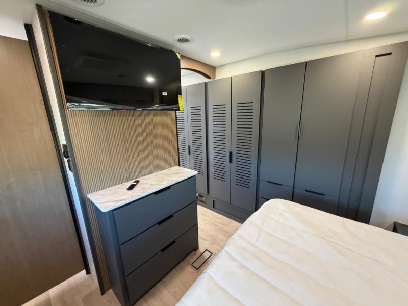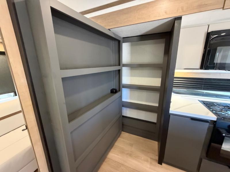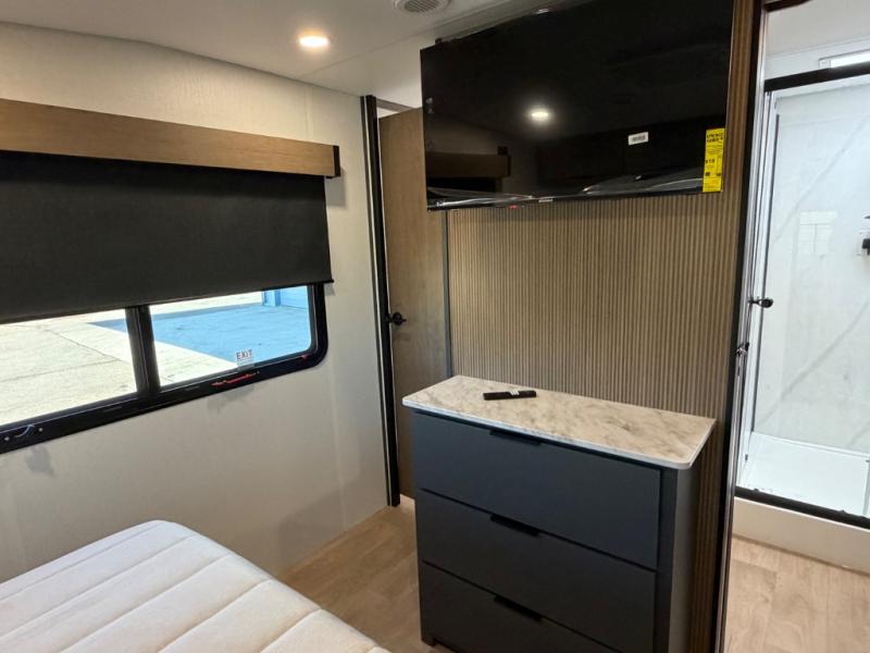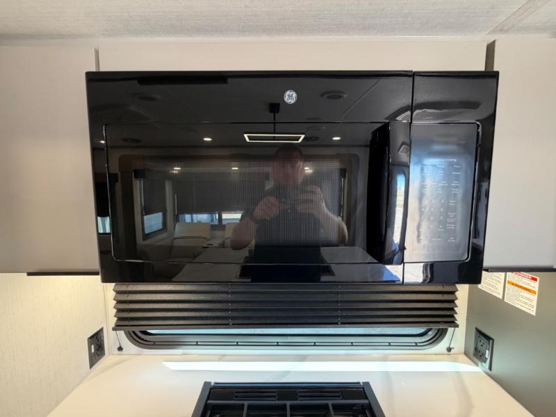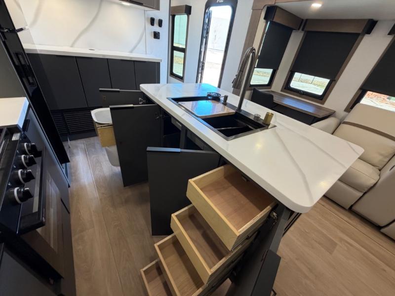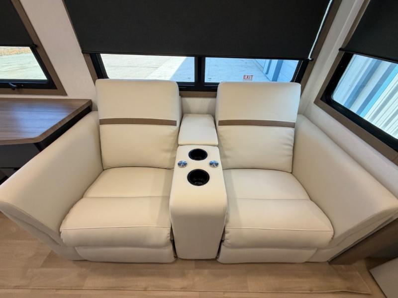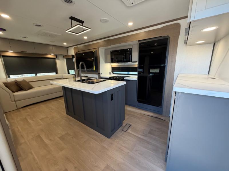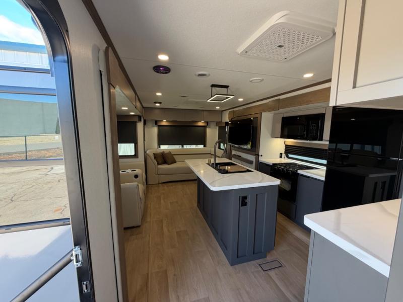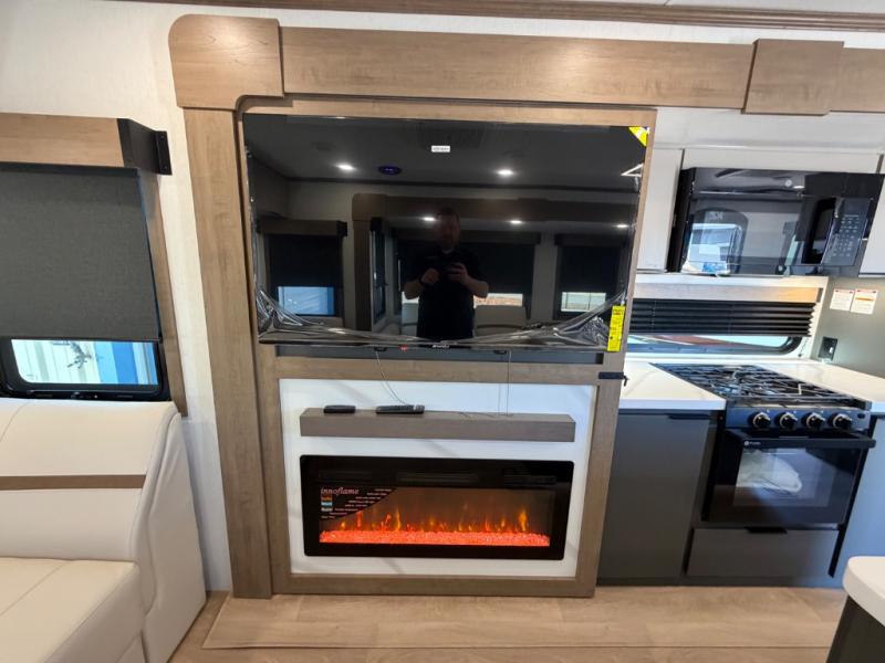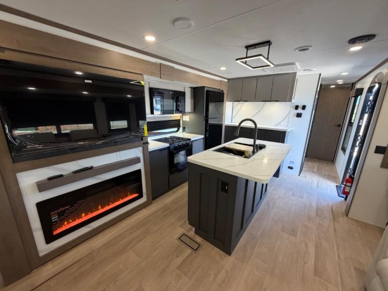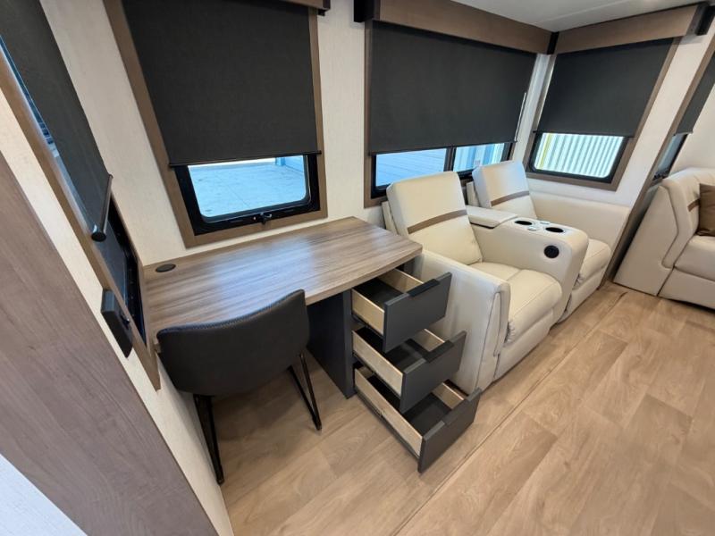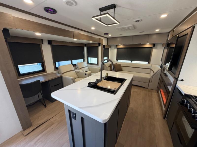 At the front, the private bedroom features a comfortable 60" x 80" queen bed, along with a wardrobe in a slide-out for expanded storage and a dresser across from the bed to keep clothing and essentials neatly organized. Moving down the hallway, you’ll find a full bathroom with a convenient double-entry design and a spacious 37" x 37" shower, allowing you to enjoy the comforts of home without relying on campground facilities. Toward the rear, the kitchen and living area open up with dual opposing slide-outs that create an inviting, open layout. One slide houses the full kitchen, complete with a cozy fireplace, swing-arm TV, a hidden pantry for dry goods, a 21" GE oven with a three-burner range, GE microwave with range hood, and a 10-cu. ft. 12V GE refrigerator. The central kitchen island with sink offers ample prep space and includes seating for casual dining. In the opposite slide, you’ll find a functional desk and 68" theater seating, while the rear features a large 90" hide-a-bed sofa that provides generous seating by day and a comfortable sleeping area for guests at night.