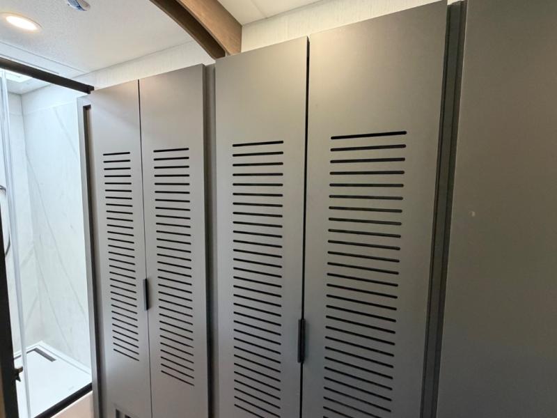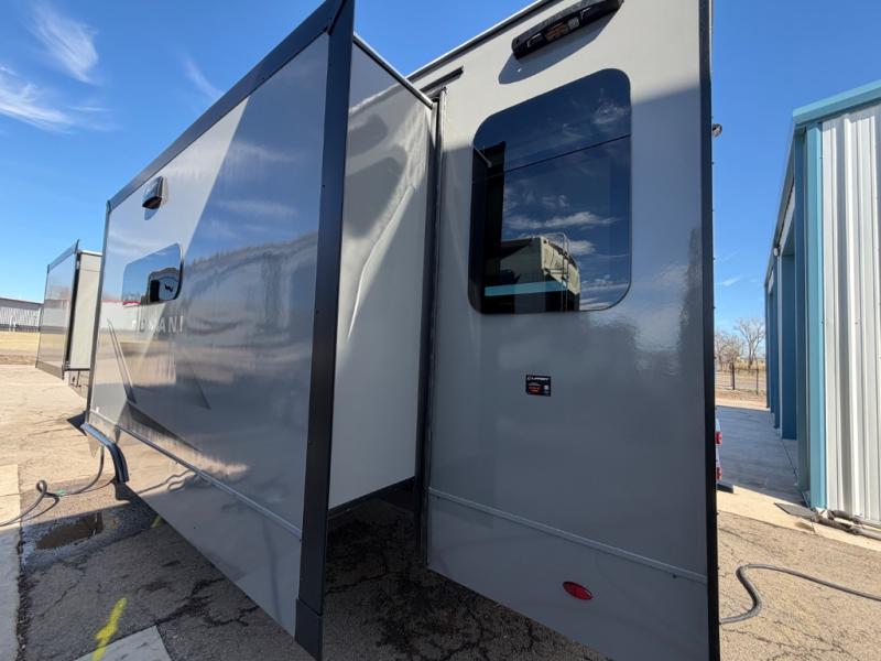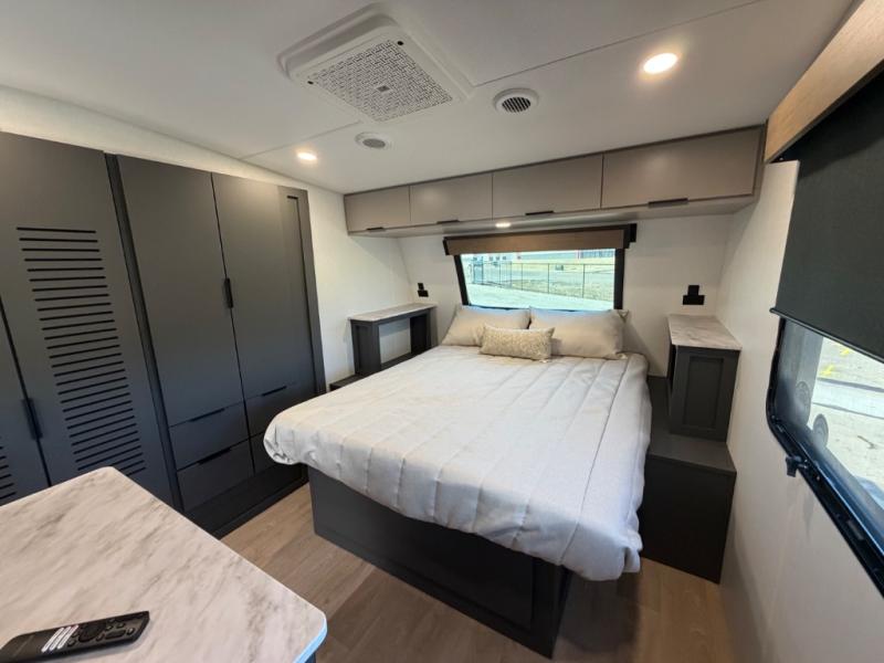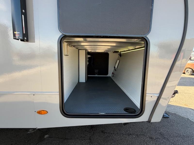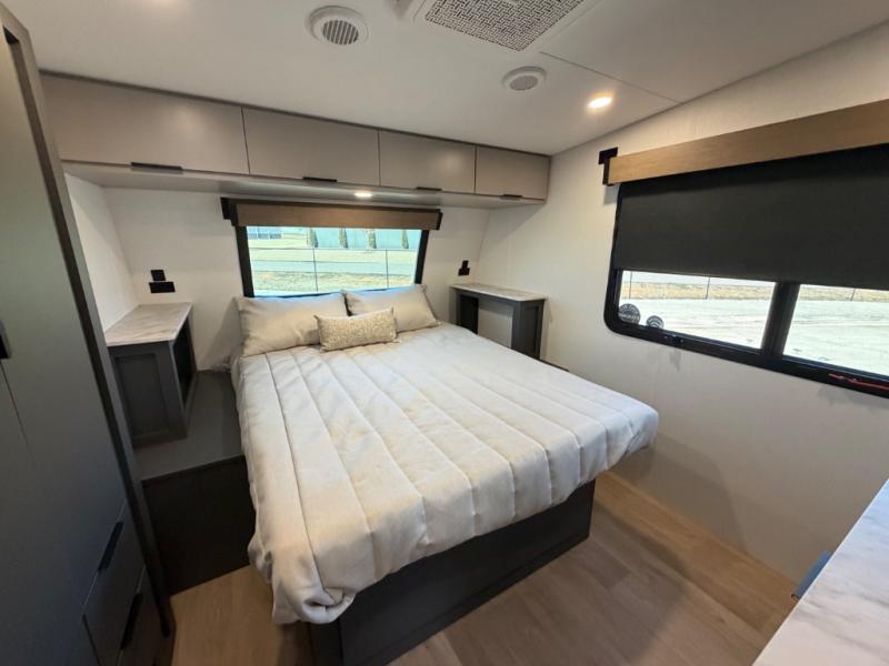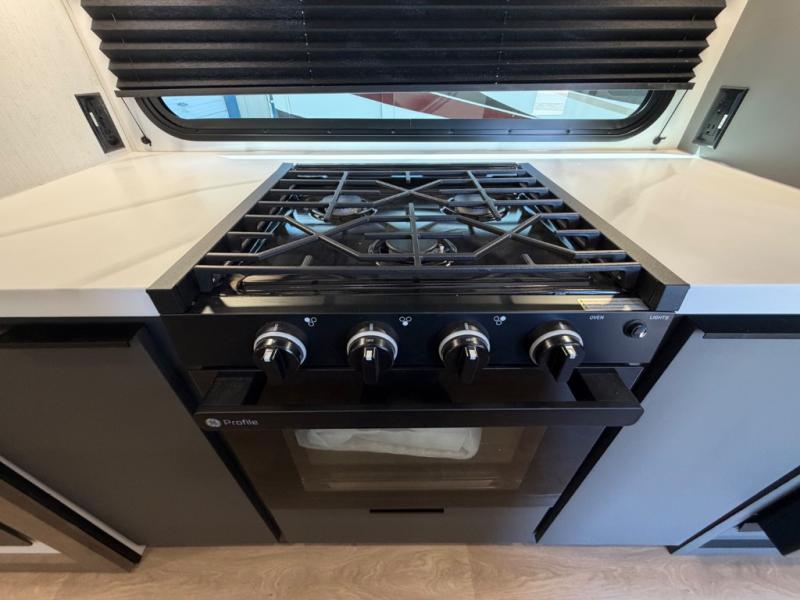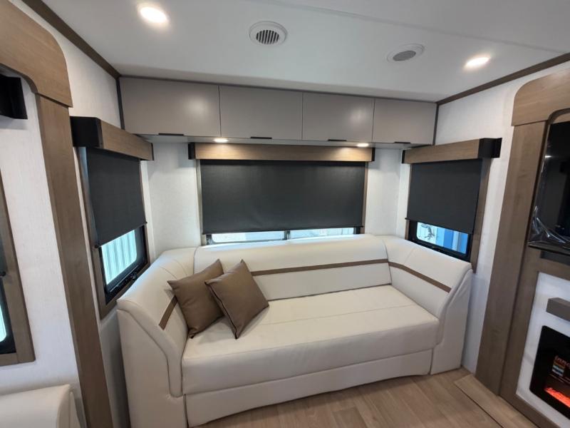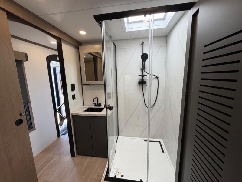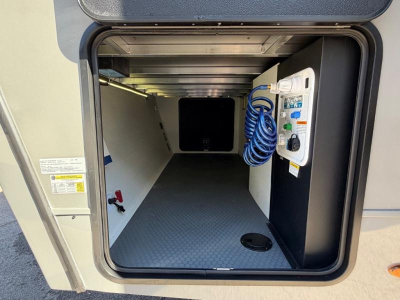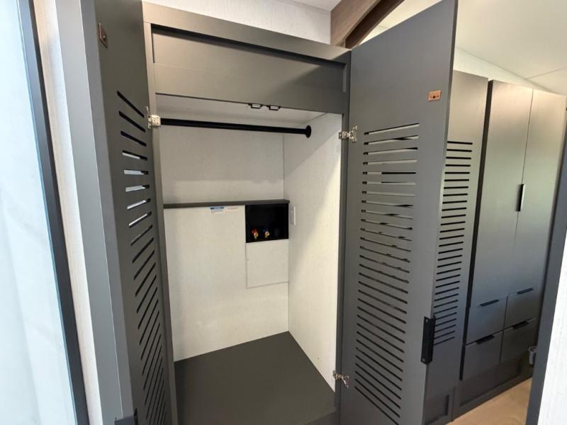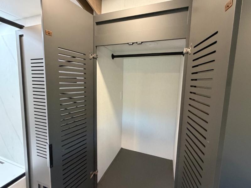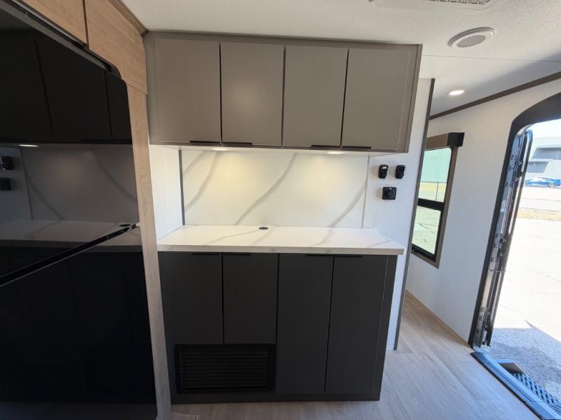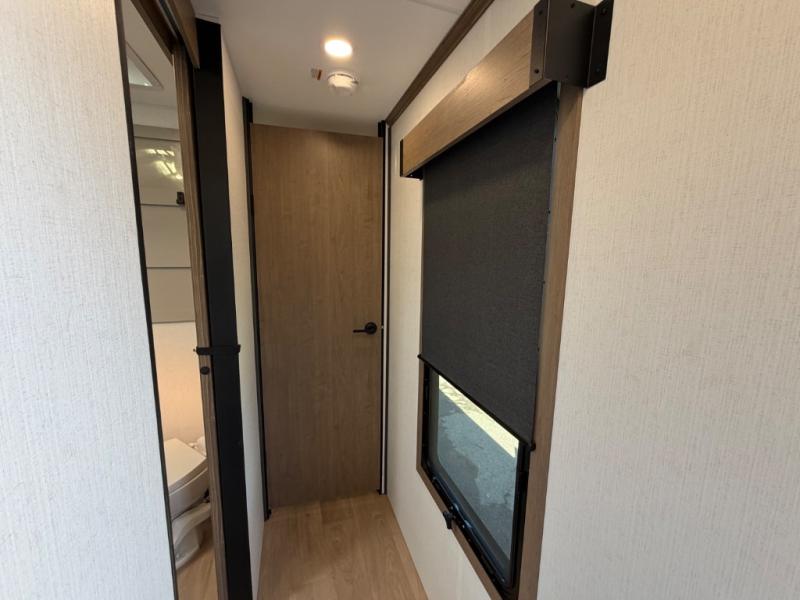 At the front, the private bedroom features a comfortable 60" x 80" queen bed, along with a wardrobe in a slide-out for expanded storage and a dresser across from the bed to keep clothing and essentials neatly organized. Moving down the hallway, you’ll find a full bathroom with a convenient double-entry design and a spacious 37" x 37" shower, allowing you to enjoy the comforts of home without relying on campground facilities. Toward the rear, the kitchen and living area open up with dual opposing slide-outs that create an inviting, open layout. One slide houses the full kitchen, complete with a cozy fireplace, swing-arm TV, a hidden pantry for dry goods, a 21" GE oven with a three-burner range, GE microwave with range hood, and a 10-cu. ft. 12V GE refrigerator. The central kitchen island with sink offers ample prep space and includes seating for casual dining. In the opposite slide, you’ll find a functional desk and 68" theater seating, while the rear features a large 90" hide-a-bed sofa that provides generous seating by day and a comfortable sleeping area for guests at night.