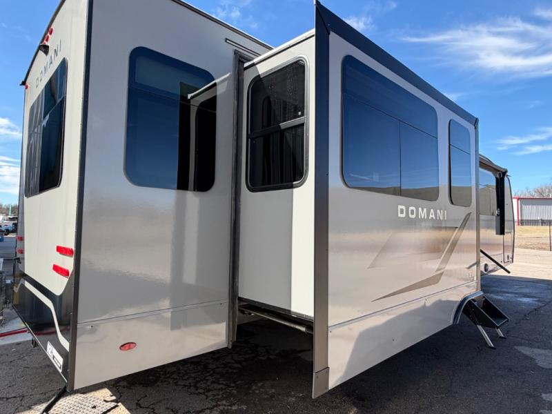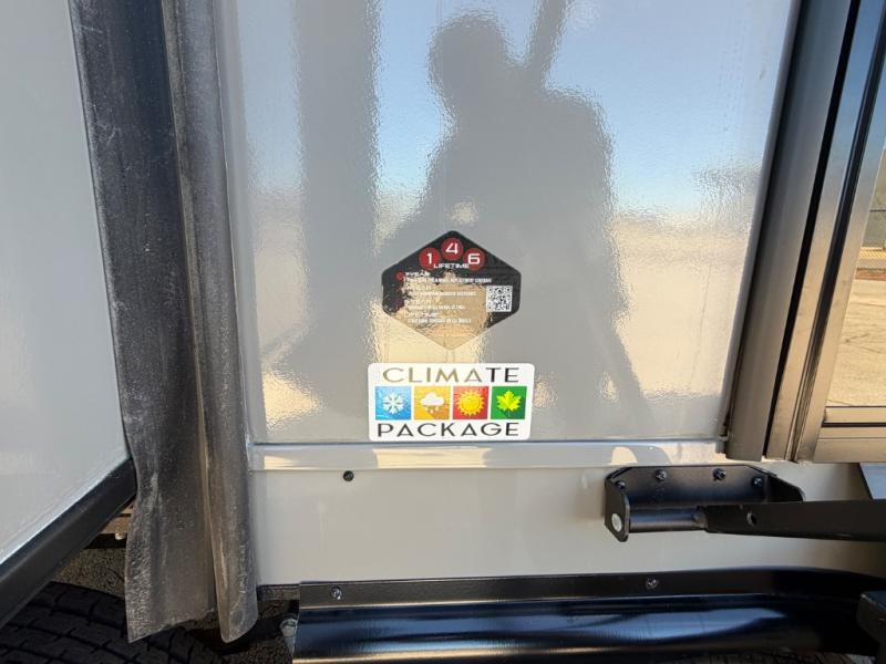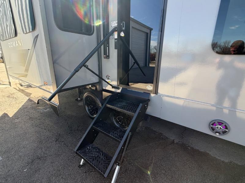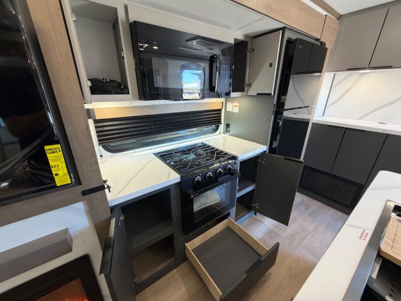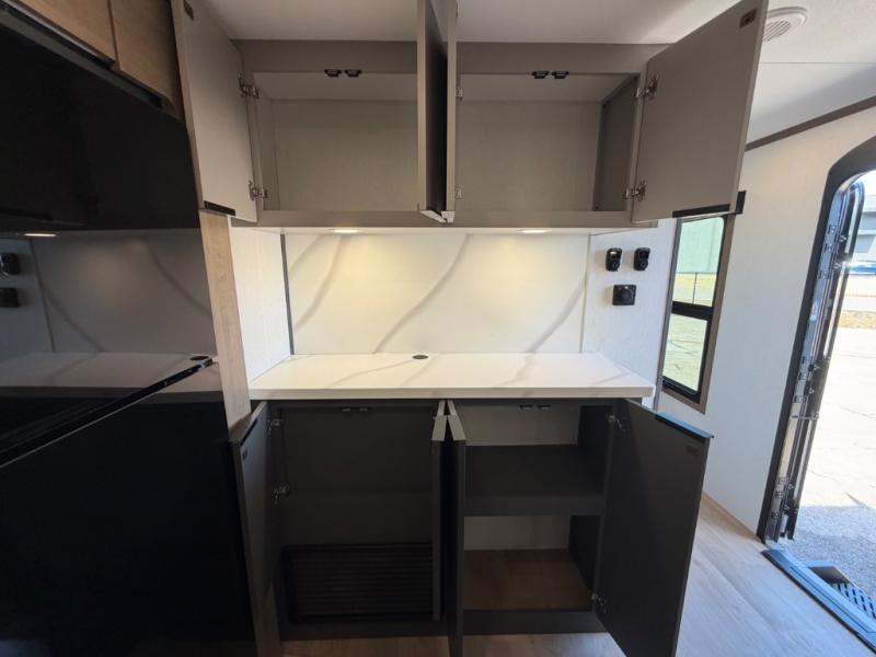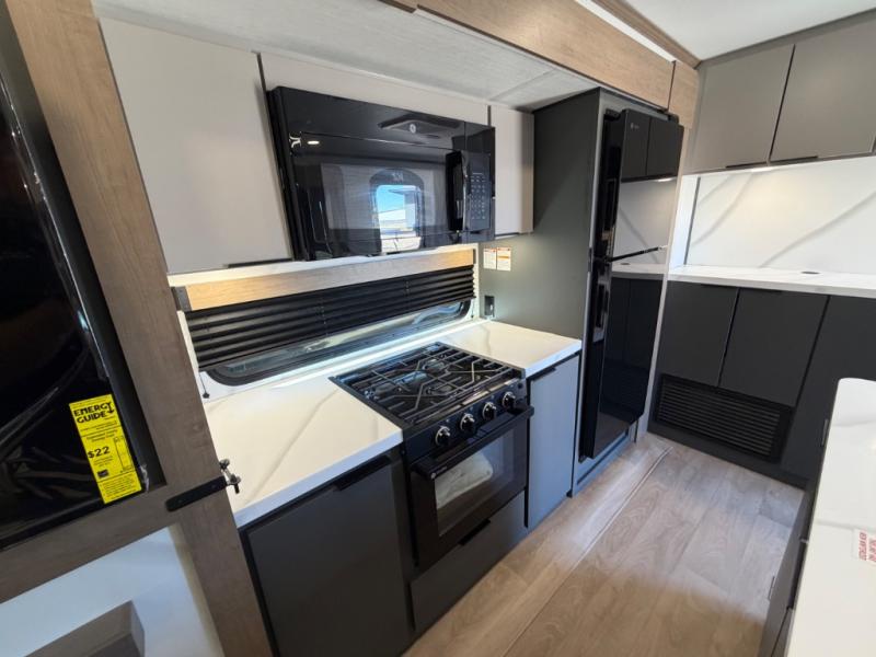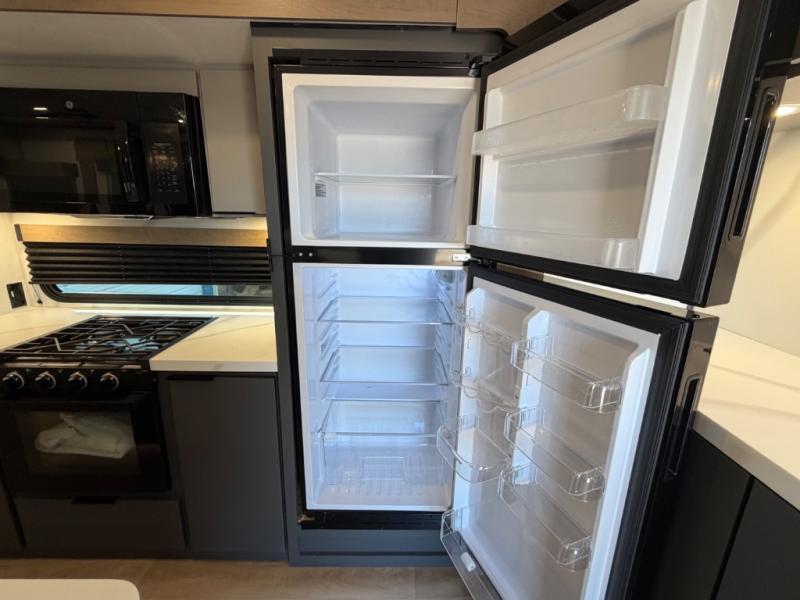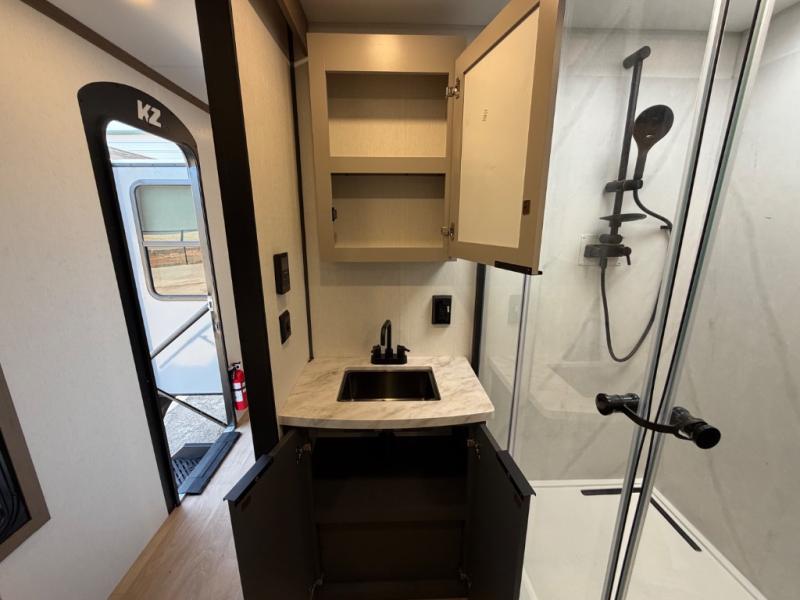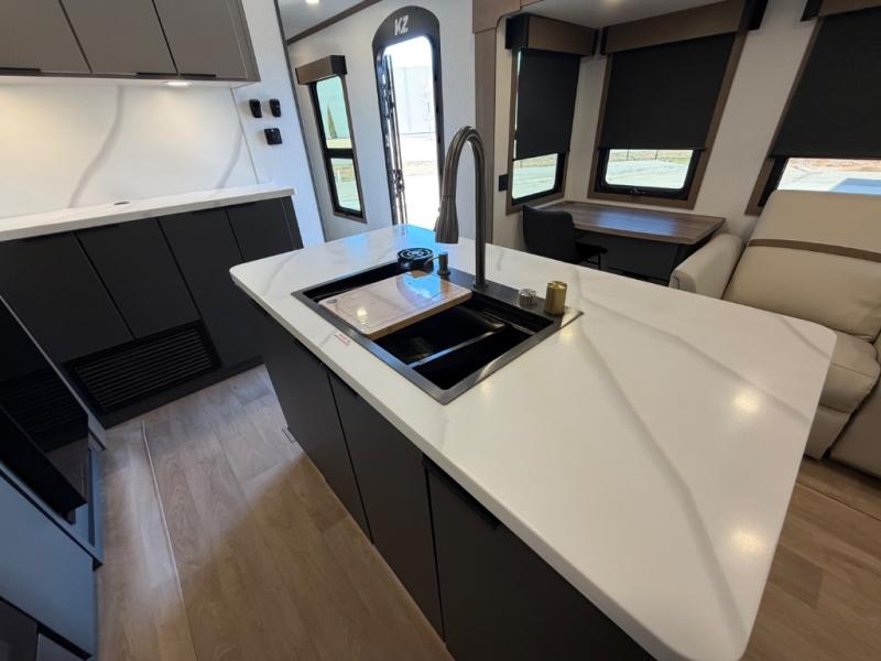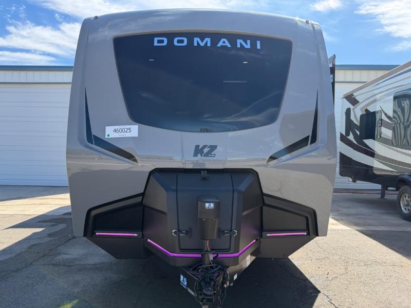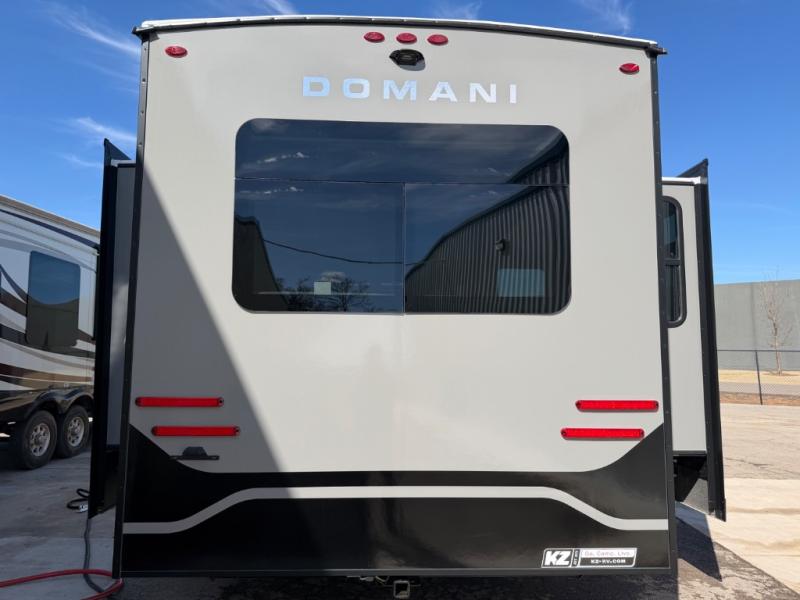 The KZ RV Domani travel trailers are built to deliver comfort and convenience on every trip, this trailer stands out with its durable aluminum framing and laminated sidewalls that provide long-lasting strength and stability. The Climate Insulation Package, featuring a heated, enclosed, and insulated underbelly, allows you to travel confidently in a variety of weather conditions. Inside, the spacious 10 cu. ft. 12V GE refrigerator offers ample room for groceries and extended stays, while the solid surface countertops paired with a deep undermount black stainless steel kitchen sink add a touch of residential-style luxury to your cooking space.