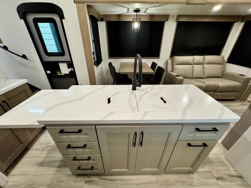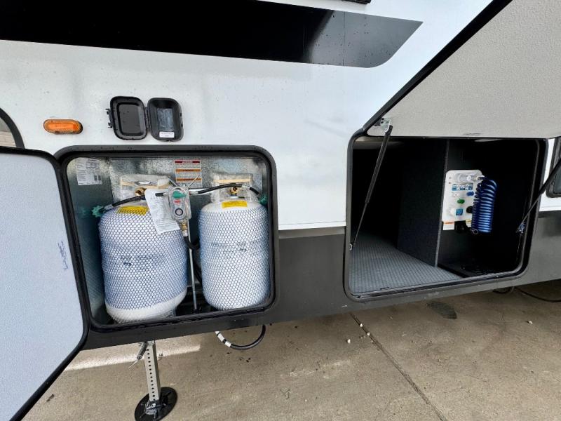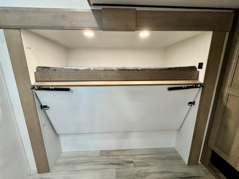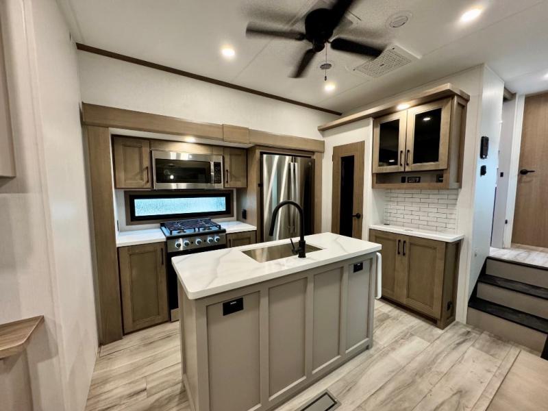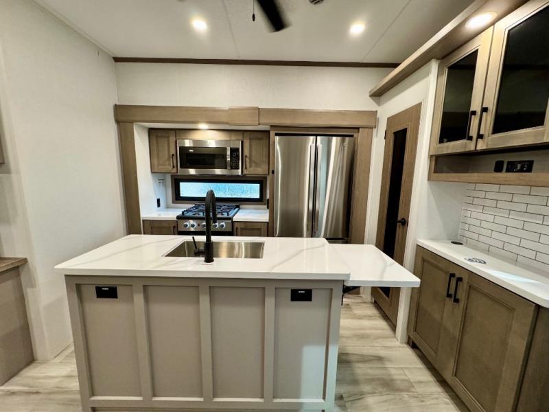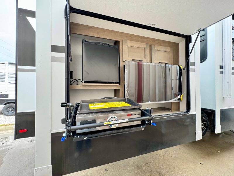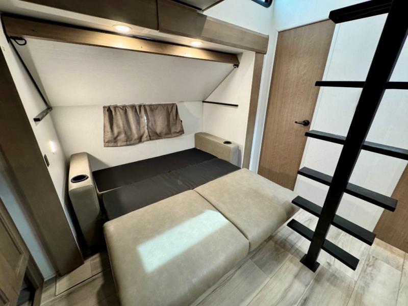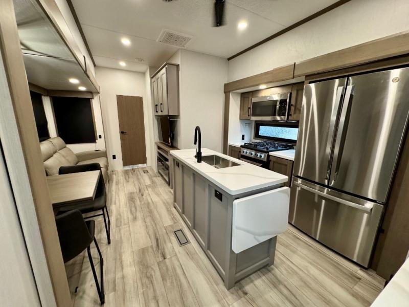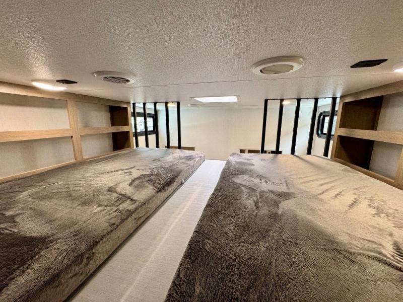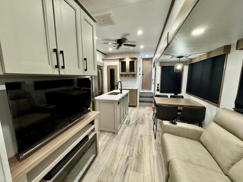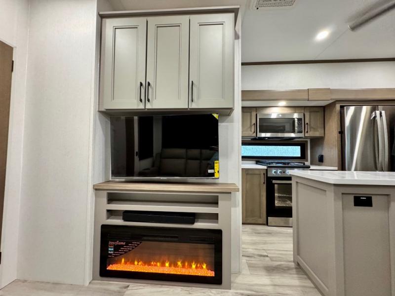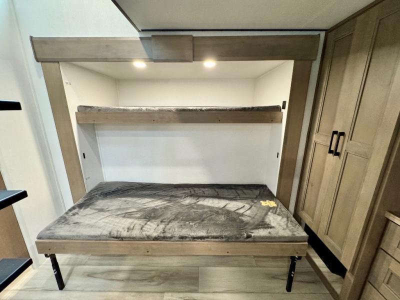 All of your friends and family can camp together in this fifth wheel! It features a rear private bunkhouse with a bunk above a hide-a-bed sofa, a full bathroom with a 30" x 36" shower, and an entertainment center with wardrobes on either side. There is also a folding bunk and a bunk over the outside kitchen. Across from the hide-a-bed sofa is an entertainment center with a 40" fireplace and a 43" smart TV to watch your favorite movies at night. The kitchen island will allow you to cook with ease and you can prepare your best meals with the four burner range with a 24" oven. The second bathroom has a residential shower with a seat and a linen closet to keep your towel close. Enjoy a good night's rest on the king bed slide in the front private bedroom which also has a dresser and a front wardrobe with washer and dryer prep!