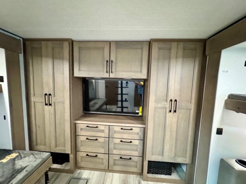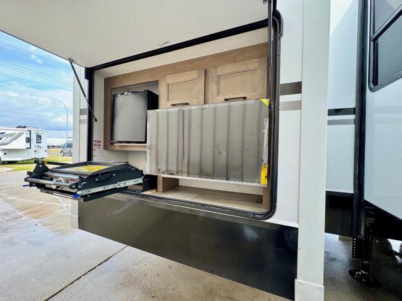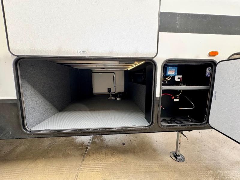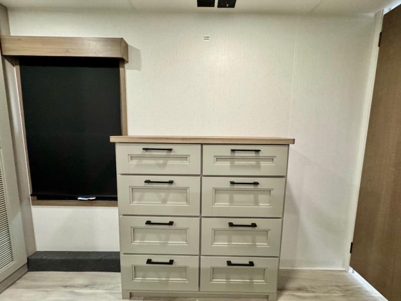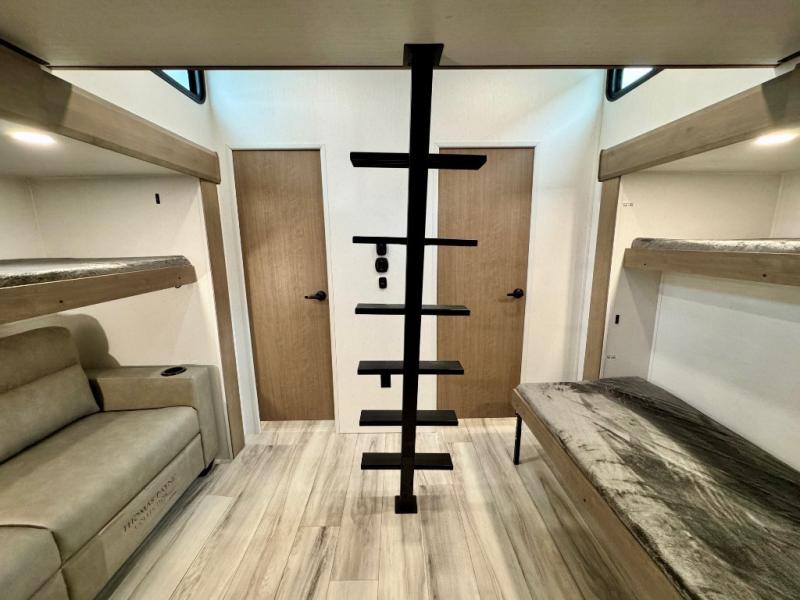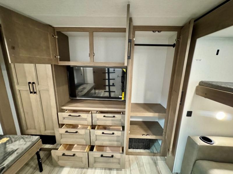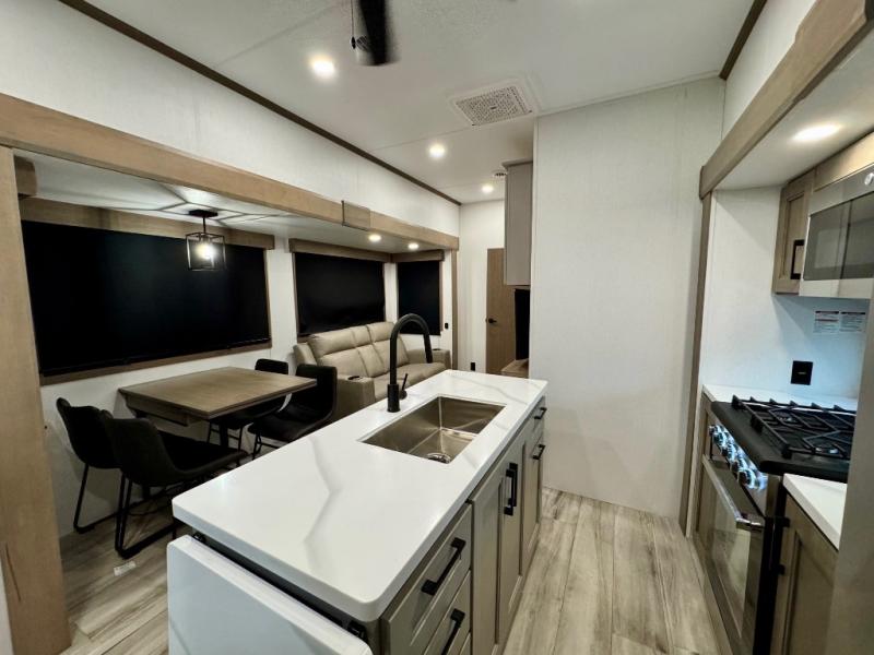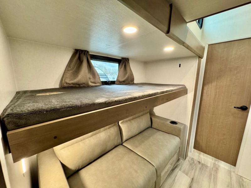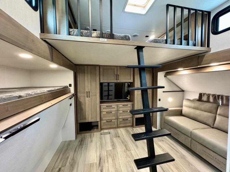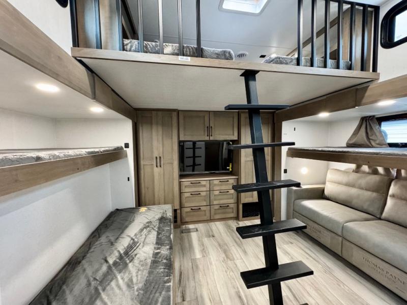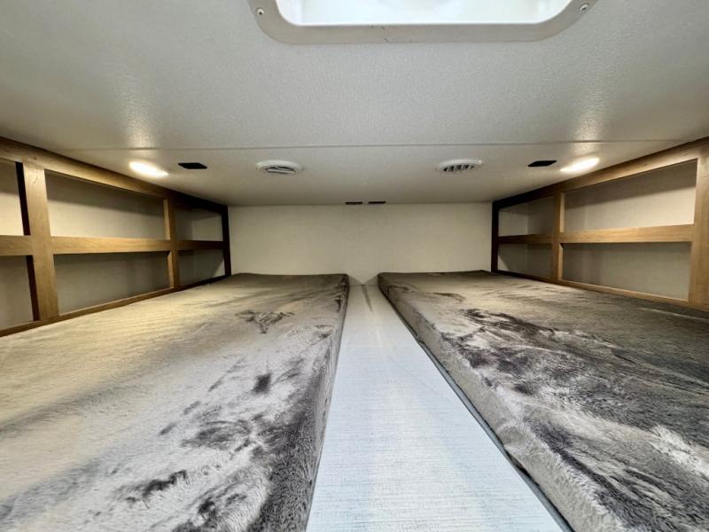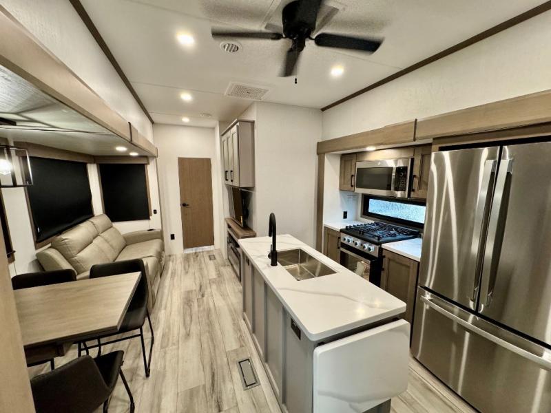 All of your friends and family can camp together in this fifth wheel! It features a rear private bunkhouse with a bunk above a hide-a-bed sofa, a full bathroom with a 30" x 36" shower, and an entertainment center with wardrobes on either side. There is also a folding bunk and a bunk over the outside kitchen. Across from the hide-a-bed sofa is an entertainment center with a 40" fireplace and a 43" smart TV to watch your favorite movies at night. The kitchen island will allow you to cook with ease and you can prepare your best meals with the four burner range with a 24" oven. The second bathroom has a residential shower with a seat and a linen closet to keep your towel close. Enjoy a good night's rest on the king bed slide in the front private bedroom which also has a dresser and a front wardrobe with washer and dryer prep!