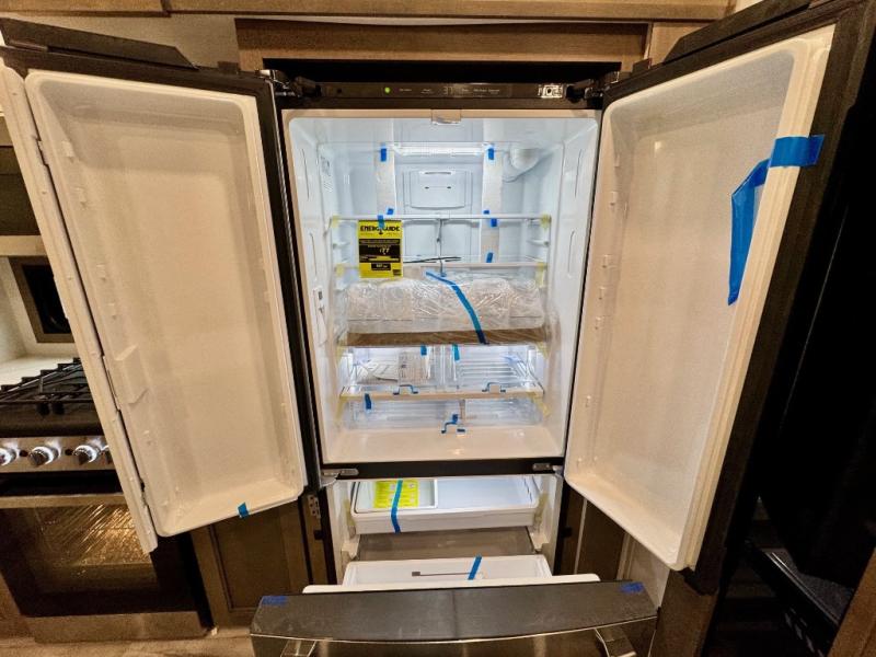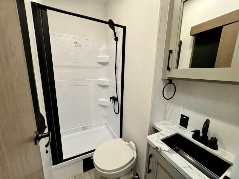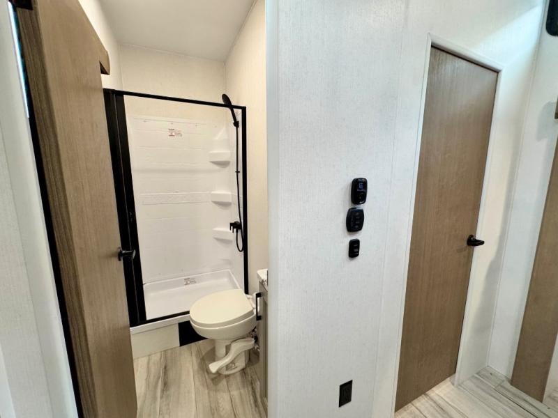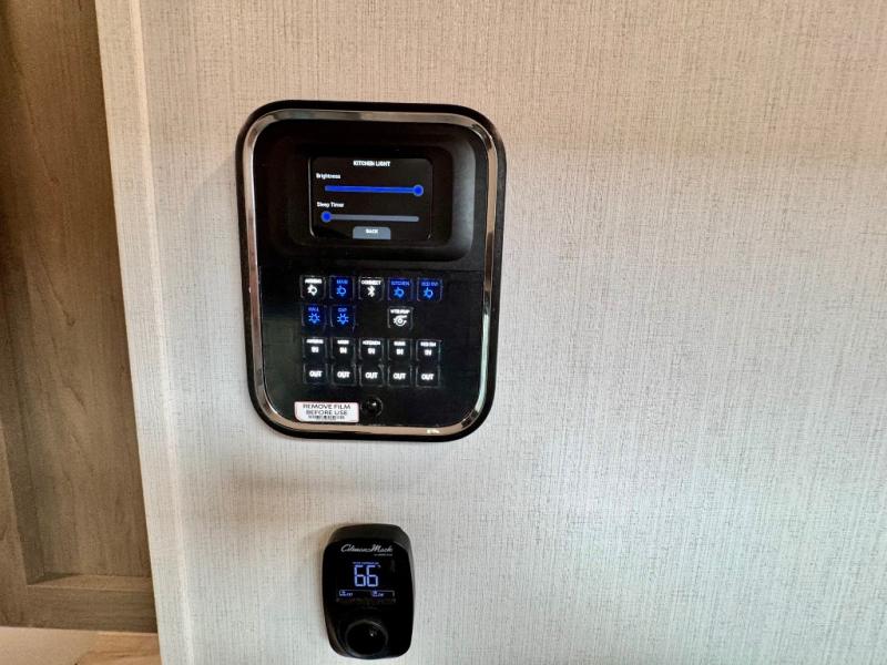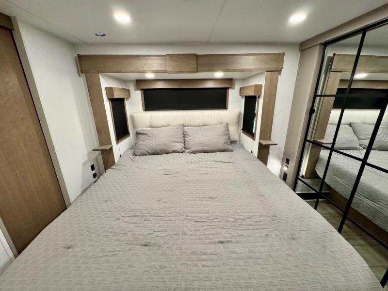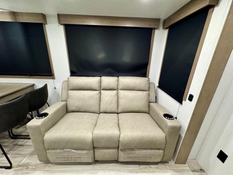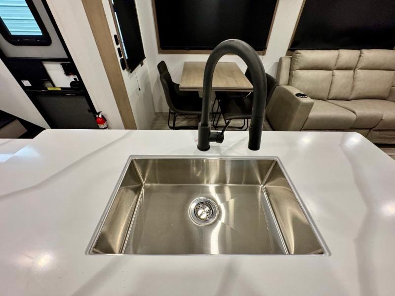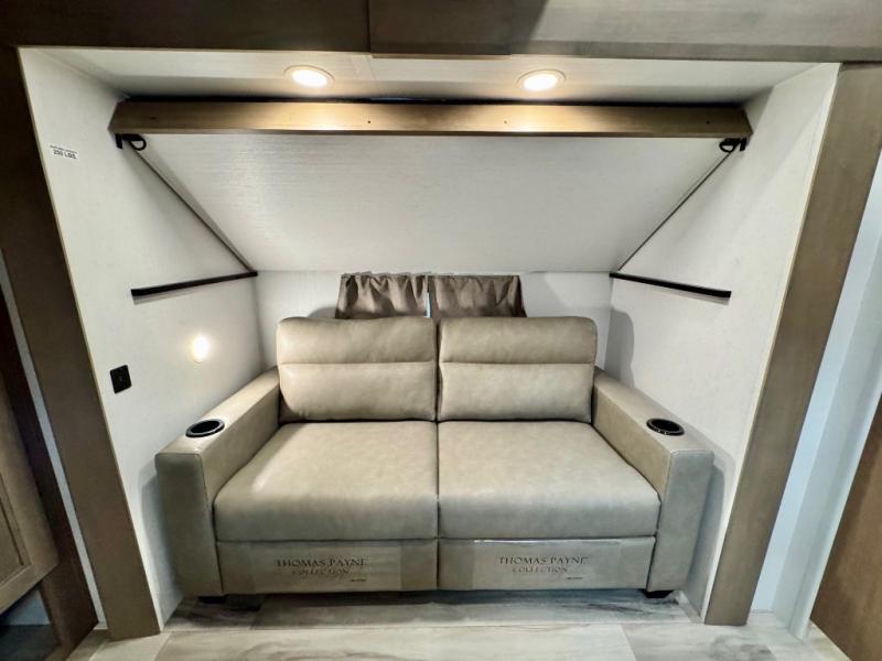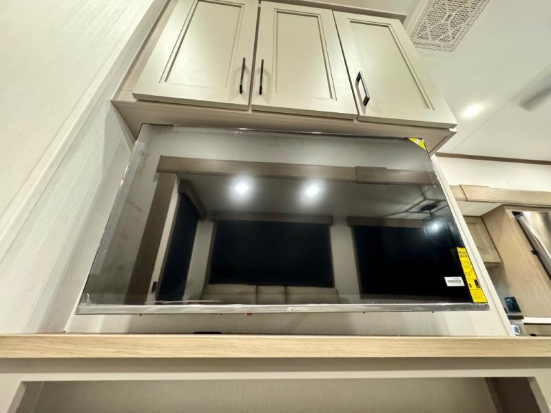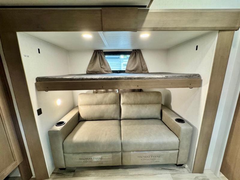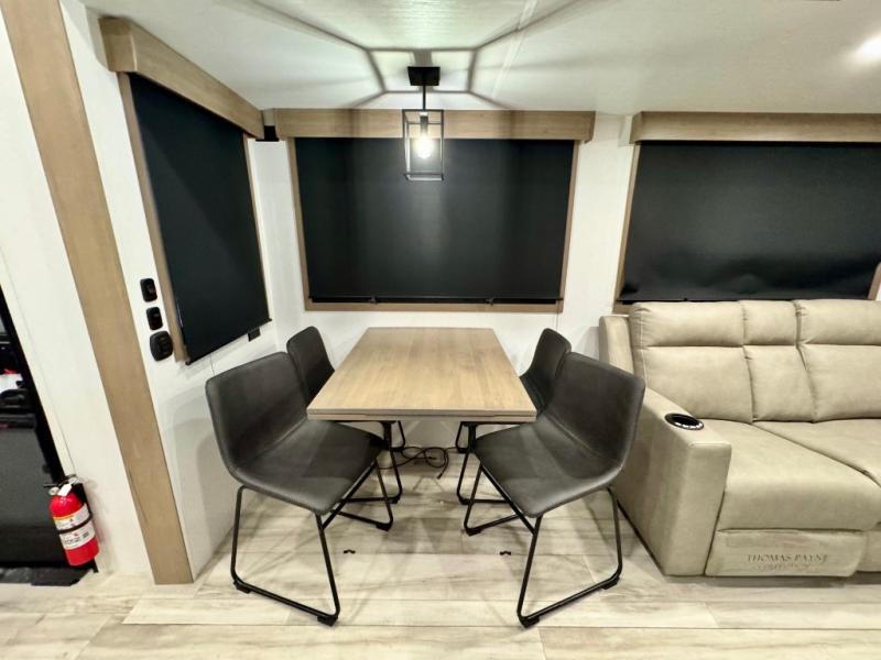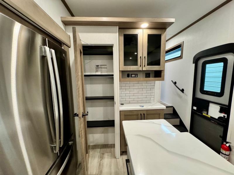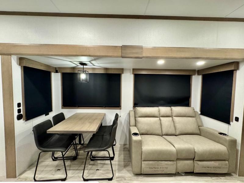 All of your friends and family can camp together in this fifth wheel! It features a rear private bunkhouse with a bunk above a hide-a-bed sofa, a full bathroom with a 30" x 36" shower, and an entertainment center with wardrobes on either side. There is also a folding bunk and a bunk over the outside kitchen. Across from the hide-a-bed sofa is an entertainment center with a 40" fireplace and a 43" smart TV to watch your favorite movies at night. The kitchen island will allow you to cook with ease and you can prepare your best meals with the four burner range with a 24" oven. The second bathroom has a residential shower with a seat and a linen closet to keep your towel close. Enjoy a good night's rest on the king bed slide in the front private bedroom which also has a dresser and a front wardrobe with washer and dryer prep!