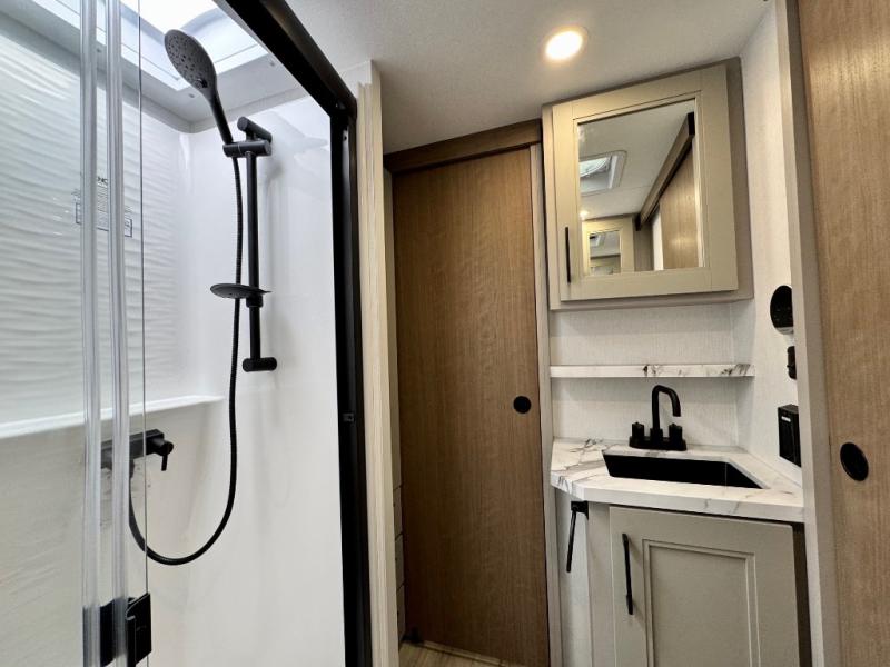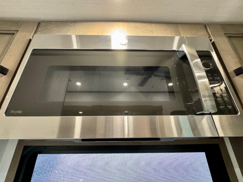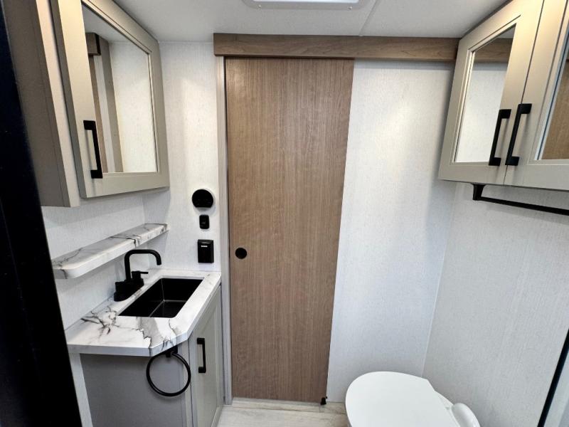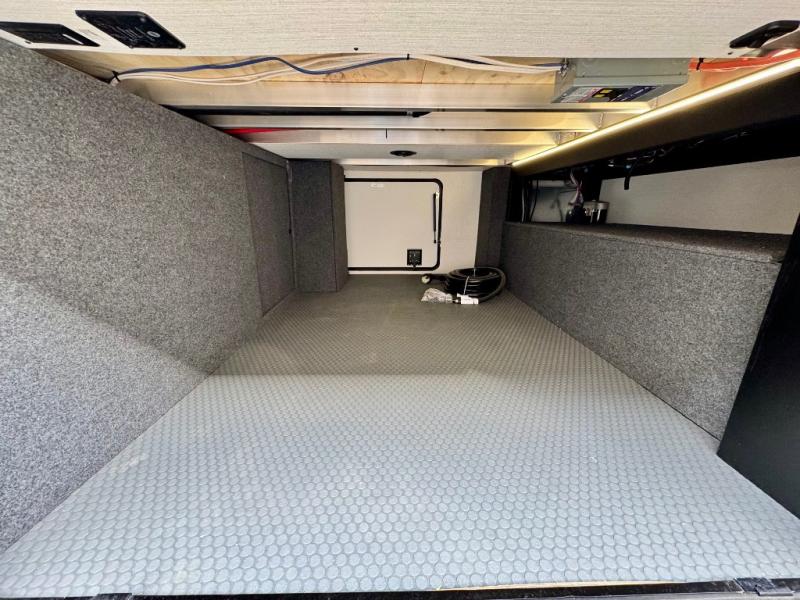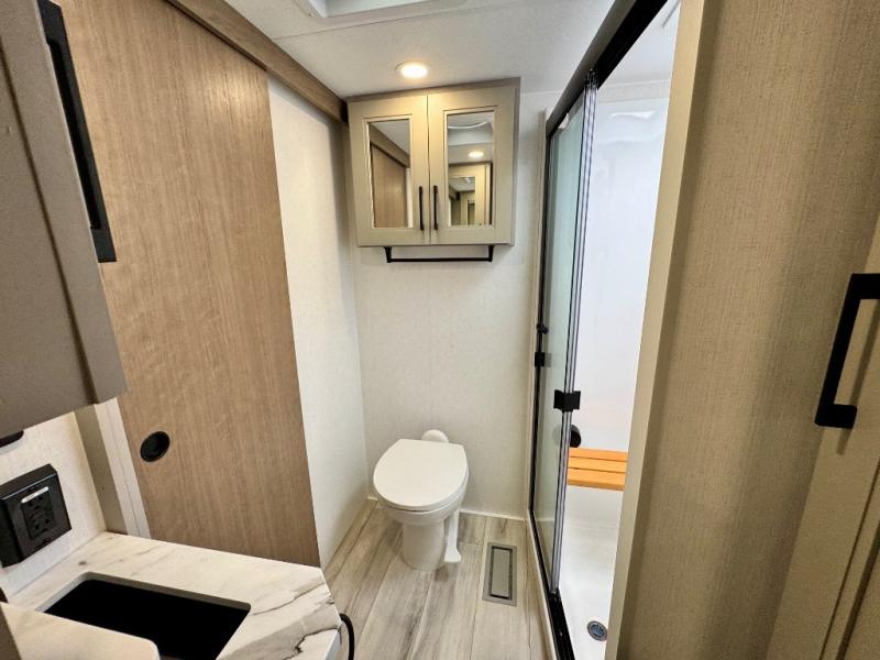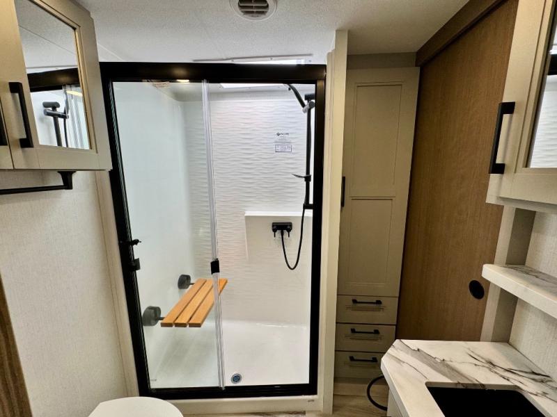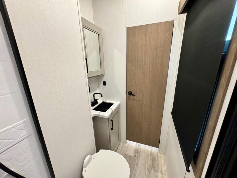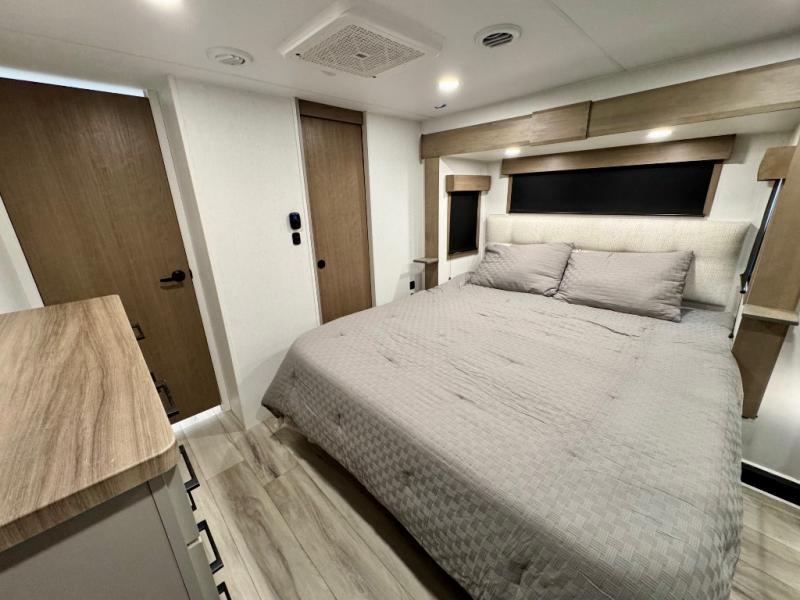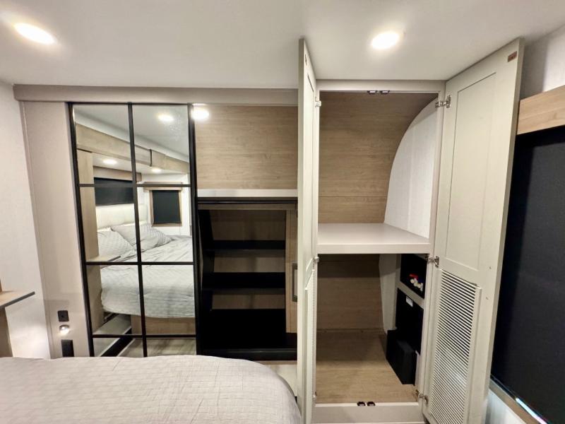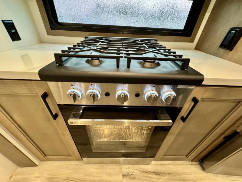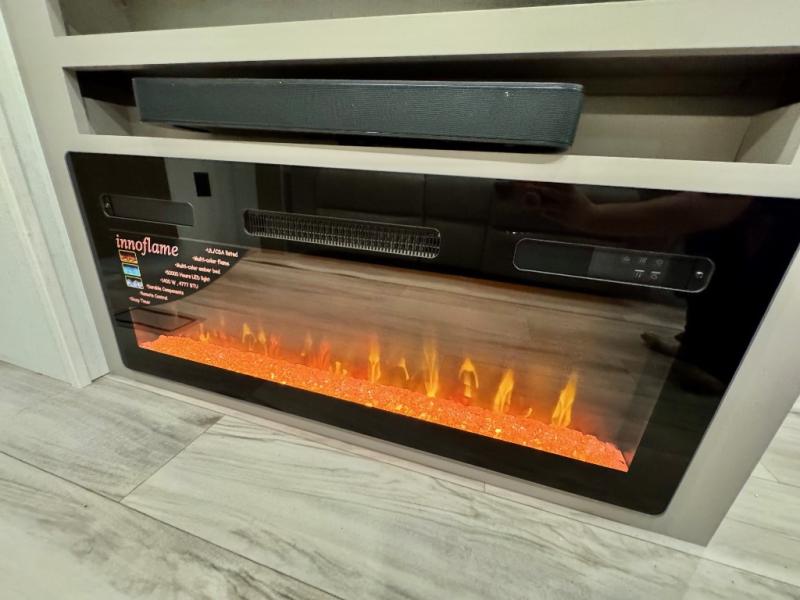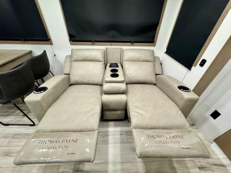 All of your friends and family can camp together in this fifth wheel! It features a rear private bunkhouse with a bunk above a hide-a-bed sofa, a full bathroom with a 30" x 36" shower, and an entertainment center with wardrobes on either side. There is also a folding bunk and a bunk over the outside kitchen. Across from the hide-a-bed sofa is an entertainment center with a 40" fireplace and a 43" smart TV to watch your favorite movies at night. The kitchen island will allow you to cook with ease and you can prepare your best meals with the four burner range with a 24" oven. The second bathroom has a residential shower with a seat and a linen closet to keep your towel close. Enjoy a good night's rest on the king bed slide in the front private bedroom which also has a dresser and a front wardrobe with washer and dryer prep!