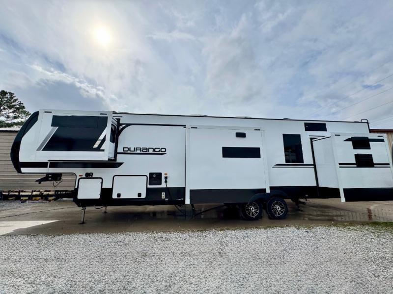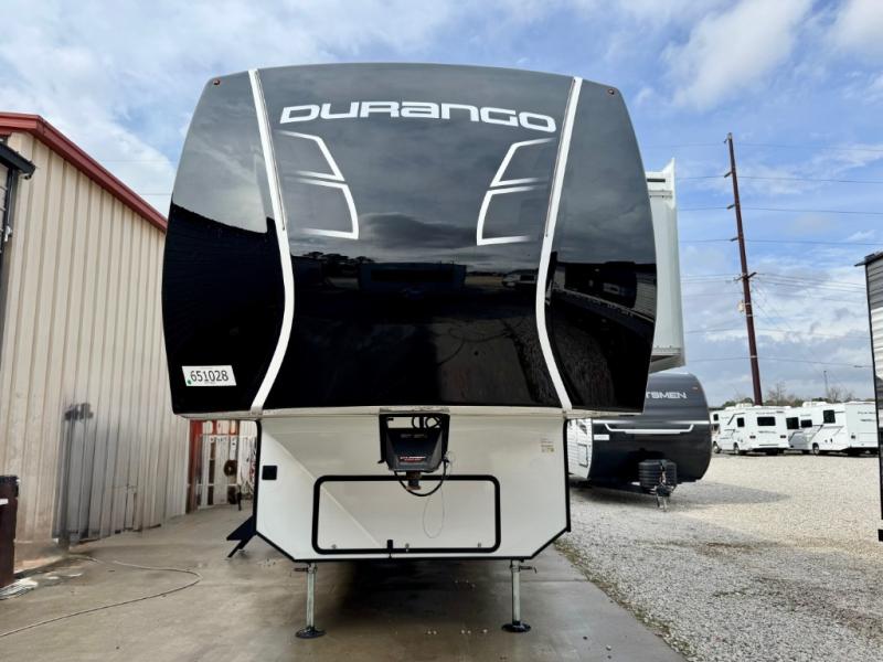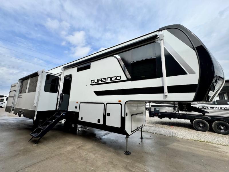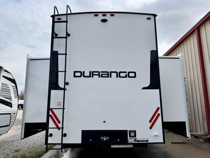 Enjoy full time living, an affordable price, and a wide body construction for more living space with every one of these KZ Durango light high-profile fifth wheels! These luxury units can be used all year round with the all-weather insulation package, the 3" x 14" foam-core in-floor straight-line heating system with a 35,000 BTU furnace, and the 15,000 BTU ducted roof A/C which optimizes the airflow by an average of 40% for better performance, cooling time, and reduction of noise. A few other construction features you will appreciate include a one piece, seamless walk-on Tufflex roofing material, Pex® in-floor heated waterlines, and a Lamilux® gelcoat fiberglass exterior. Inside, blancher maple & morel fog cabinetry , a king size bed, and smart TVs will have you feeling like you never left home!