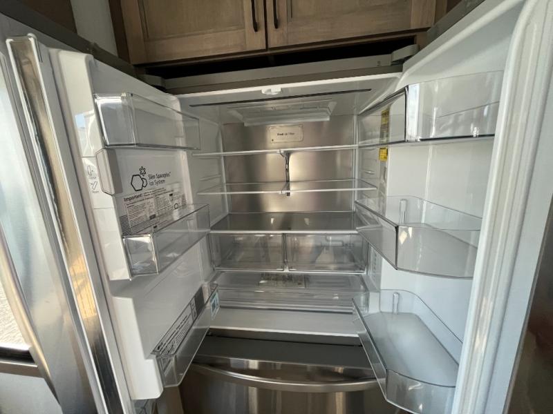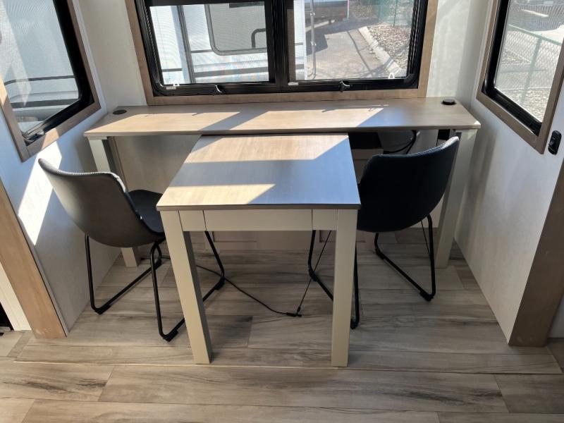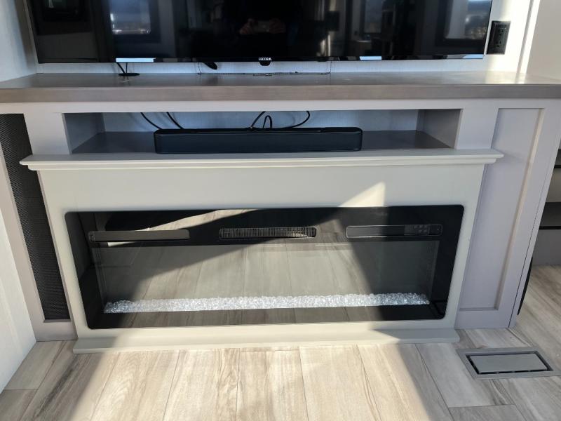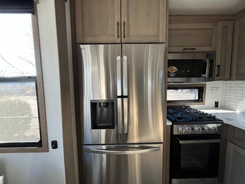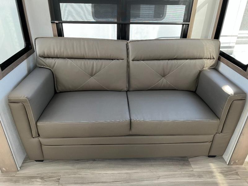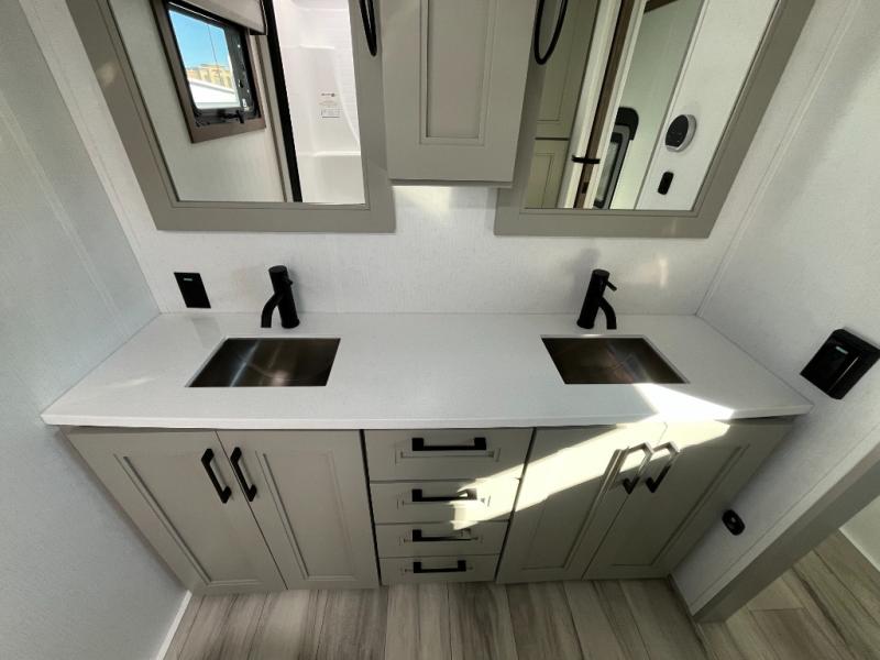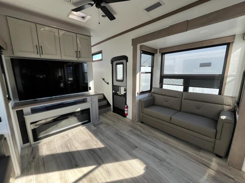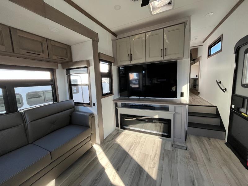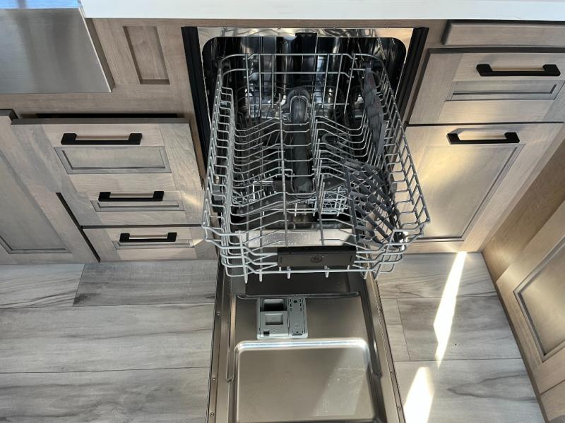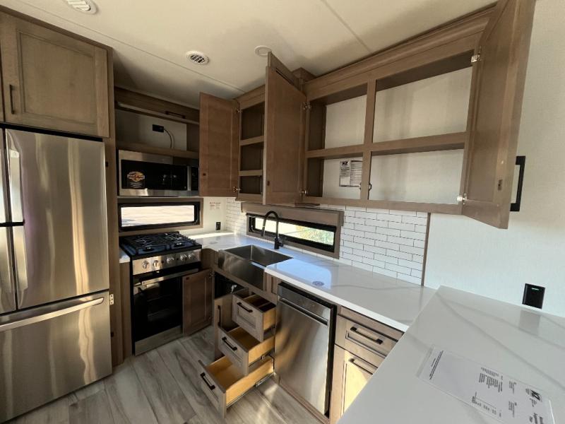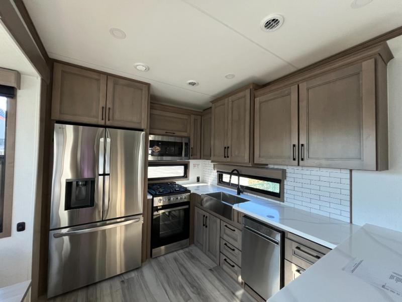 Any cook will love this fifth wheel's layout with a rear kitchen which includes residential appliances, a farmhouse stainless steel sink, a dishwasher, and pantry. You can see the LED TV with a fireplace below from the slide out which includes the sliding table/desk with chairs or from the living area. The theater seating with USB ports, and two hide-a-bed sofa slides widen this area so everyone can stretch out and relax. At night, retire to your own front bedroom with a slide out king electric tilt bed with drawers underneath, a front wardrobe including washer and dryer prep, a closet with a built-in hamper, plus a slide out dresser with a 32" Smart LED TV above it. And the full bathroom provides a residential shower with a seat plus linen storage, and two sinks for more convenience.