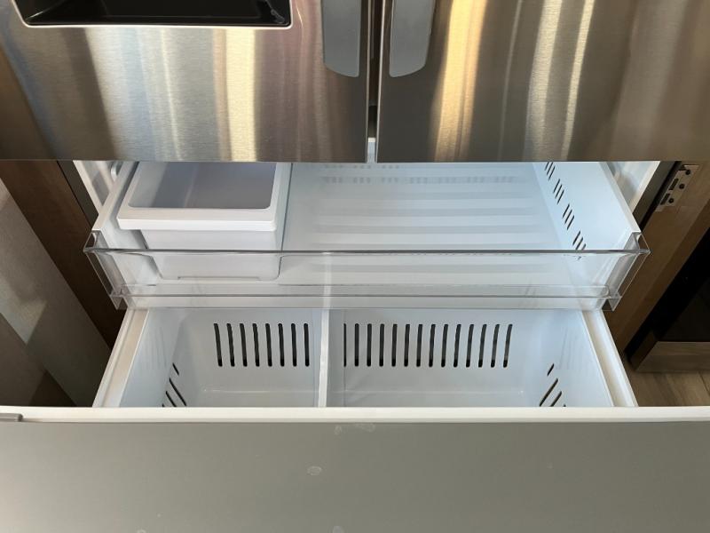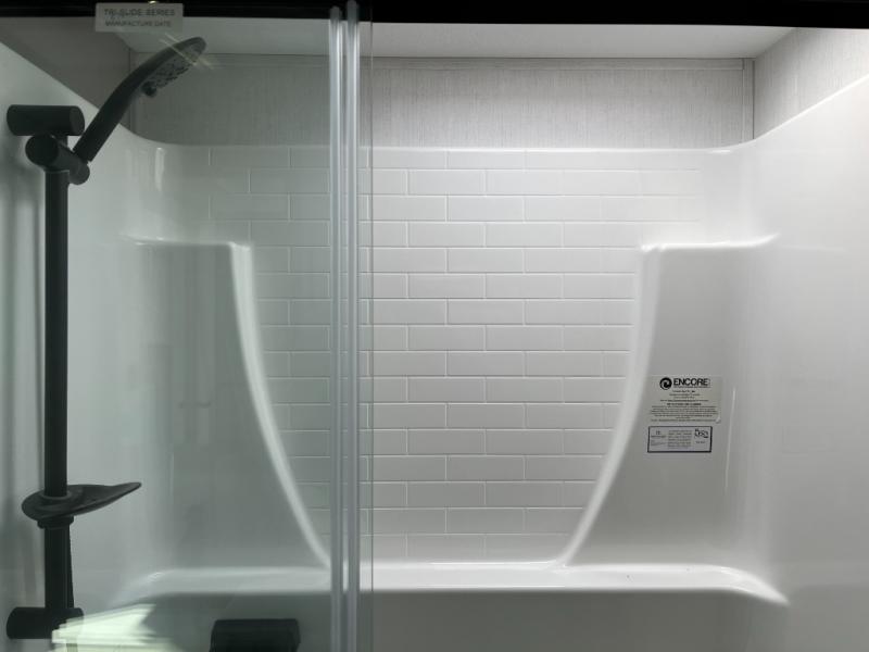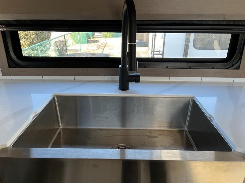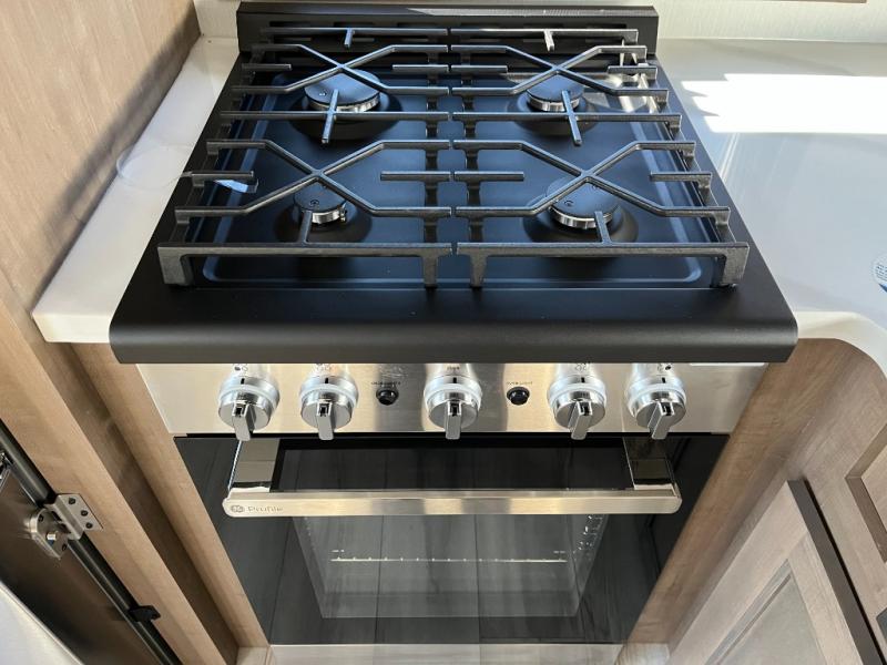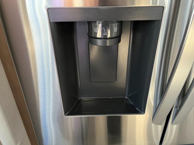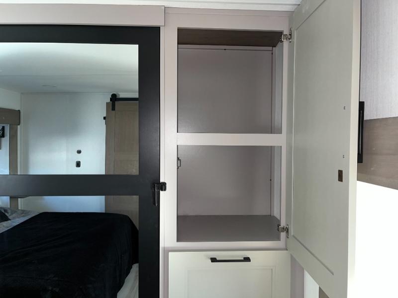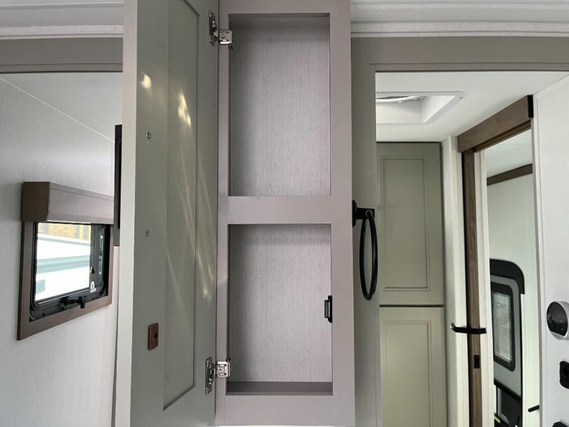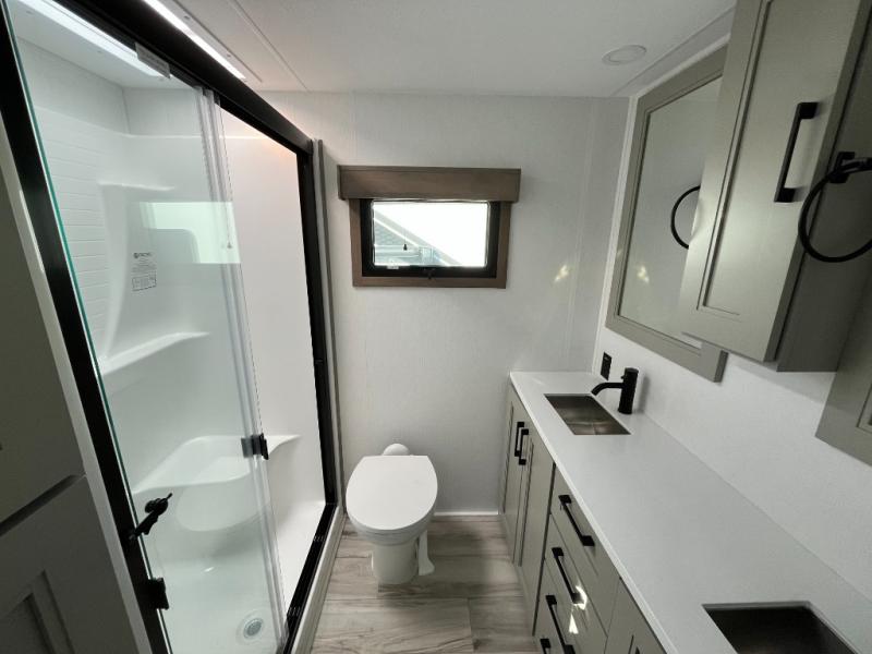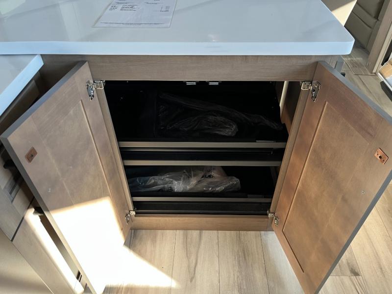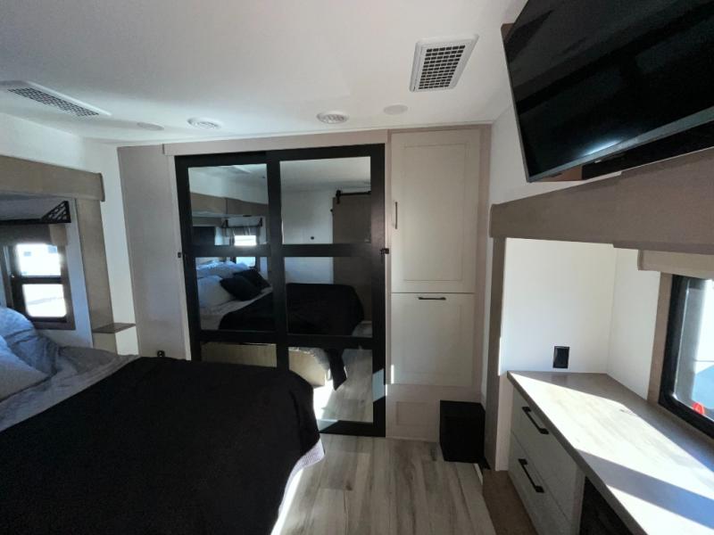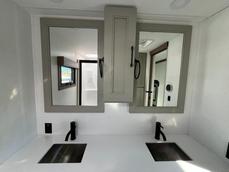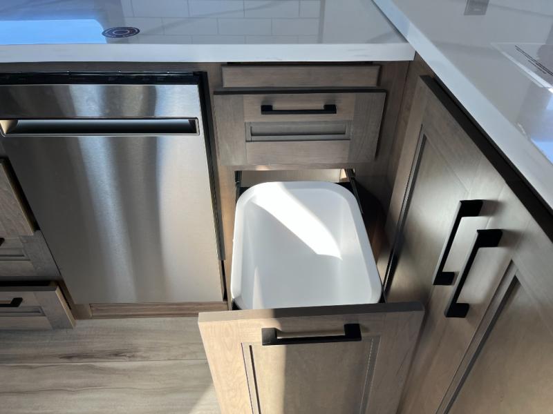 Any cook will love this fifth wheel's layout with a rear kitchen which includes residential appliances, a farmhouse stainless steel sink, a dishwasher, and pantry. You can see the LED TV with a fireplace below from the slide out which includes the sliding table/desk with chairs or from the living area. The theater seating with USB ports, and two hide-a-bed sofa slides widen this area so everyone can stretch out and relax. At night, retire to your own front bedroom with a slide out king electric tilt bed with drawers underneath, a front wardrobe including washer and dryer prep, a closet with a built-in hamper, plus a slide out dresser with a 32" Smart LED TV above it. And the full bathroom provides a residential shower with a seat plus linen storage, and two sinks for more convenience.