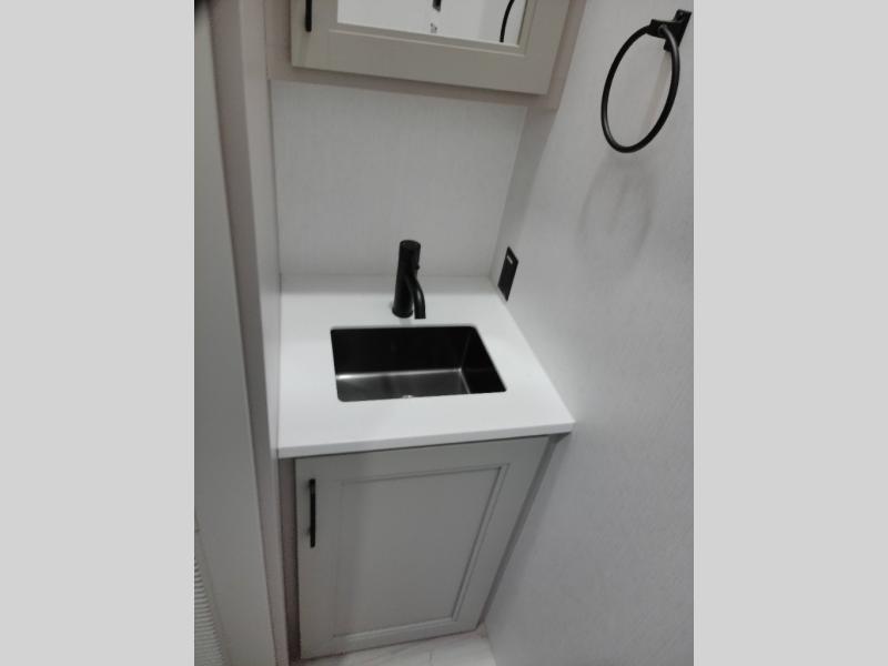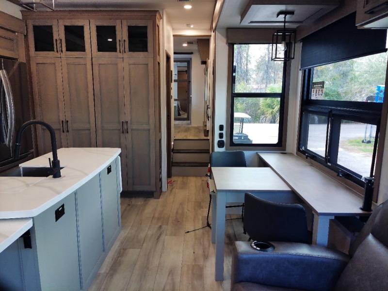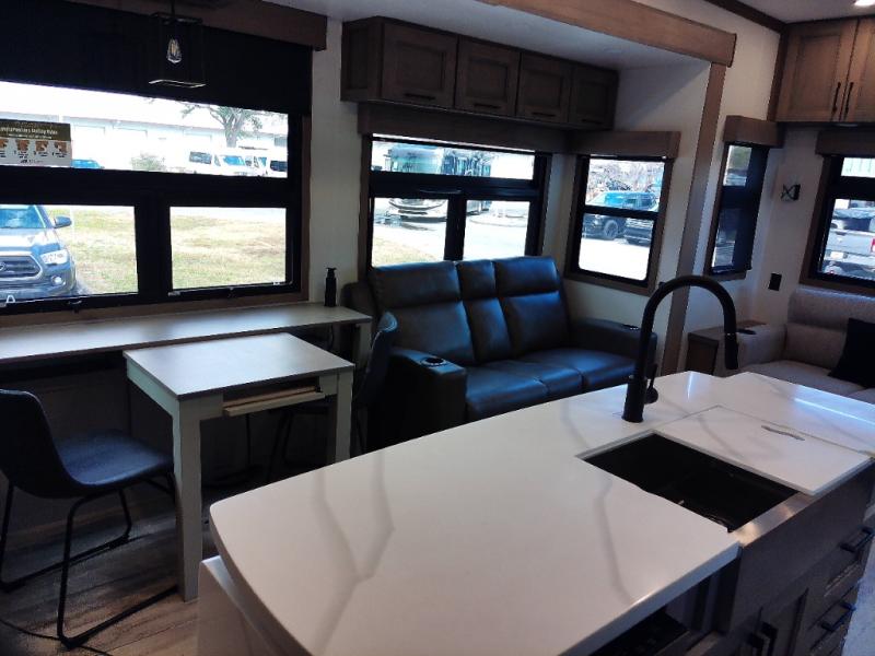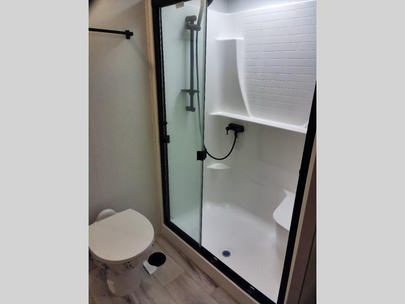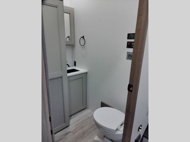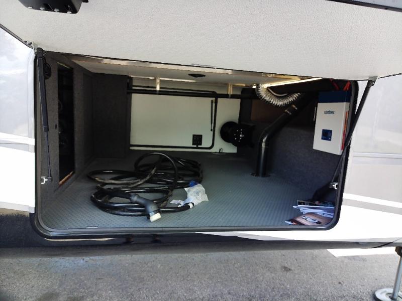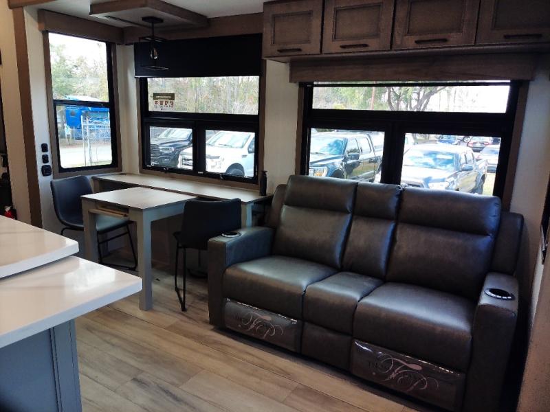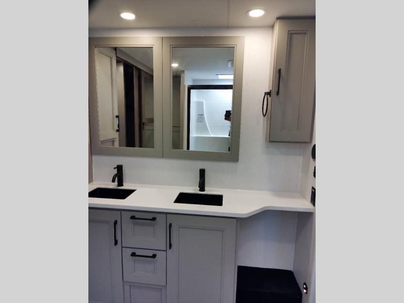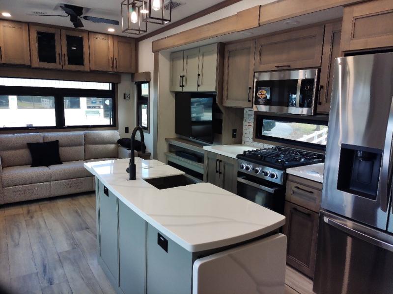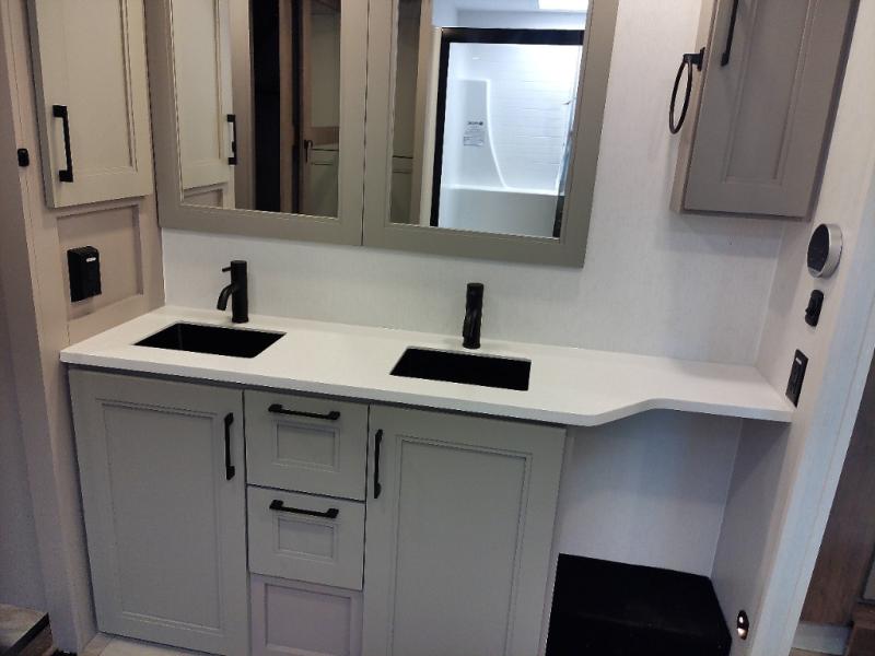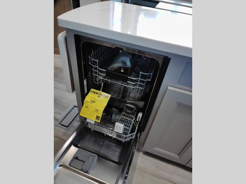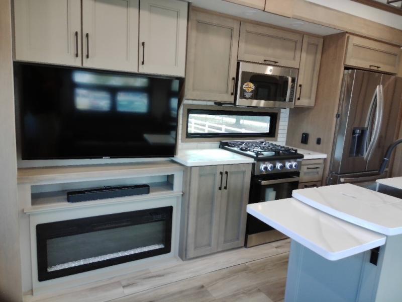 With a bath and a half, everyone will stay clean in this fifth wheel! The front full bathroom has a dual sink vanity for two to get ready at once, a 48" x 30" shower with a seat, and a front closet for your clothes. You can enter into the master suite from the bathroom and relax on the electric tilt king bed slide, store your things in the underbed drawers, and watch a movie in bed with the Smart LED TV. The half bathroom is directly off of the kitchen, and this room includes washer and dryer prep if you choose to add these appliances. You can prepare dinner at the four burner cooktop with a 24" oven and kitchen island, which also has a dishwasher for easy clean ups. Eat your meals at the sliding table/desk and then let your stomach settle while relaxing on the rear hide-a-bed sofa or theater seating across from the entertainment center with 40" fireplace!