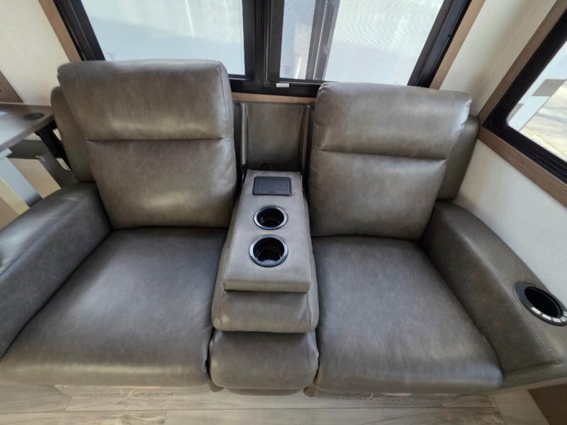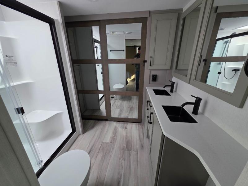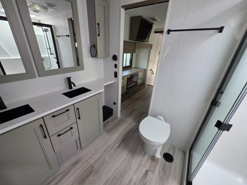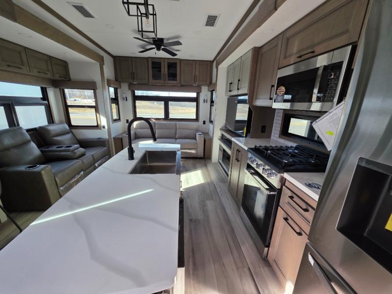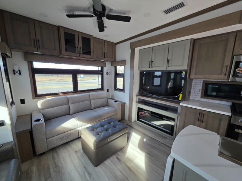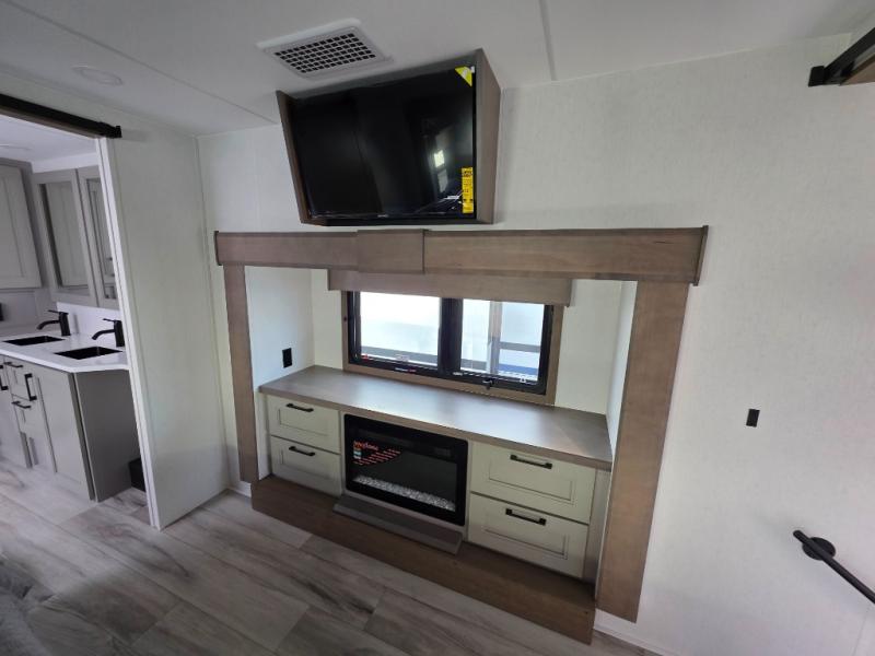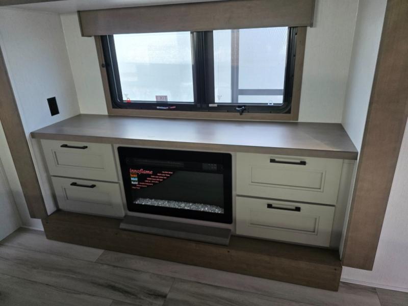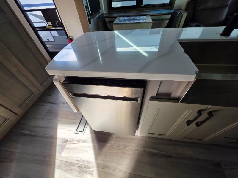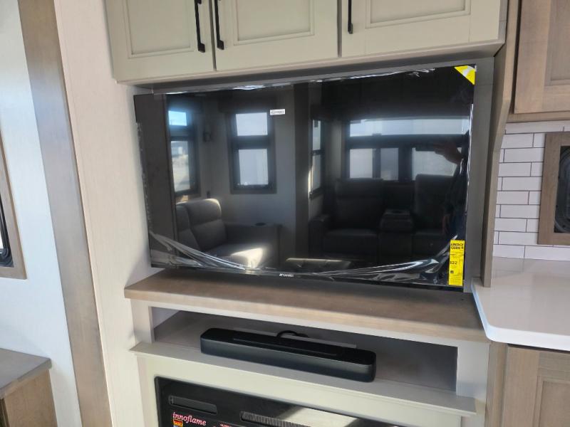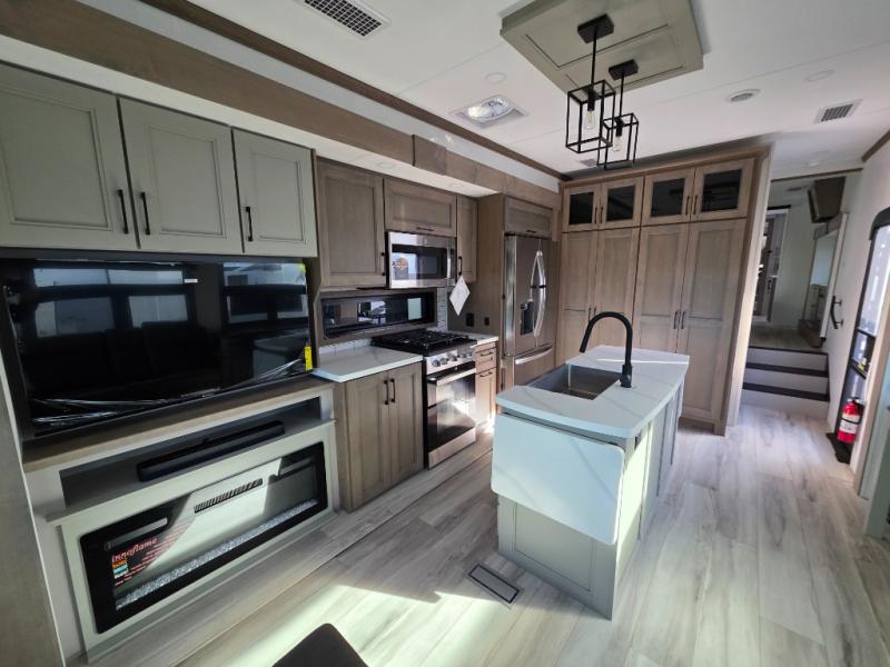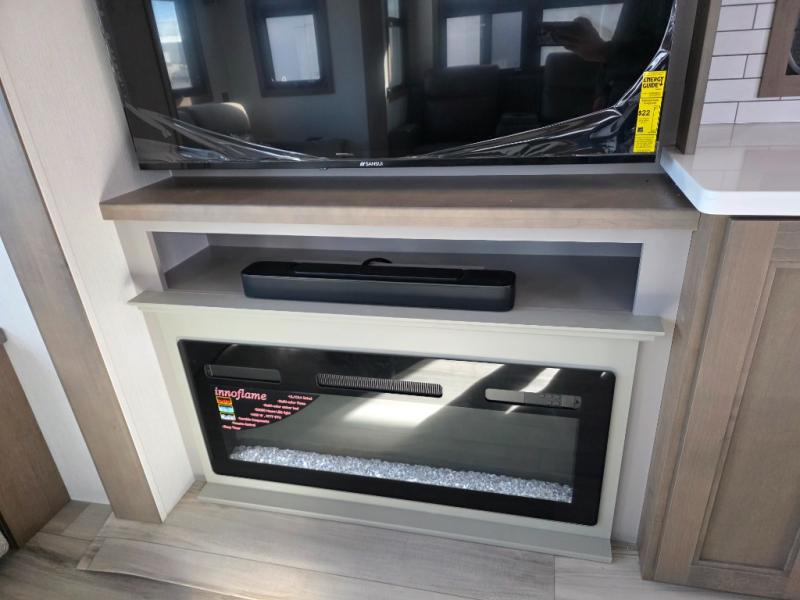 With a bath and a half, everyone will stay clean in this fifth wheel! The front full bathroom has a dual sink vanity for two to get ready at once, a 48" x 30" shower with a seat, and a front closet for your clothes. You can enter into the master suite from the bathroom and relax on the electric tilt king bed slide, store your things in the underbed drawers, and watch a movie in bed with the Smart LED TV. The half bathroom is directly off of the kitchen, and this room includes washer and dryer prep if you choose to add these appliances. You can prepare dinner at the four burner cooktop with a 24" oven and kitchen island, which also has a dishwasher for easy clean ups. Eat your meals at the sliding table/desk and then let your stomach settle while relaxing on the rear hide-a-bed sofa or theater seating across from the entertainment center with 40" fireplace!