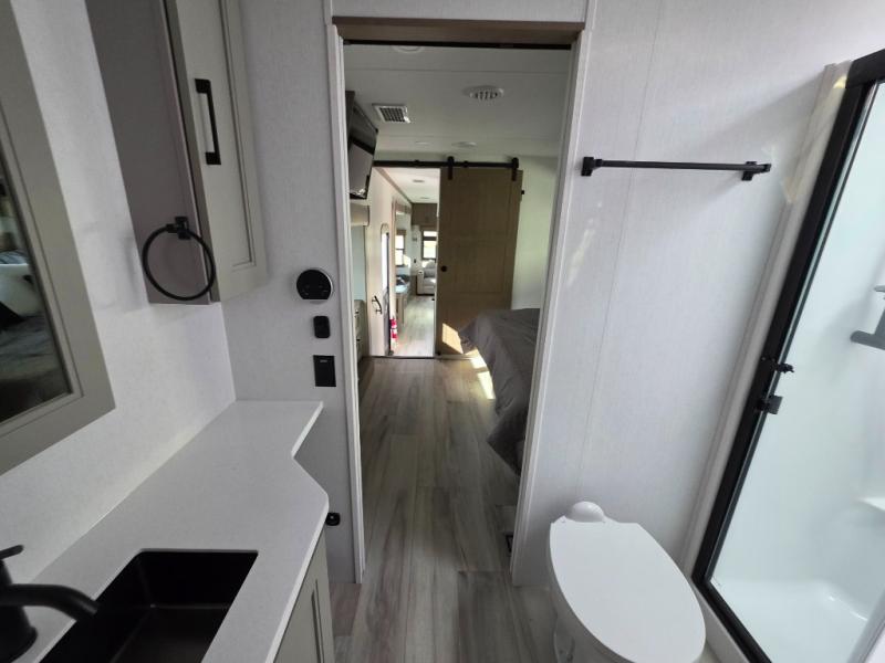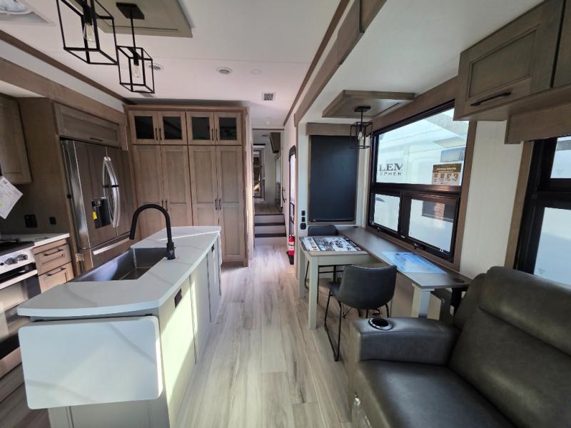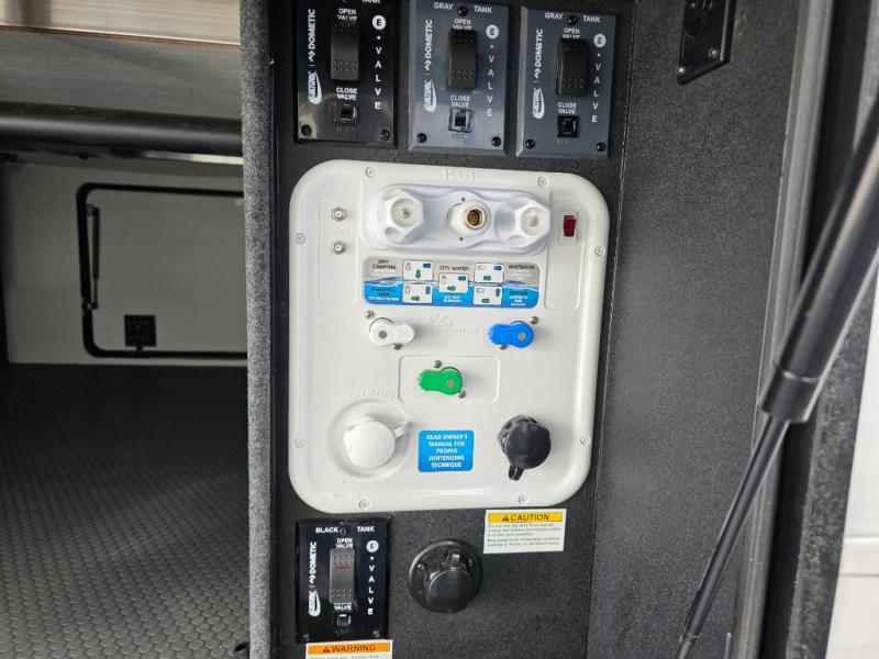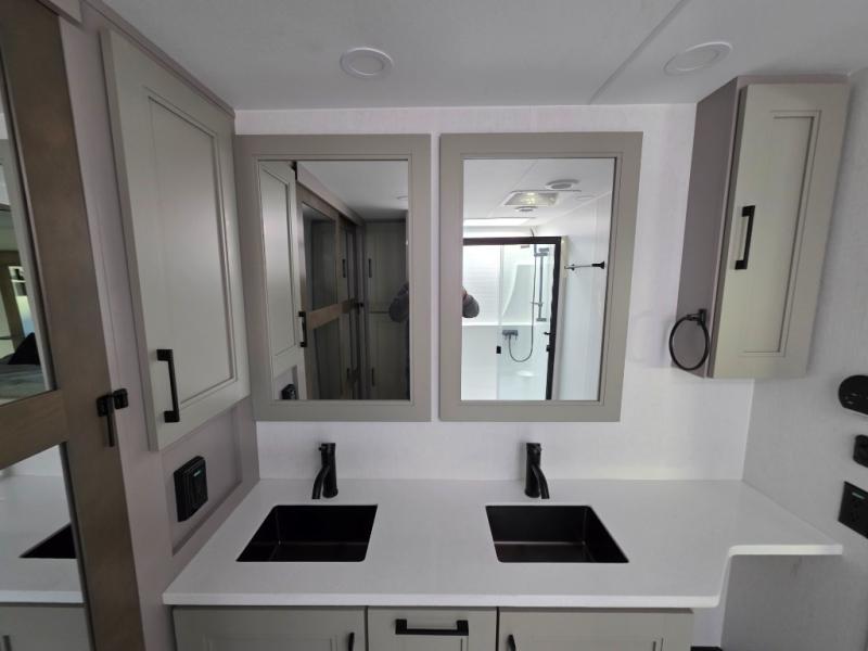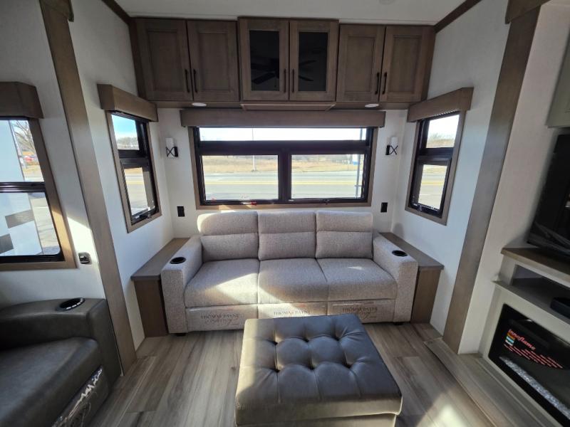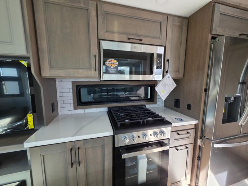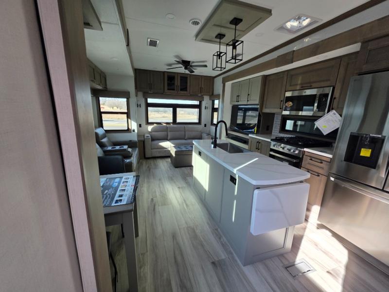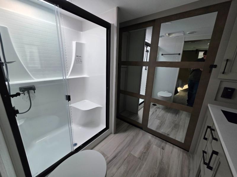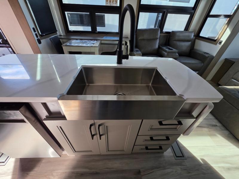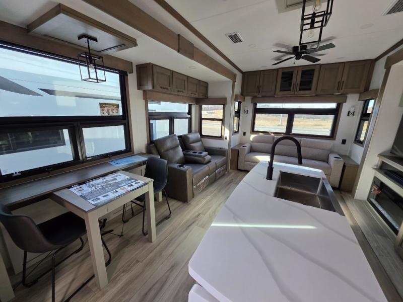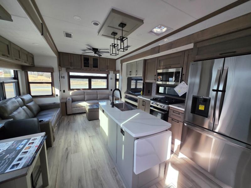 With a bath and a half, everyone will stay clean in this fifth wheel! The front full bathroom has a dual sink vanity for two to get ready at once, a 48" x 30" shower with a seat, and a front closet for your clothes. You can enter into the master suite from the bathroom and relax on the electric tilt king bed slide, store your things in the underbed drawers, and watch a movie in bed with the Smart LED TV. The half bathroom is directly off of the kitchen, and this room includes washer and dryer prep if you choose to add these appliances. You can prepare dinner at the four burner cooktop with a 24" oven and kitchen island, which also has a dishwasher for easy clean ups. Eat your meals at the sliding table/desk and then let your stomach settle while relaxing on the rear hide-a-bed sofa or theater seating across from the entertainment center with 40" fireplace!