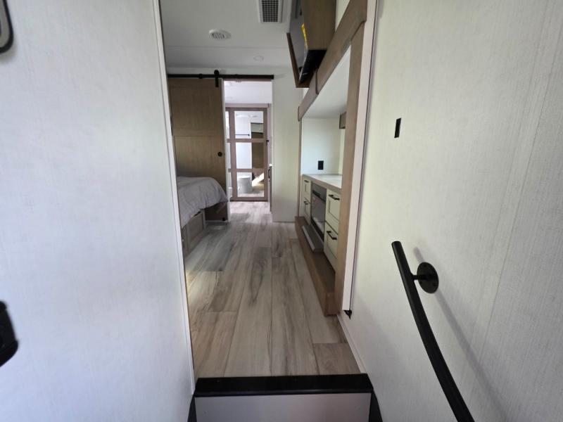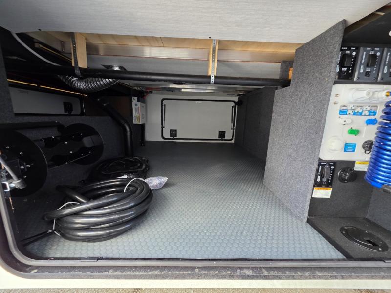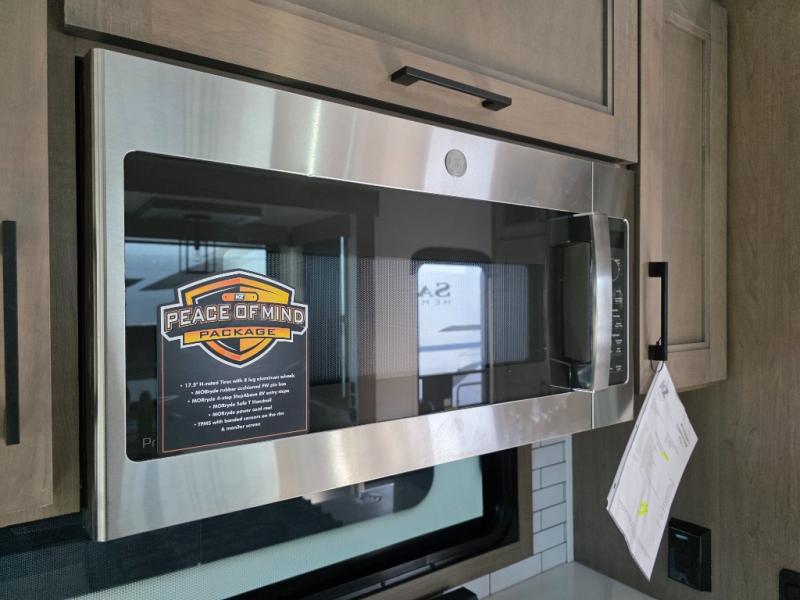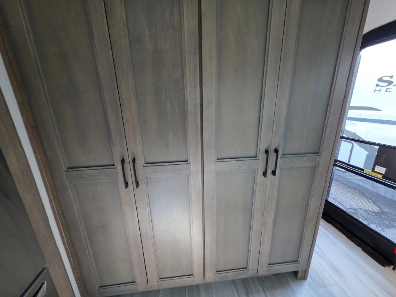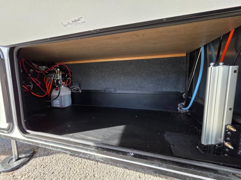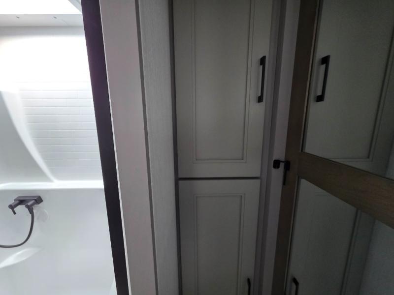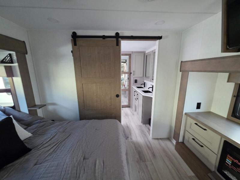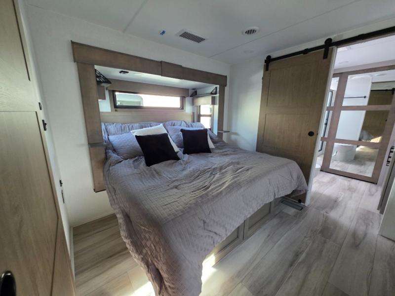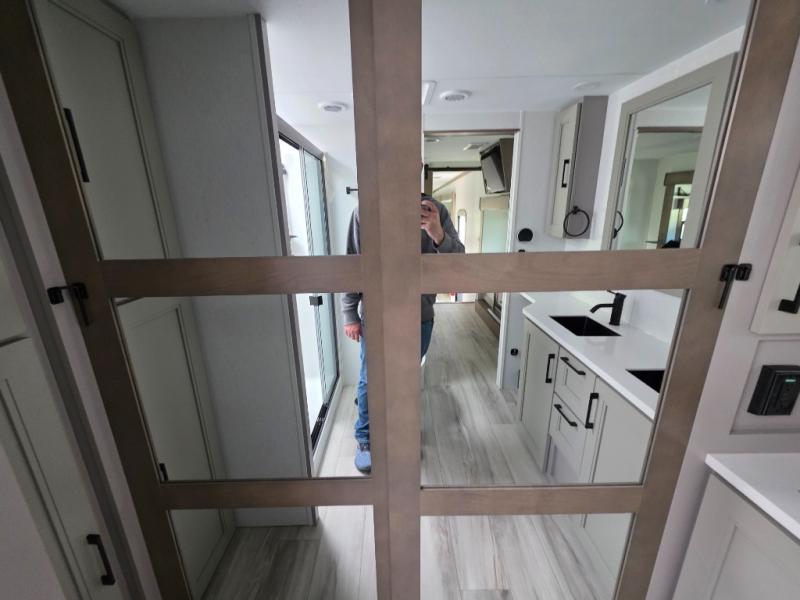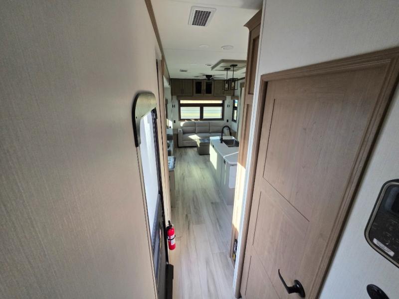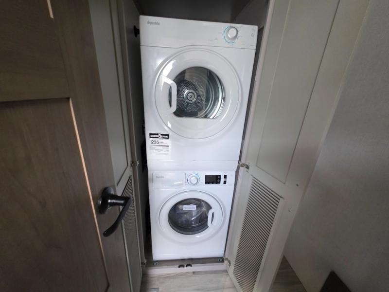 With a bath and a half, everyone will stay clean in this fifth wheel! The front full bathroom has a dual sink vanity for two to get ready at once, a 48" x 30" shower with a seat, and a front closet for your clothes. You can enter into the master suite from the bathroom and relax on the electric tilt king bed slide, store your things in the underbed drawers, and watch a movie in bed with the Smart LED TV. The half bathroom is directly off of the kitchen, and this room includes washer and dryer prep if you choose to add these appliances. You can prepare dinner at the four burner cooktop with a 24" oven and kitchen island, which also has a dishwasher for easy clean ups. Eat your meals at the sliding table/desk and then let your stomach settle while relaxing on the rear hide-a-bed sofa or theater seating across from the entertainment center with 40" fireplace!