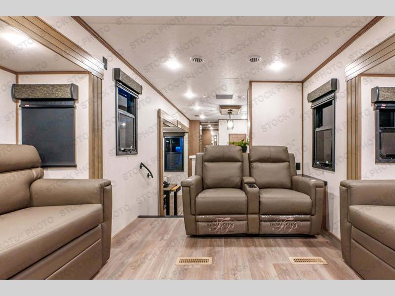 With any KZ Durango Gold full-time luxury fifth wheel, you will enjoy the new Blancher Maple and Morel Fog cabinetry, stainless steel appliances such as a 30" convection microwave and 24" oven with a four-burner range, plus a stainless dishwasher. Other top features include an electric tilt bed with Serta Comfort foam king mattress, three 15K A/C units, plus theater seating with powered recline, heat and massage features. You will also appreciate a handy central vacuum system with attachments that stores out of sight. Each Durango Gold is constructed with six-sided aluminum framing, and has a heated, insulated and an enclosed underbelly. It is also constructed with Tufflex roofing material, which is flexible, puncture resistant, and reflective. The now mandatory "Off The Grid" solar package includes two 200W solar panels, a 30A MPPT solar charge controller, and a 2,000W True Sine Wave inverter for off-grid capabilities.
