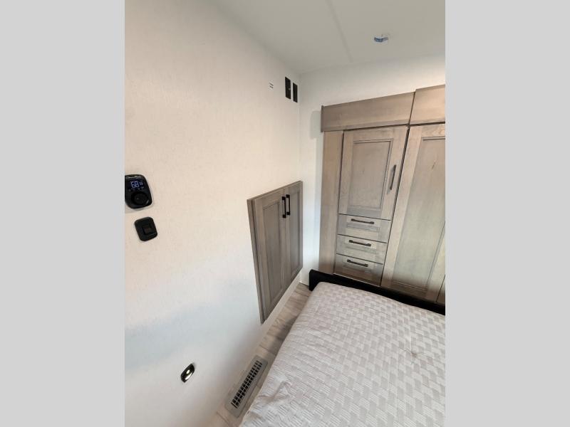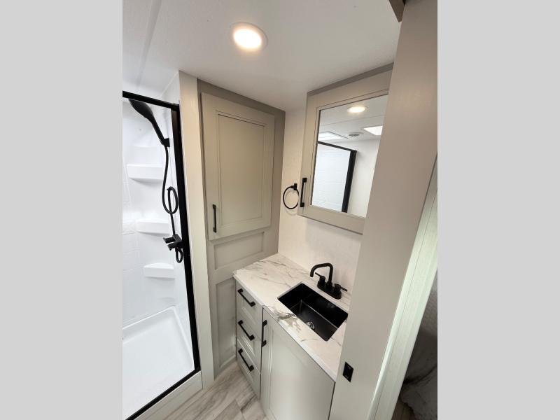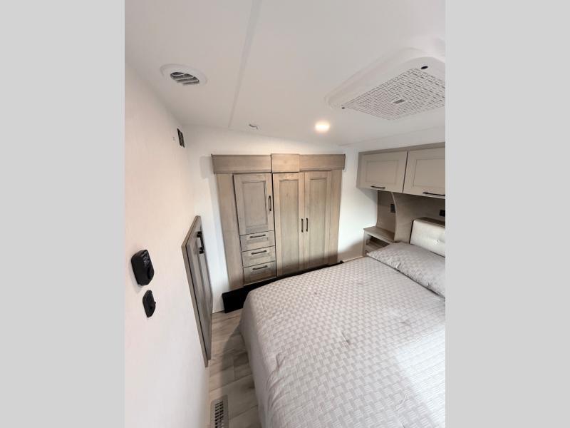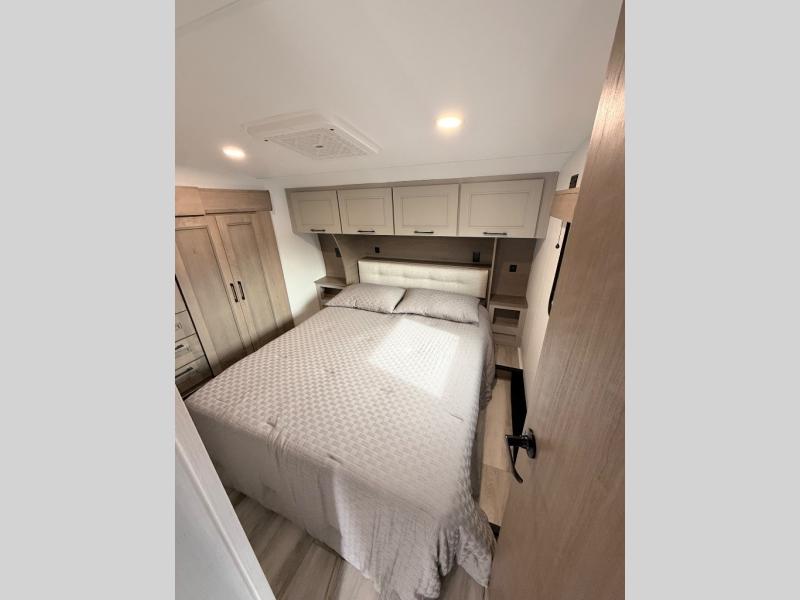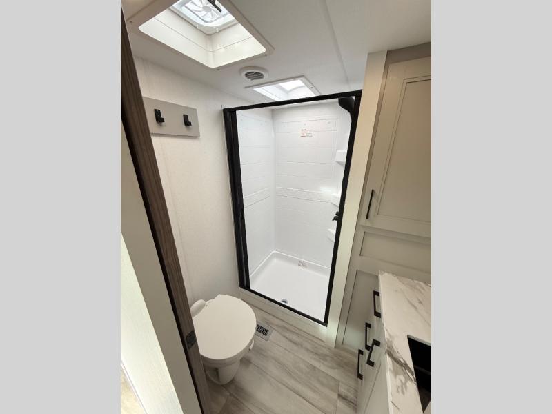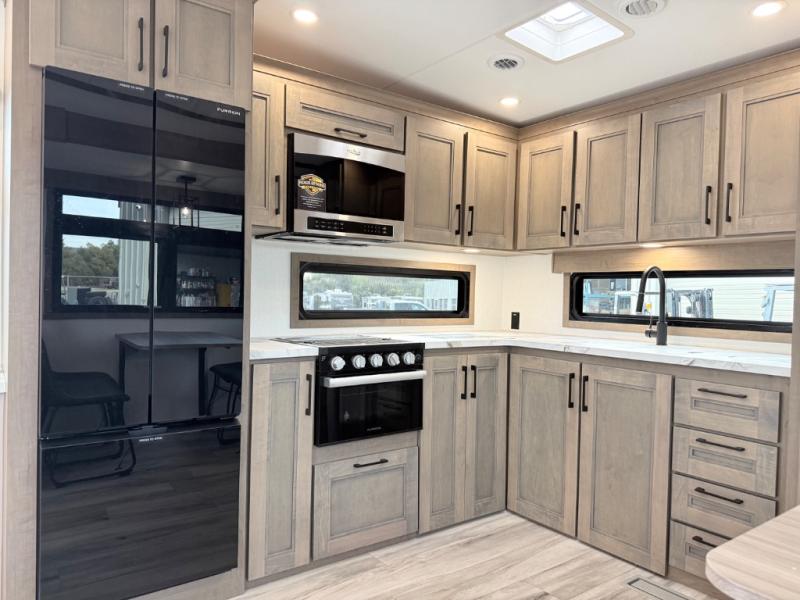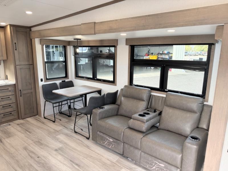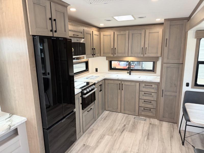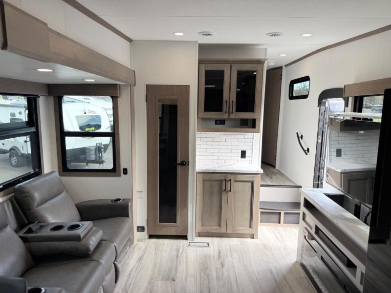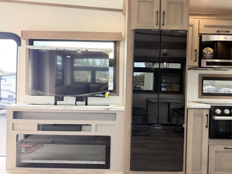 You'll fit right into this spacious fifth wheel for four! The rear kitchen includes plenty of counter space, a three burner drop-in cooktop, plus a spacious refrigerator and a pantry for food storage. Your crew can get cozy on the hide-a-bed sofa or choose the optional theater seating if you're not needing the extra sleeping space. The cook will also love having an outside kitchen with a griddle for pancakes in the morning! The dinette with EZ adjust table will give you a place to dine or play a game of cards, or you can sit outdoors under the 19' power awning with LED lights. The large 30" x 36" shower includes a skylight for more standing room and natural light, and the front private bedroom will provide you with your own space at night. Here, you'll find a queen bed with underbed storage, a wardrobe slide out, and a closet with washer and dryer prep that will make going full-time easier than ever!