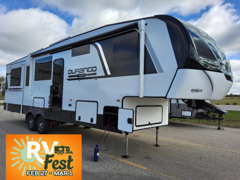 Each Durango Half-Ton fifth wheel by KZ provides lightweight towing with interior luxuries galore! Controlling the functions of your unit will be a breeze with the KZ Engage powered by OneControl that includes new integrated buttons & screen to control awnings, lights, tanks, and more. There are so many exterior conveniences to make each trip enjoyable, like the heated water convenience center, and the flip-up main entry steps! Durable construction includes Tufflex PVC roofing, Pex® in-floor heated waterlines & kitchen gray pipes, and a reinforced heavy-duty fiberglass front cap. The interior will feel more like a residential home with new blancher maple & morel fog cabinets, seamless countertops, a spacious shower, a redesigned front bedroom, and smart storage spaces! You can also customize your fifth wheel to fit your needs with available options, such as, generator prep, wireless backup camera prep, a 32" exterior TV with bracket, and so much more!