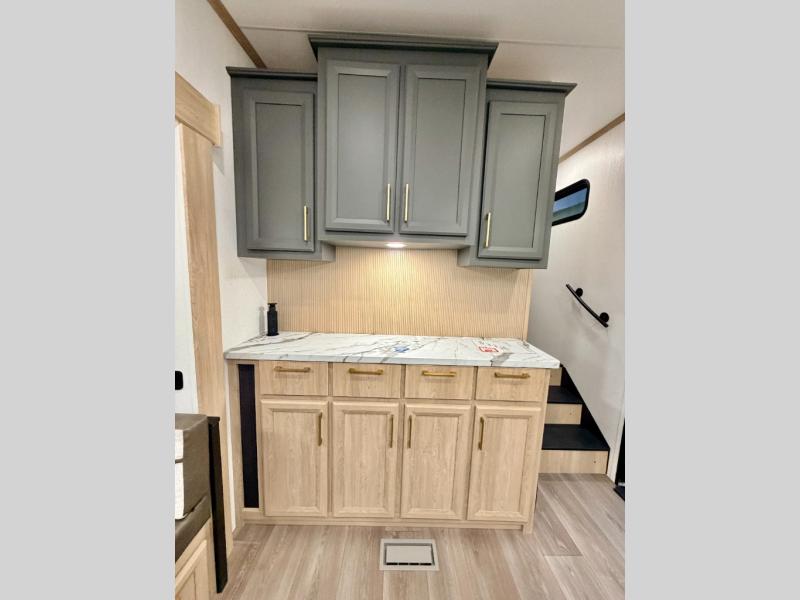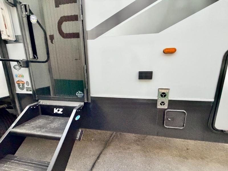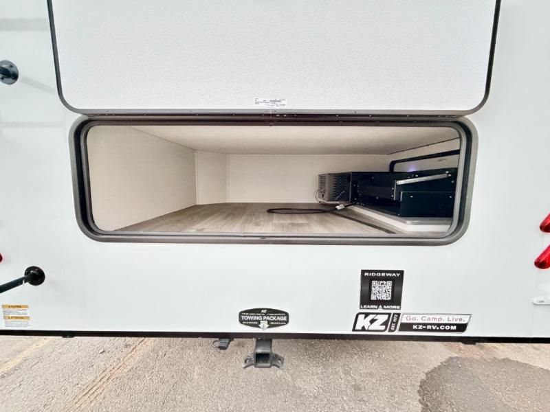 When you choose a Ridgeway fifth wheel by KZ you are choosing a modern design, convenient features, and comfort at every turn! These units have been constructed with some of the most durable materials in the industry, including Tufflex roofing material. The exterior includes a full painted front cap, a fully-finished, heated and sealed basement storage compartment, and a deluxe heated water convenience center to easily monitor your units water levels. There is also 4-point auto electric leveling, a 2" towing receiver hitch, and many more stand-out exterior features. Once inside, you'll enjoy the ceiling crown molding, 5" gold cabinet hardware, deluxe residential-style furniture, and all-wood lumber core screwed cabinets with hardwood doors. The comforts continue on in the bathroom and bedroom with a shower skylight and built-in seat, large linen closets, a luxurious bedspread, and XL under-bed storage for luggage, extra blankets and more!