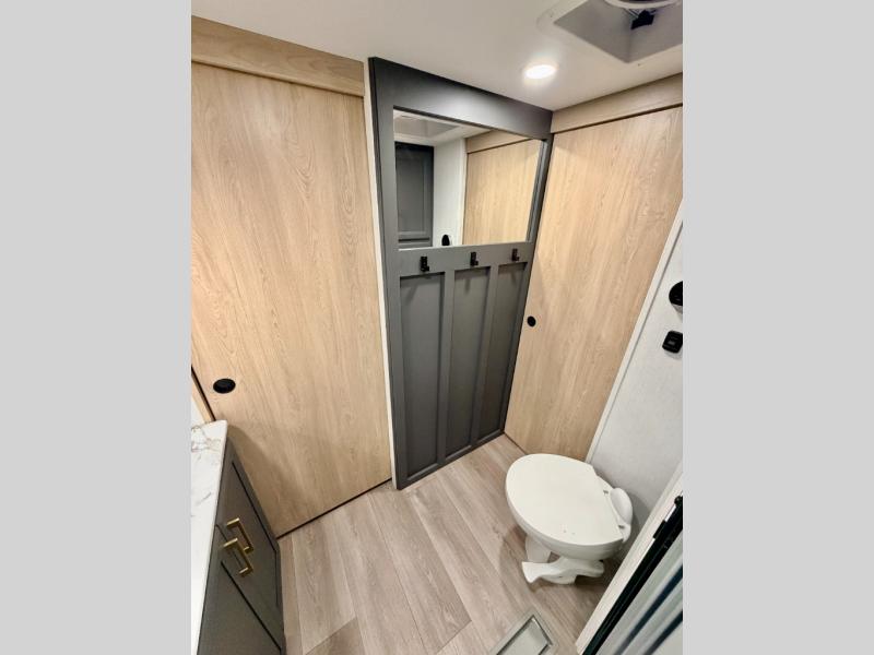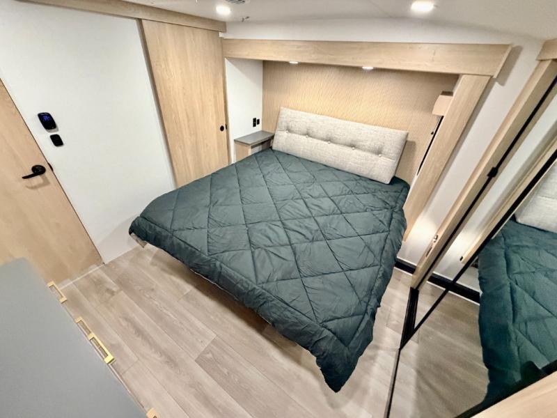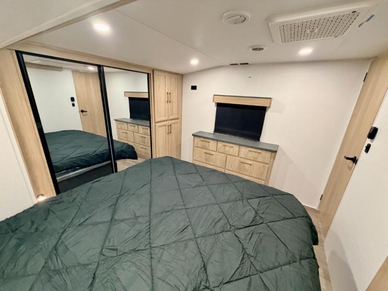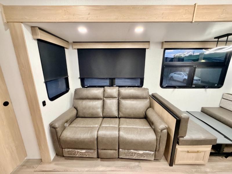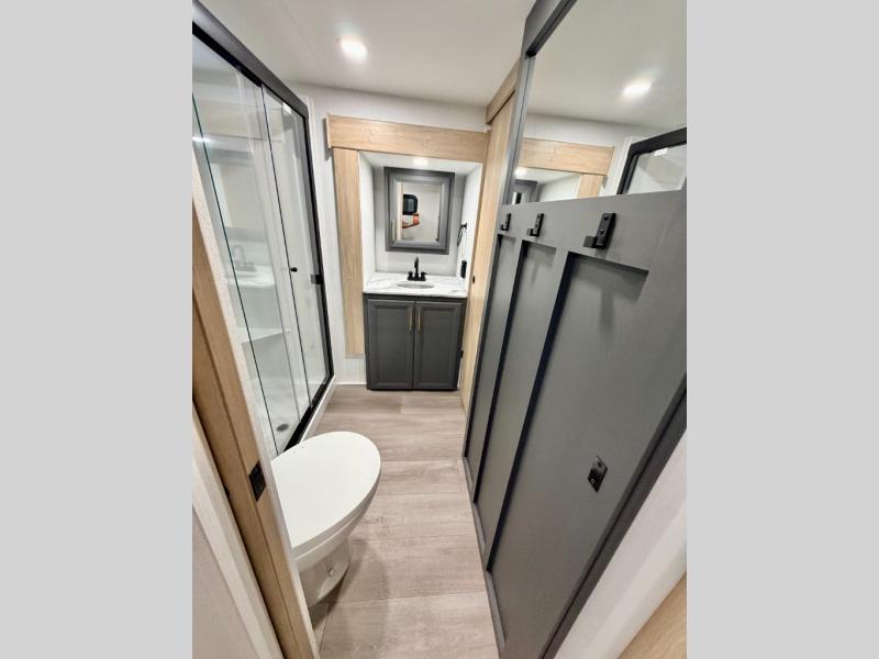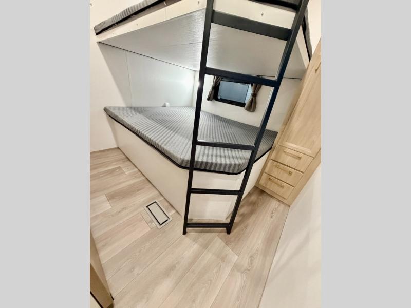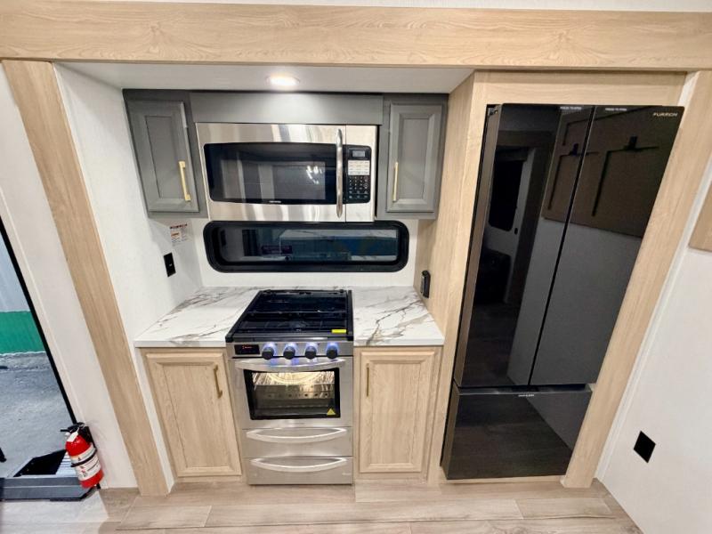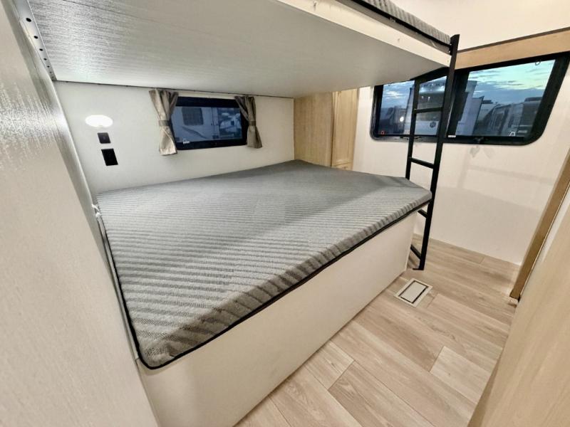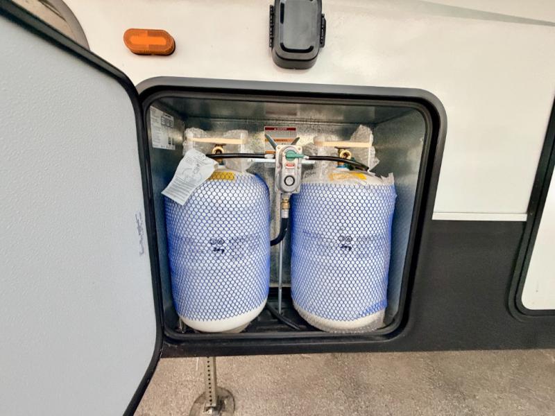 If you're looking for more space and a large sleeping capacity in your next RV, this fifth wheel is the one! Not only are there triple slides, but you can sleep six to eight, depending on the options you choose. The rear bunkhouse suite includes queen-size bunks, a closet, plus a half bath that features one of the dual entry doors to the unit for added convenience. You can make your meals inside on the three burner range and 21" oven, or head outdoors to use the outside griddle! Once you're back inside, your crew can play a game at the dinette or just relax on the theater seating. This can also be replaced with an optional hide-a-bed sofa for more sleeping space. A dual entry full bath will create a front master bedroom you are sure to love since there is a king bed slide, a dresser, and a front closet with washer and dryer prep!
