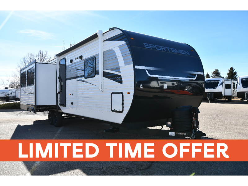 Each Sportsmen SE travel trailer and toy hauler by KZ is constructed with KZ exclusive tough shield exterior metal, a one-piece seamless walk-on Tufflex roofing material, and diamond plate rock guard to protect your unit from road debris. You will appreciate the extra large baggage doors for stowing away your gear when not in use, and tinted windows to help keep the harmful sun rays out plus keeping it cooler inside. Some of the exterior conveniences found in the mandatory Advantage Package are the solid folding steps with a large folding grab handle for easy entry and exit, a full glass friction hinged entry door, plus an exterior shower for your pets or to rinse off before you head inside. You'll also appreciate the nitrogen-filled tires, solar and backup camera prep, plus a Leash Latch with a bonus beverage opener. You'll feel right at home inside with linoleum flooring throughout, a 13,500 BTU air conditioner, large overhead cabinets, a shower surround, and much more!