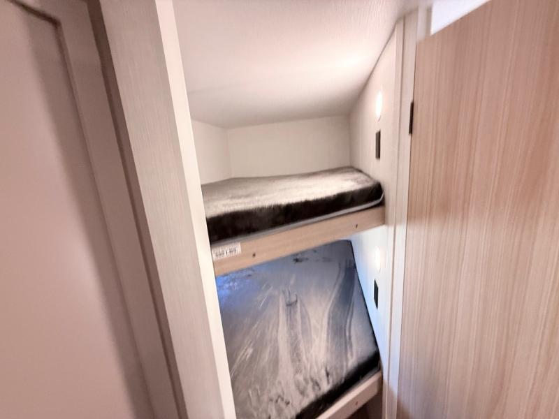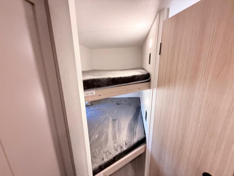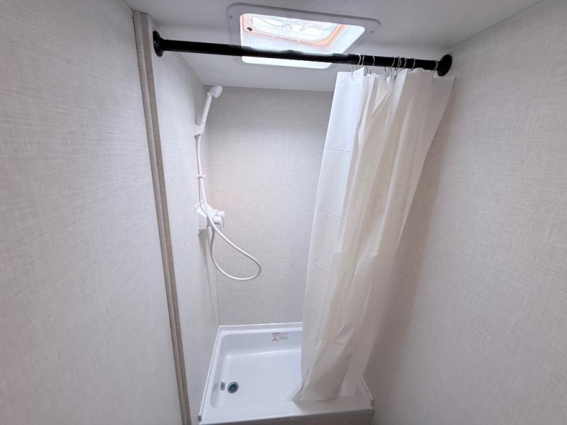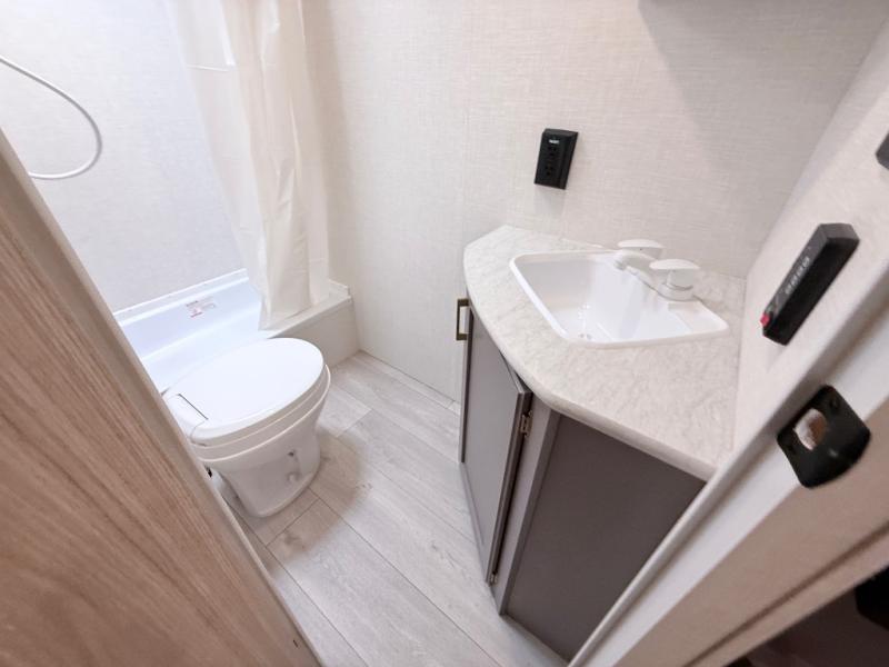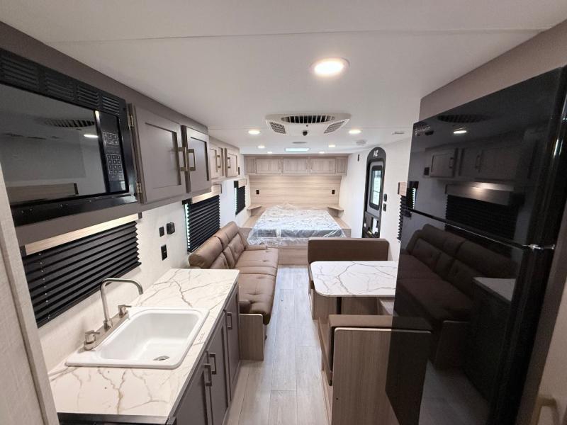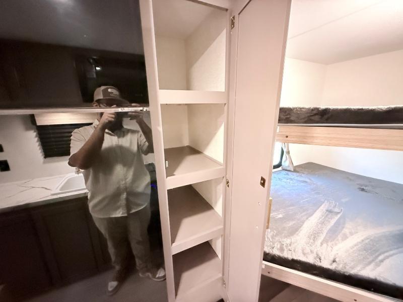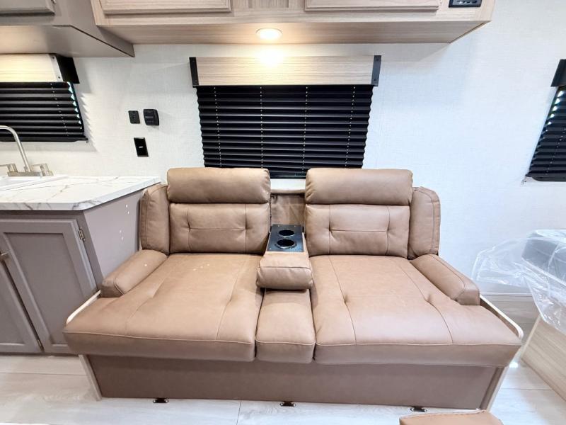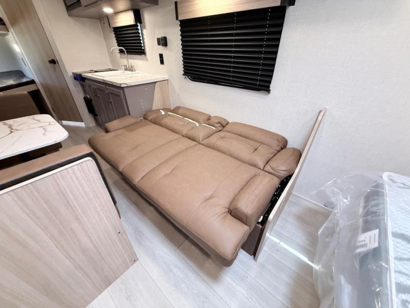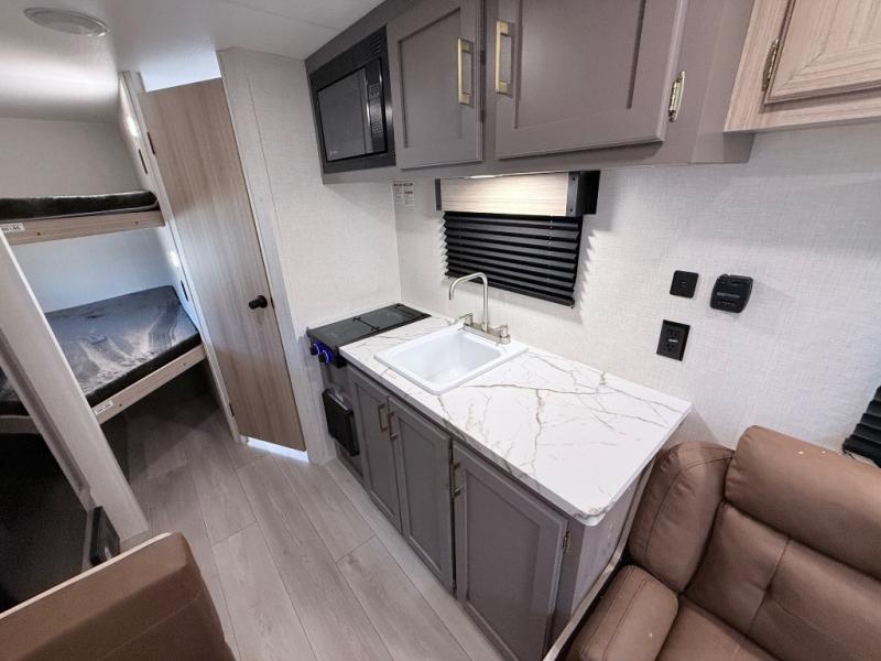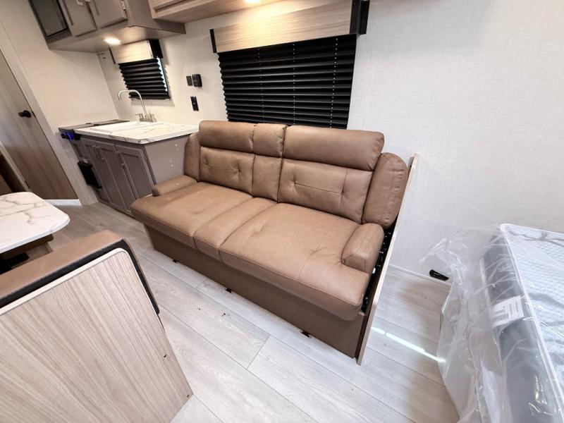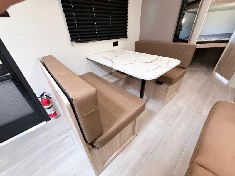 Double-size bunk beds provide ample space for kids or guests, while the front bed offers a cozy retreat for adults and nightstands add a touch of home. The full bathroom is equipped with everything you need to start your day feeling refreshed. The kitchen features an 8 cu refrigerator, two-burner cooktop, and sink, making meal prep easy. Plus, the pantry provides storage for your favorite snacks and ingredients. The jacknife sofa and booth dinette offer comfortable seating for meals, games, or movie nights.