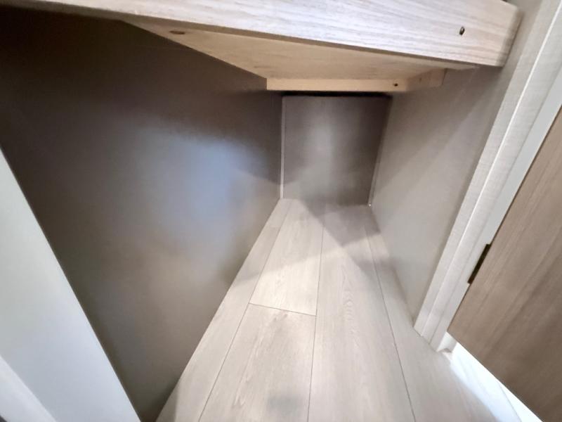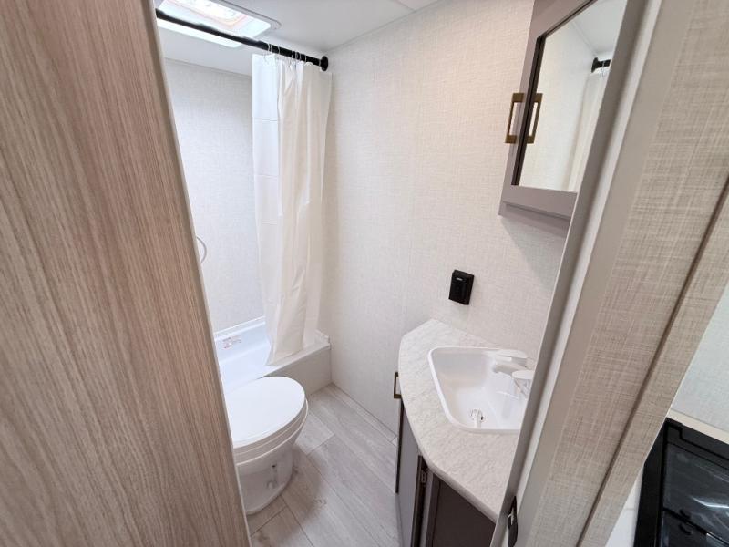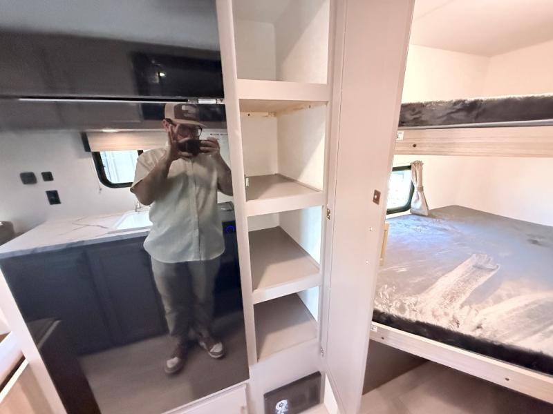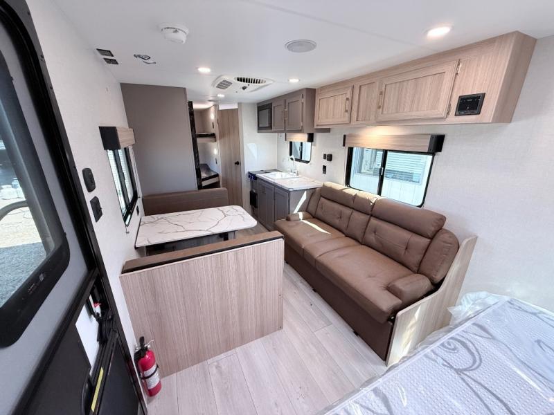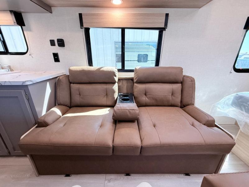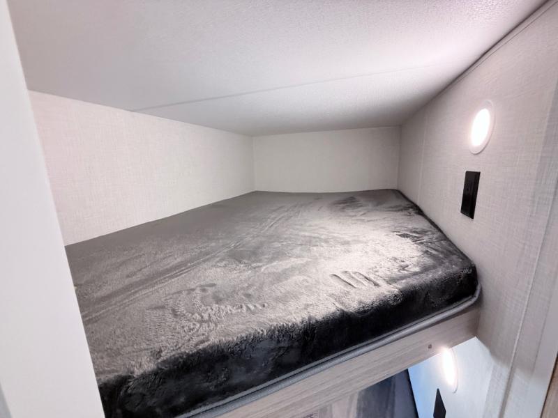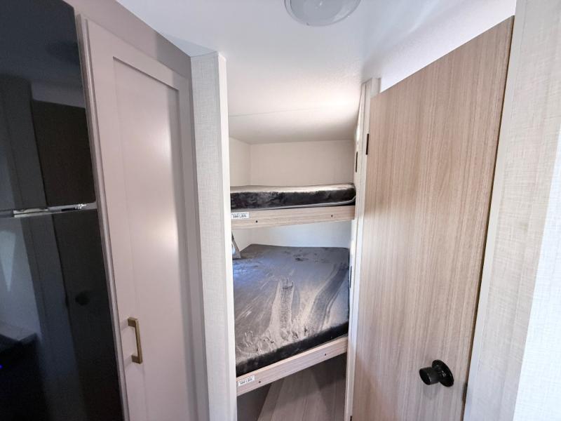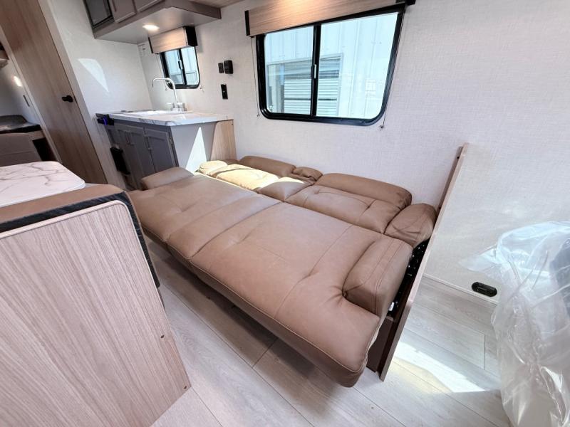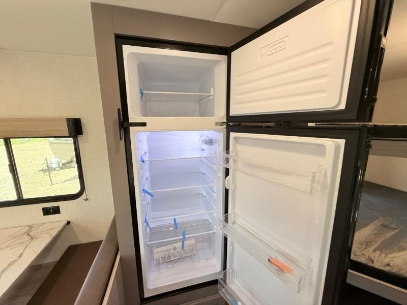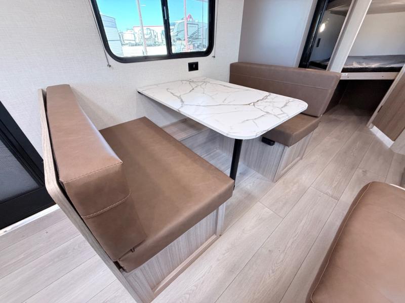 Double-size bunk beds provide ample space for kids or guests, while the front bed offers a cozy retreat for adults and nightstands add a touch of home. The full bathroom is equipped with everything you need to start your day feeling refreshed. The kitchen features an 8 cu refrigerator, two-burner cooktop, and sink, making meal prep easy. Plus, the pantry provides storage for your favorite snacks and ingredients. The jacknife sofa and booth dinette offer comfortable seating for meals, games, or movie nights.