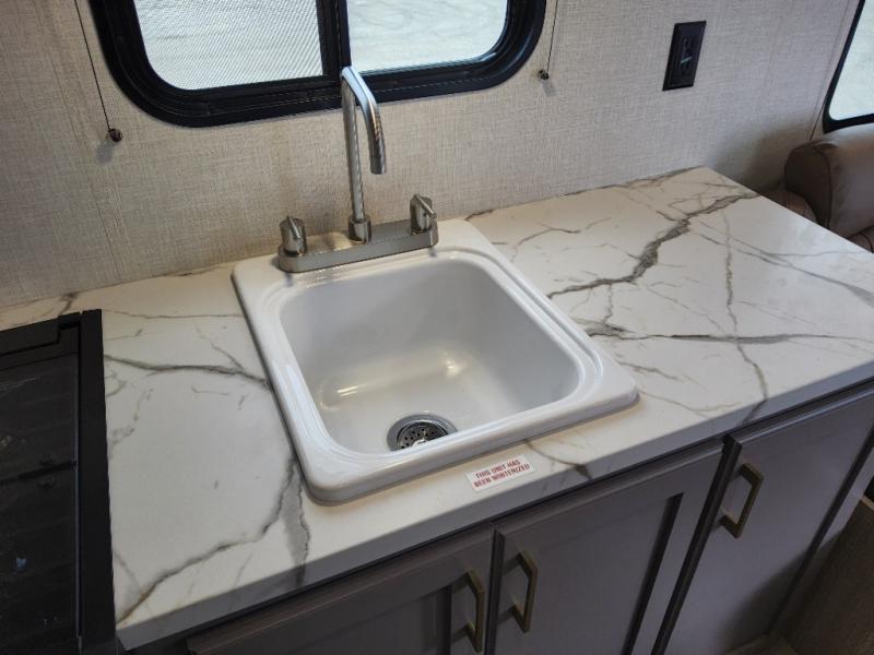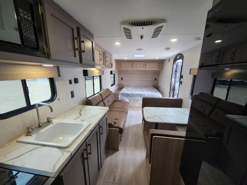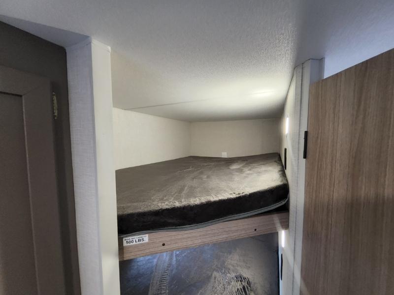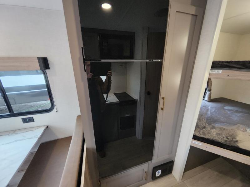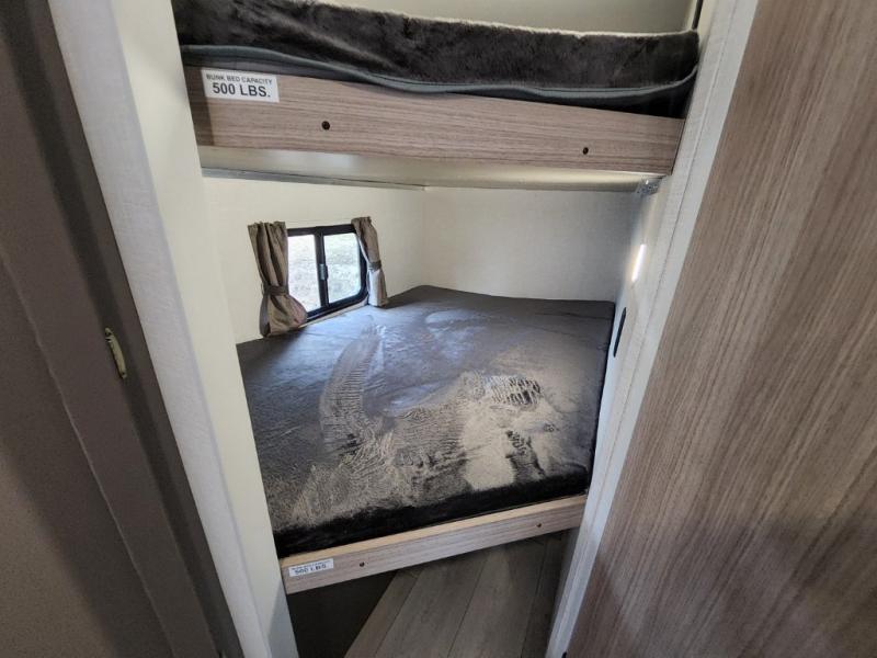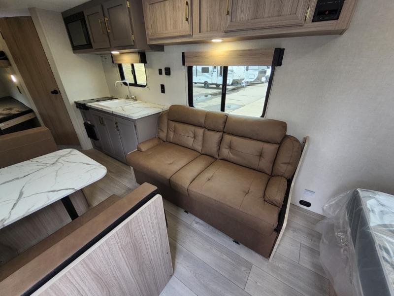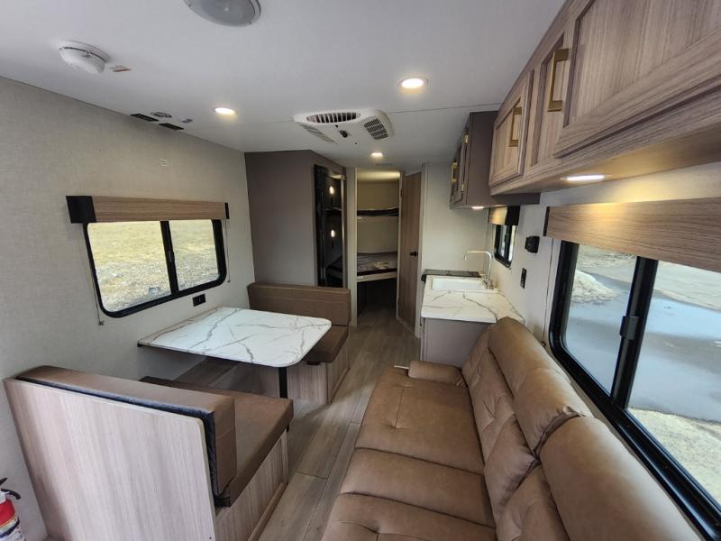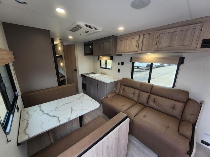 Double-size bunk beds provide ample space for kids or guests, while the front bed offers a cozy retreat for adults and nightstands add a touch of home. The full bathroom is equipped with everything you need to start your day feeling refreshed. The kitchen features an 8 cu refrigerator, two-burner cooktop, and sink, making meal prep easy. Plus, the pantry provides storage for your favorite snacks and ingredients. The jacknife sofa and booth dinette offer comfortable seating for meals, games, or movie nights.