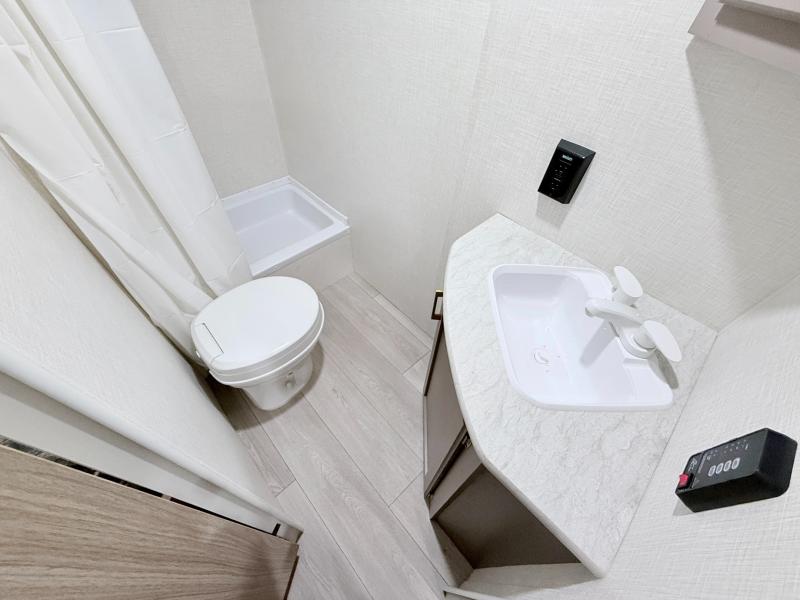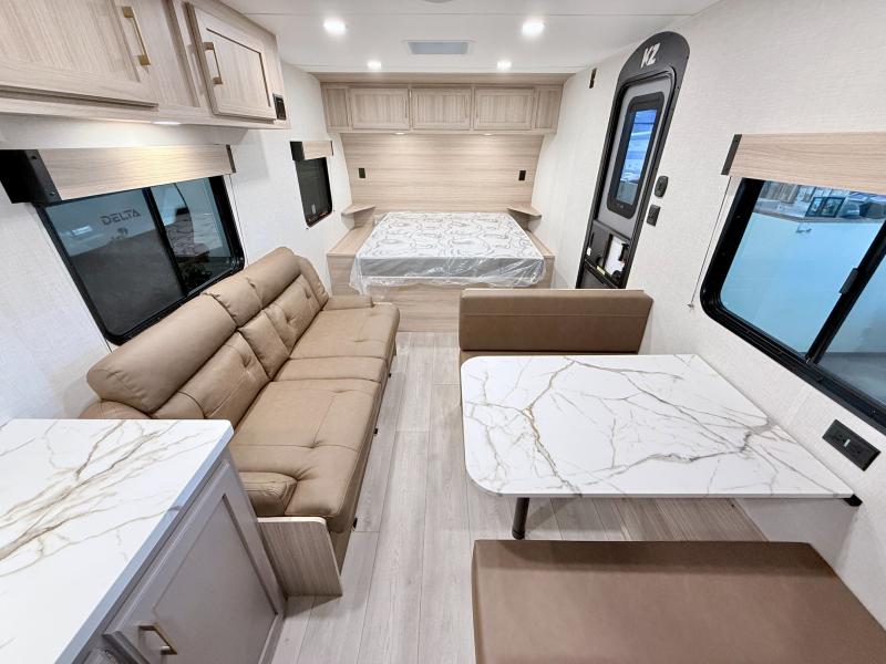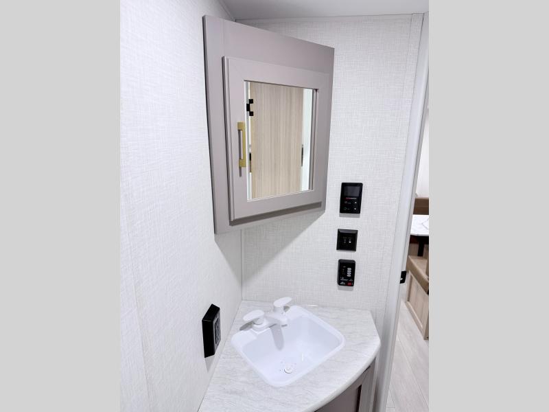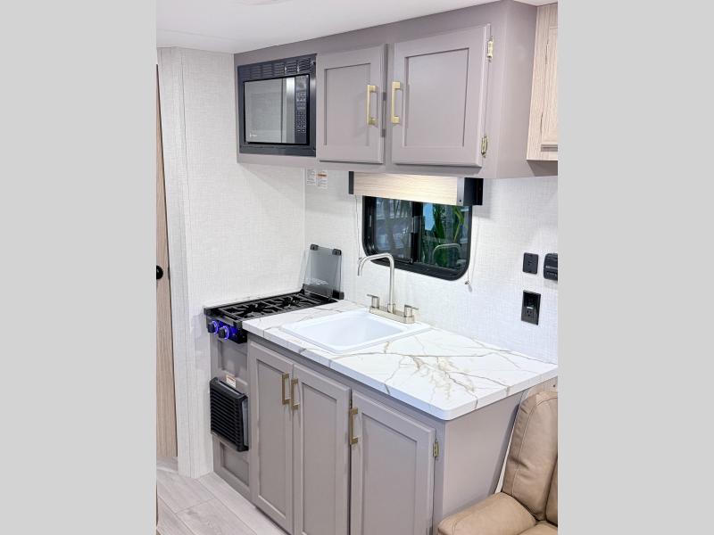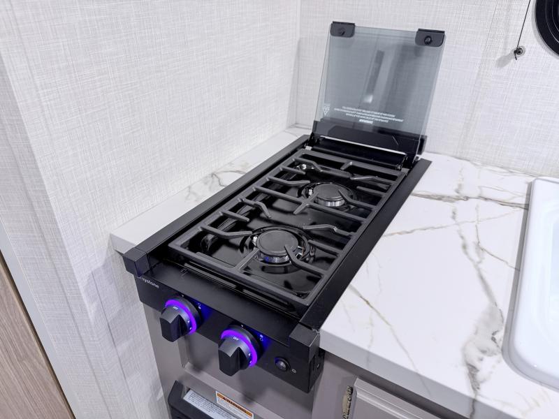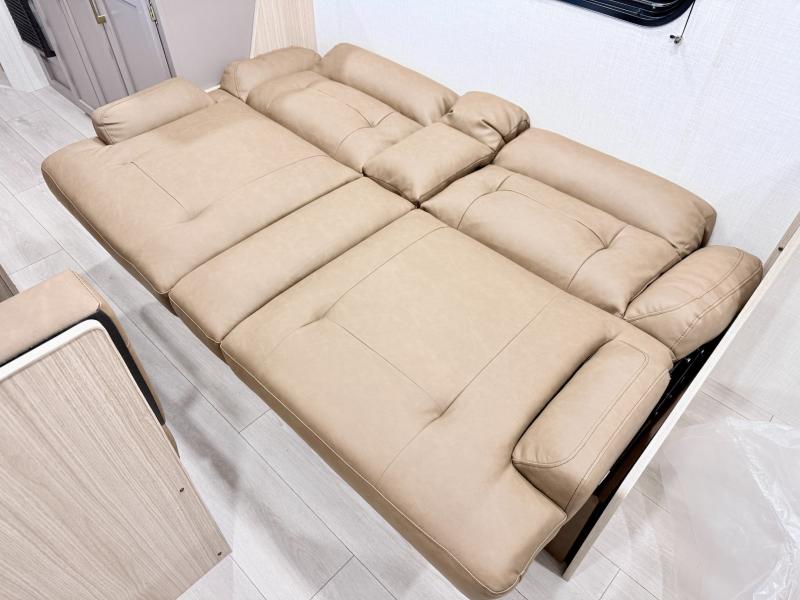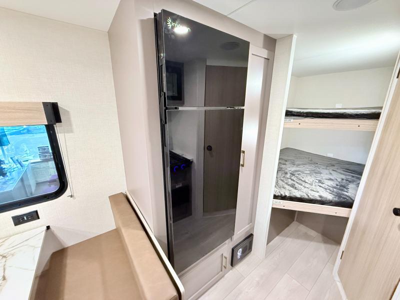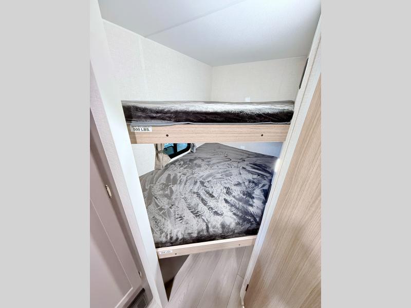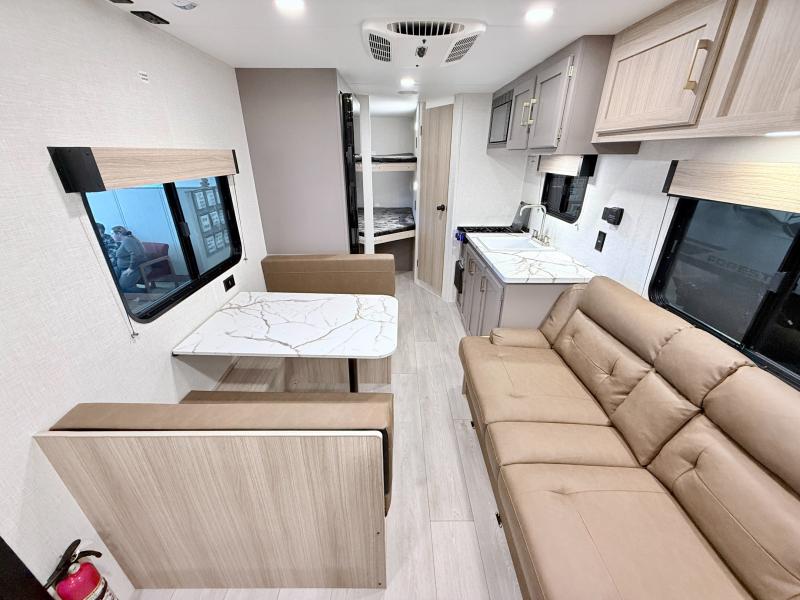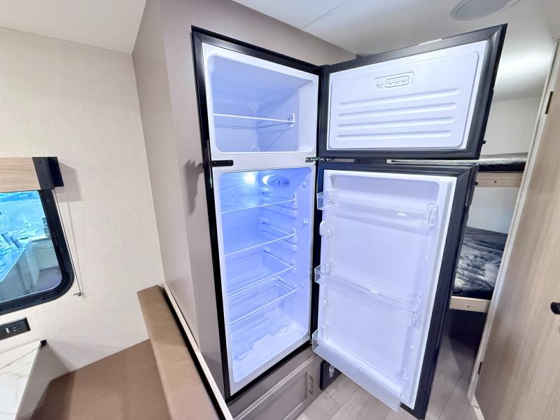 Double-size bunk beds provide ample space for kids or guests, while the front bed offers a cozy retreat for adults and nightstands add a touch of home. The full bathroom is equipped with everything you need to start your day feeling refreshed. The kitchen features an 8 cu refrigerator, two-burner cooktop, and sink, making meal prep easy. Plus, the pantry provides storage for your favorite snacks and ingredients. The jacknife sofa and booth dinette offer comfortable seating for meals, games, or movie nights.