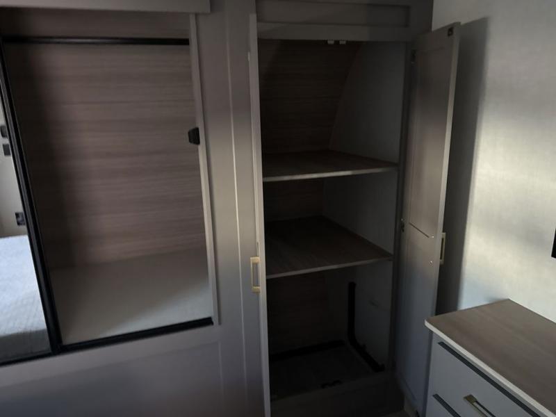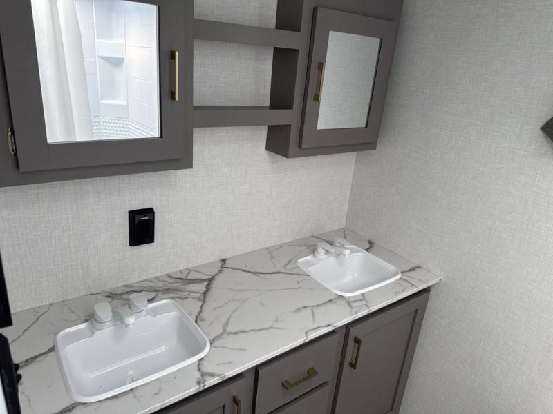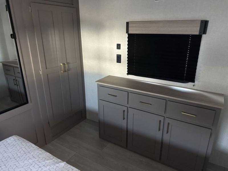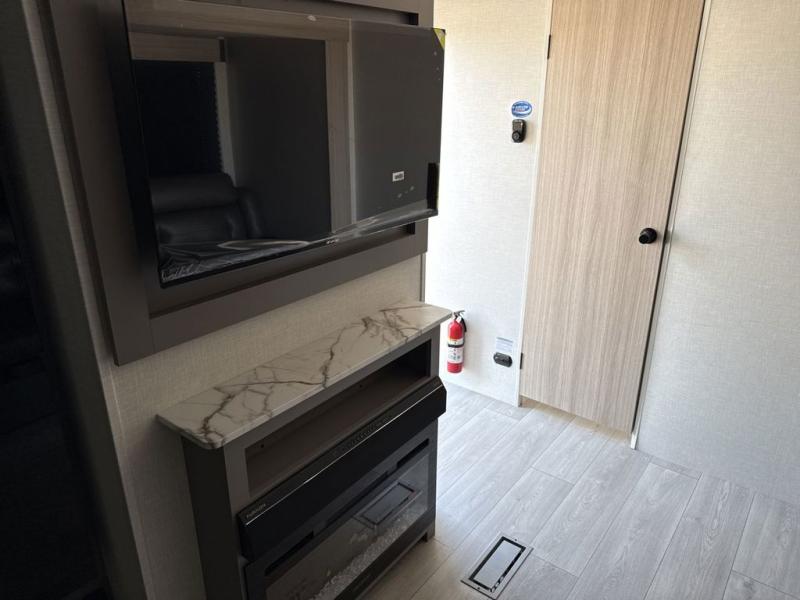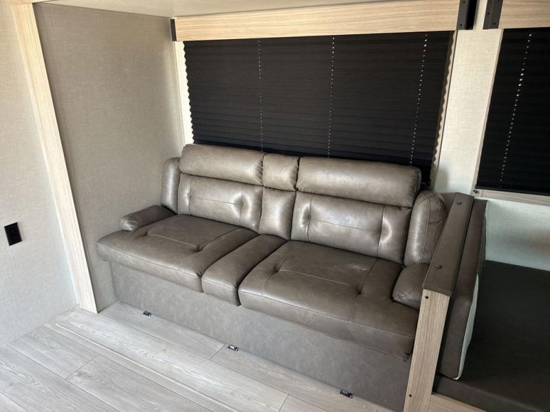 Let this travel trailer wow you with its interior comforts and exterior conveniences! There is ample space inside to move about thanks to the double slides; a large slide in the living room and a queen bed slide in the front bedroom! Your crew can relax on the 70" jackknife sofa across from the fireplace and LED TV, or play a game at the booth dinette. You will appreciate having a walk-in pantry with coat hooks right as you enter the unit, and there is more storage space found throughout. The full rear bath features a 30" x 40" shower, a linen closet, plus dual bath sinks so you both can get ready for bed at the same time! This model also includes an outside kitchen with a griddle and refrigerator plus a full interior kitchen as well!