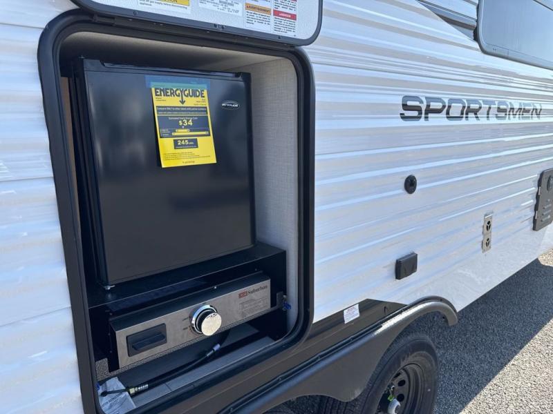 Each Sportsmen SE travel trailer and toy hauler by KZ is constructed with KZ exclusive tough shield exterior metal, a one-piece seamless walk-on Tufflex roofing material, and diamond plate rock guard to protect your unit from road debris. You will appreciate the extra large baggage doors for stowing away your gear when not in use, and tinted windows to help keep the harmful sun rays out plus keeping it cooler inside. Some of the exterior conveniences found in the mandatory Advantage Package are the solid folding steps with a large folding grab handle for easy entry and exit, a full glass friction hinged entry door, plus an exterior shower for your pets or to rinse off before you head inside. You'll also appreciate the nitrogen-filled tires, solar and backup camera prep, plus a Leash Latch with a bonus beverage opener. You'll feel right at home inside with linoleum flooring throughout, a 13,500 BTU air conditioner, large overhead cabinets, a shower surround, and much more!