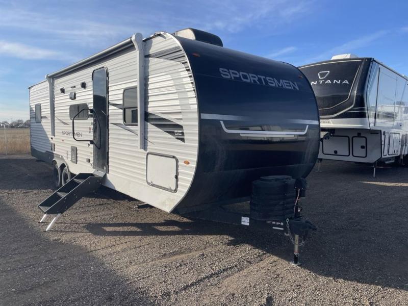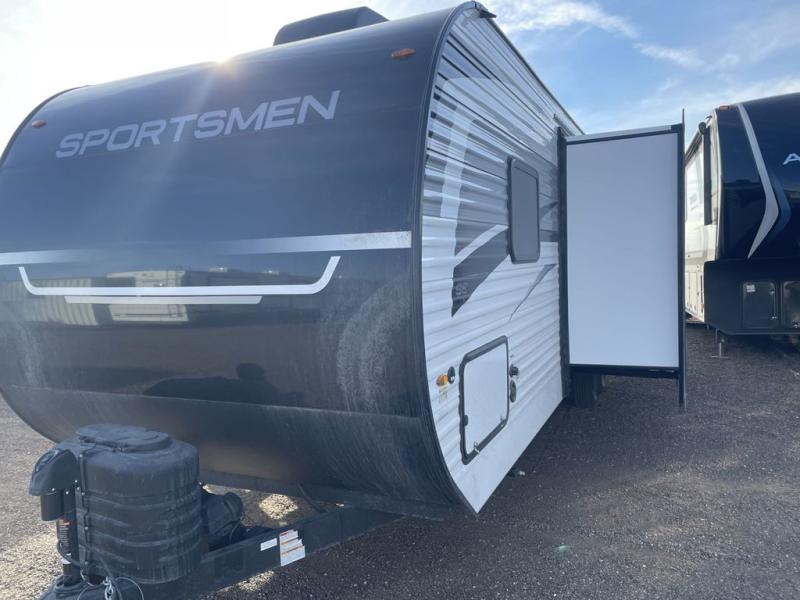 Each Sportsmen SE travel trailer and toy hauler by KZ is constructed with KZ exclusive tough shield exterior metal, a one-piece seamless walk-on Tufflex roofing material, and diamond plate rock guard to protect your unit from road debris. You will appreciate the extra large baggage doors for stowing away your gear when not in use, and tinted windows to help keep the harmful sun rays out plus keeping it cooler inside. Some of the exterior conveniences found in the mandatory Advantage Package are the solid folding steps with a large folding grab handle for easy entry and exit, a full glass friction hinged entry door, plus an exterior shower for your pets or to rinse off before you head inside. You'll also appreciate the nitrogen-filled tires, solar and backup camera prep, plus a Leash Latch with a bonus beverage opener. You'll feel right at home inside with linoleum flooring throughout, a 13,500 BTU air conditioner, large overhead cabinets, a shower surround, and much more!
