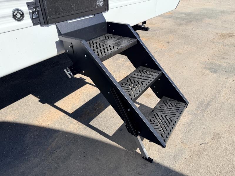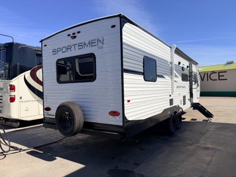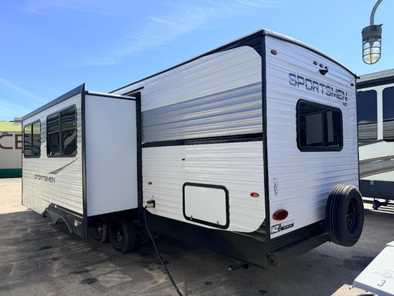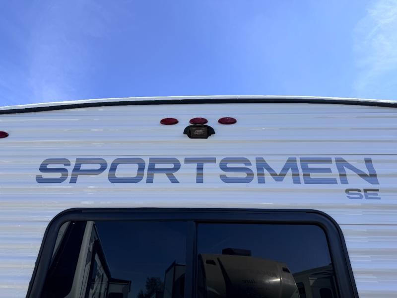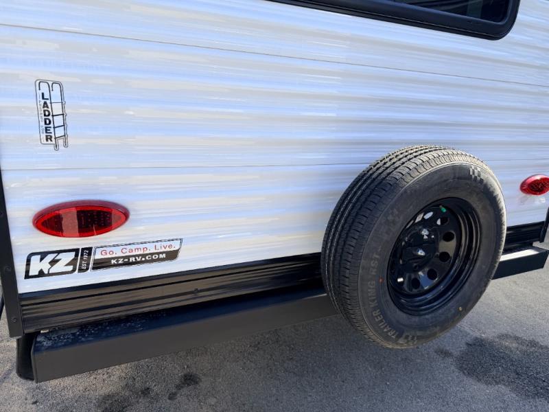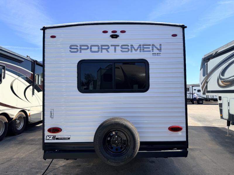 Each Sportsmen SE travel trailer and toy hauler by KZ is constructed with KZ exclusive tough shield exterior metal, a one-piece seamless walk-on Tufflex roofing material, and diamond plate rock guard to protect your unit from road debris. You will appreciate the extra large baggage doors for stowing away your gear when not in use, and tinted windows to help keep the harmful sun rays out plus keeping it cooler inside. Some of the exterior conveniences found in the mandatory Advantage Package are the solid folding steps with a large folding grab handle for easy entry and exit, a full glass friction hinged entry door, plus an exterior shower for your pets or to rinse off before you head inside. You'll also appreciate the nitrogen-filled tires, solar and backup camera prep, plus a Leash Latch with a bonus beverage opener. You'll feel right at home inside with linoleum flooring throughout, a 13,500 BTU air conditioner, large overhead cabinets, a shower surround, and much more!