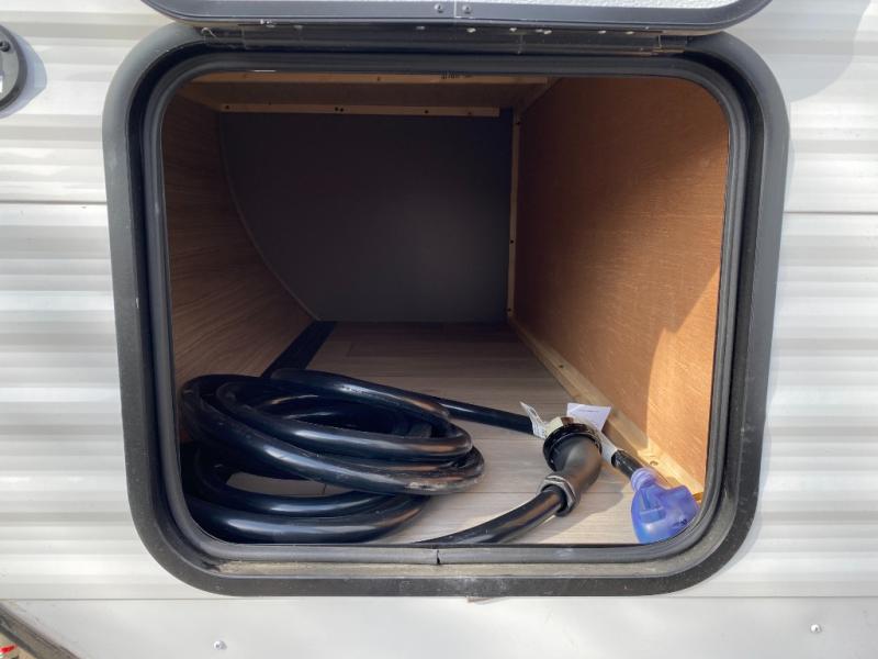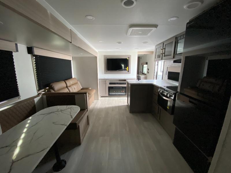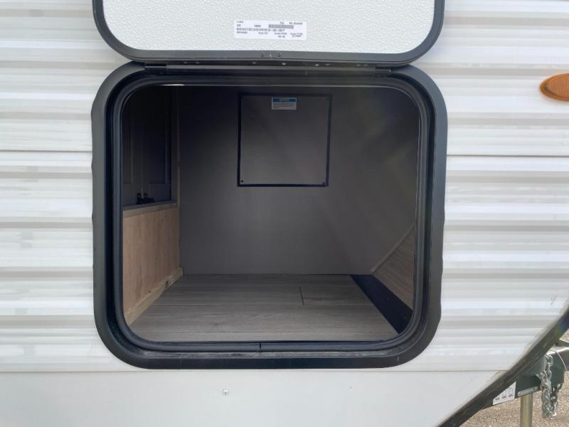 If you've been looking for a travel trailer with plenty of space for your family or group of friends, look no further than this one! The private bunkhouse includes a bunk/closet plus a jackknife sofa with a hinge bunk above. And the full bath is close by for convenience. Everyone can gather in the main living area at the U-shaped dinette, and there is a sofa here for more seating space. If the weather is nice, head outdoors to relax under the 20' power awning with LED lights as the cook prepares dinner on the outside griddle!