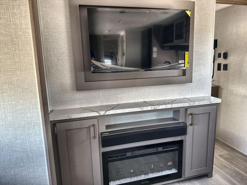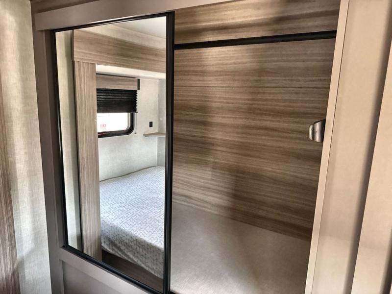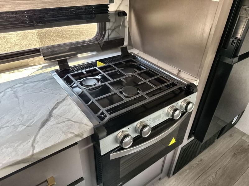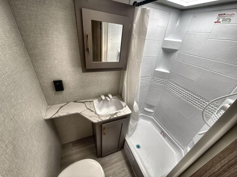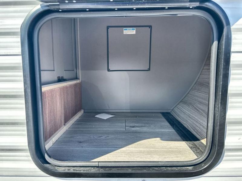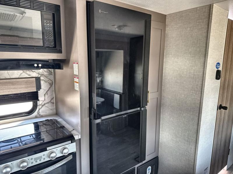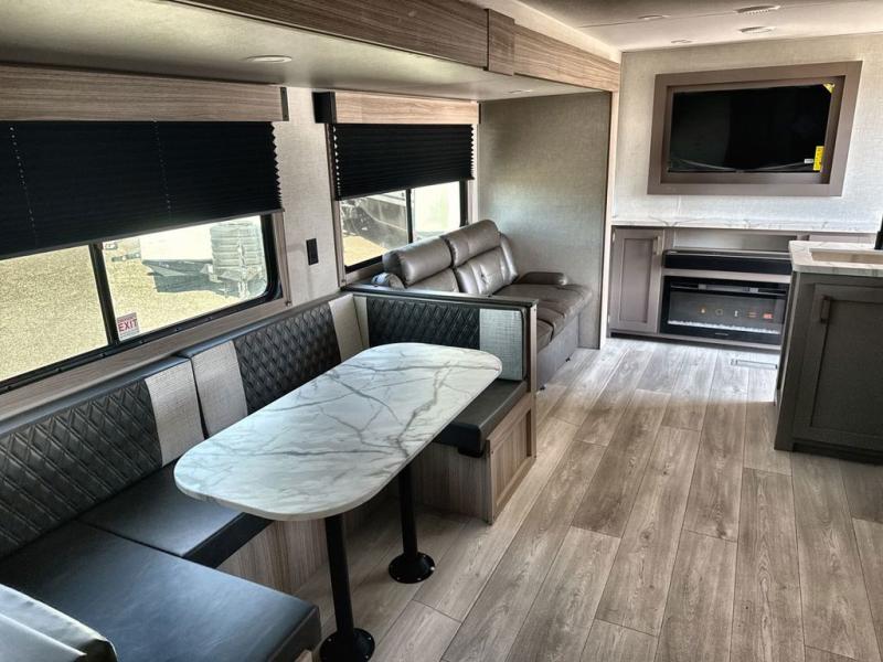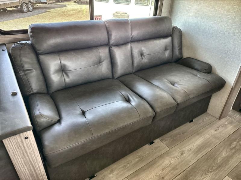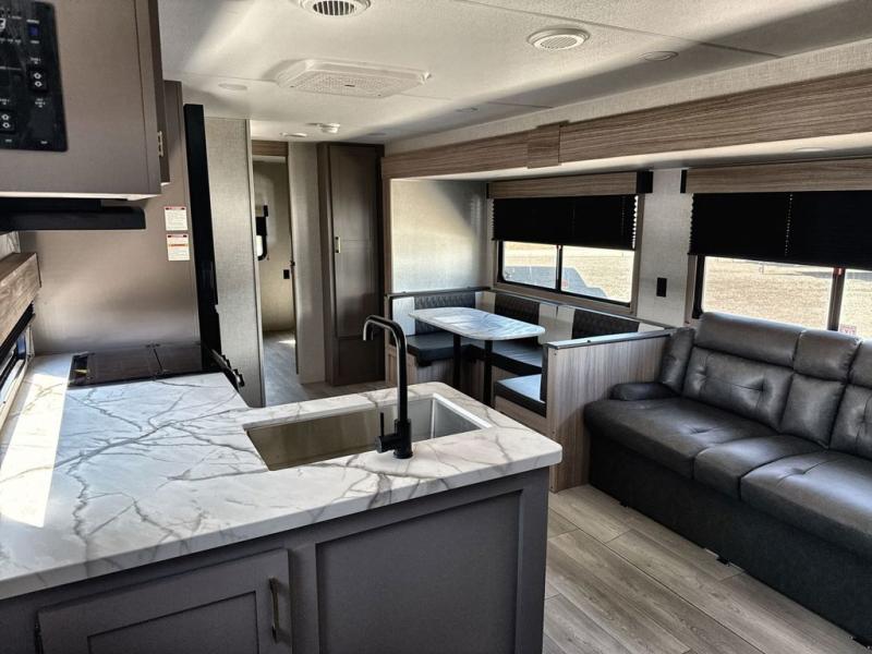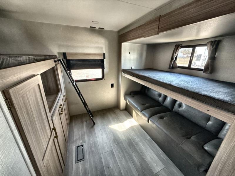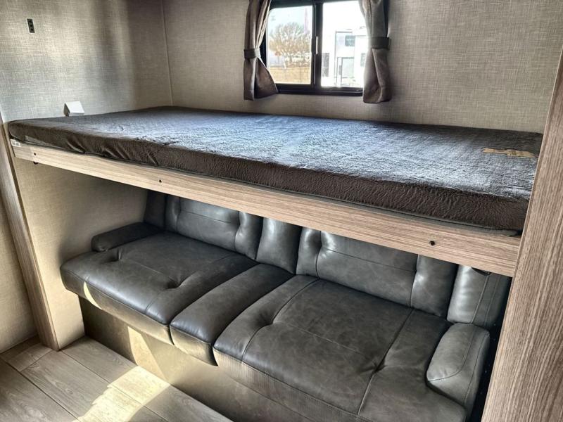 If you've been looking for a travel trailer with plenty of space for your family or group of friends, look no further than this one! The private bunkhouse includes a bunk/closet plus a jackknife sofa with a hinge bunk above. And the full bath is close by for convenience. Everyone can gather in the main living area at the U-shaped dinette, and there is a sofa here for more seating space. If the weather is nice, head outdoors to relax under the 20' power awning with LED lights as the cook prepares dinner on the outside griddle!