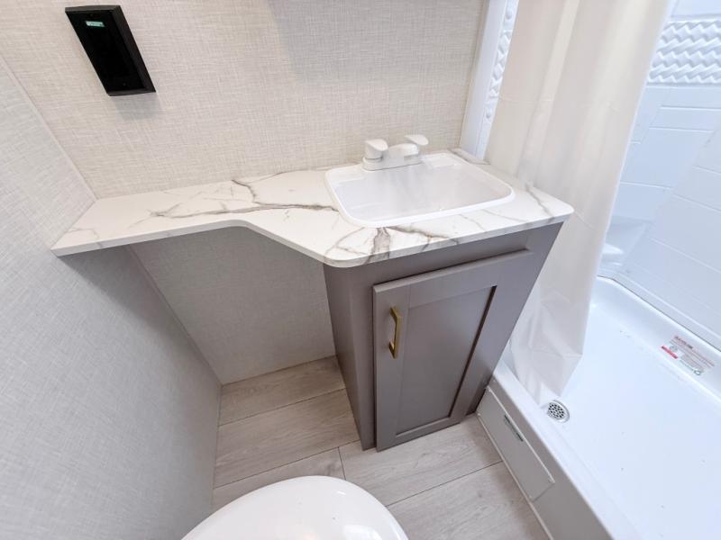 Each Sportsmen SE travel trailer and toy hauler by KZ is constructed with KZ exclusive tough shield exterior metal, a one-piece seamless walk-on Tufflex roofing material, and diamond plate rock guard to protect your unit from road debris. You will appreciate the extra large baggage doors for stowing away your gear when not in use, and tinted windows to help keep the harmful sun rays out plus keeping it cooler inside. Some of the exterior conveniences found in the mandatory Advantage Package are the solid folding steps with a large folding grab handle for easy entry and exit, a full glass friction hinged entry door, plus an exterior shower for your pets or to rinse off before you head inside. You'll also appreciate the nitrogen-filled tires, solar and backup camera prep, plus a Leash Latch with a bonus beverage opener. You'll feel right at home inside with linoleum flooring throughout, a 13,500 BTU air conditioner, large overhead cabinets, a shower surround, and much more!