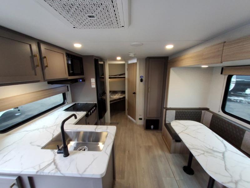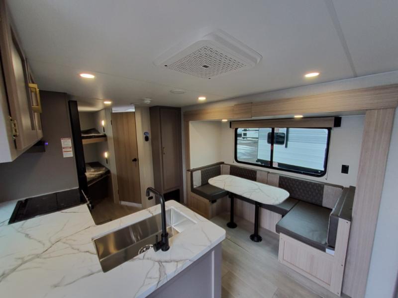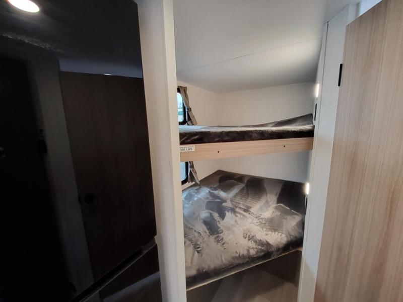 This bunkhouse model is perfect for your whole crew! Your guests or little ones will love the double-size bunks, while you take the queen bed in the front private bedroom. The large slide out will create an open living area, and here you'll find the 80" U-shaped dinette where you can dine, play games, and let guests sleep over. And don't overlook the full bath right next to the bunks for easy nighttime use. There is plenty of storage space in this model, including a pantry in the kitchen, dual wardrobes in the bedroom, an exterior pass-through storage, and even an exterior trunk door under the bunks to easily fit in all your gear!