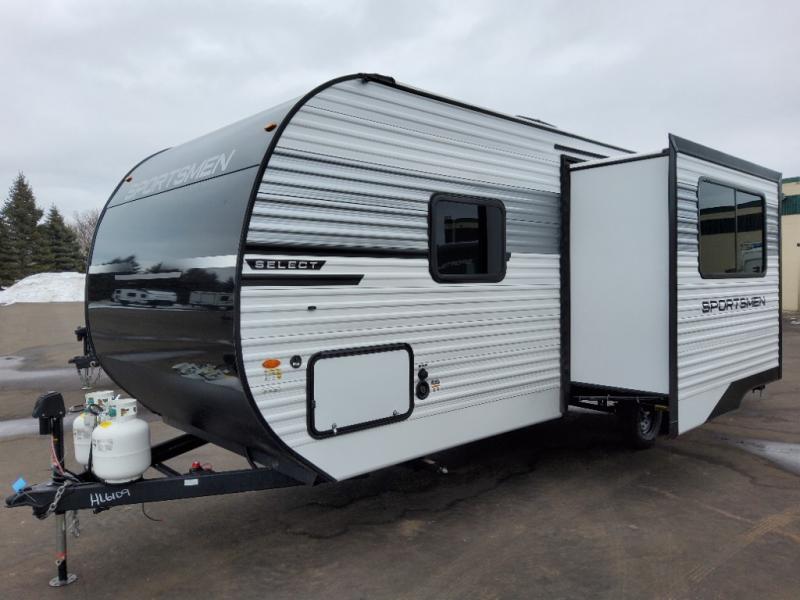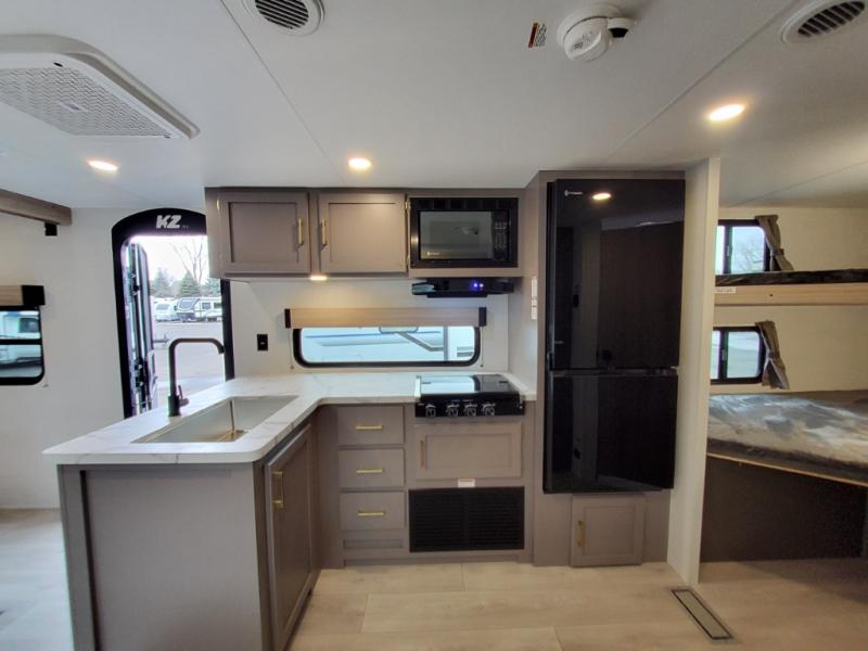 With any Sportsmen Select travel trailer by KZ, you will enjoy premium features at an affordable price, making them perfect for rookie RVers! Each model is constructed with an aerodynamic front profile with a smooth metal front for better fuel efficiency, and the nitrogen filled tires and power tongue jack will make towing easier than ever. There are is also a Key-Alike system for entry and baggage doors to keep your belongings secure, plus backup camera prep and solar roof prep means you can easily add these features to make camping that much smoother. An omnidirectional HDTV antenna with Wi-Fi prep will give you the option to stay connected as you camp, and a multi-media sound bar stereo with Bluetooth, HDMI and USB charge will ensure you'll never go bored on rainy days. The interior of these travel trailers include seamless countertops with a deep undermount stainless steel kitchen sink, a black residential kitchen faucet, wider pocket/passage doors, and residential grade linoleum.