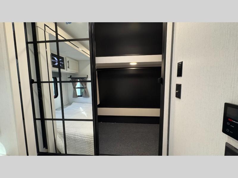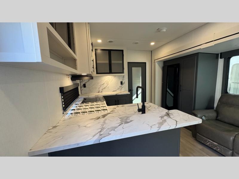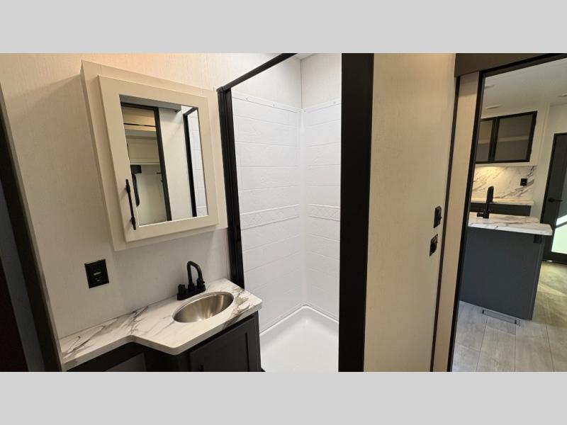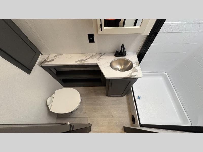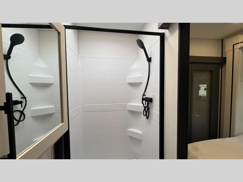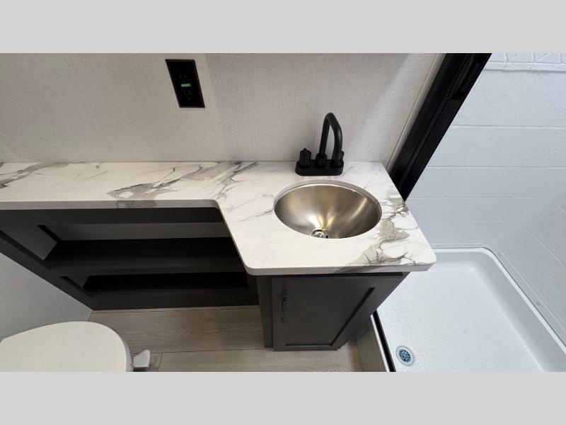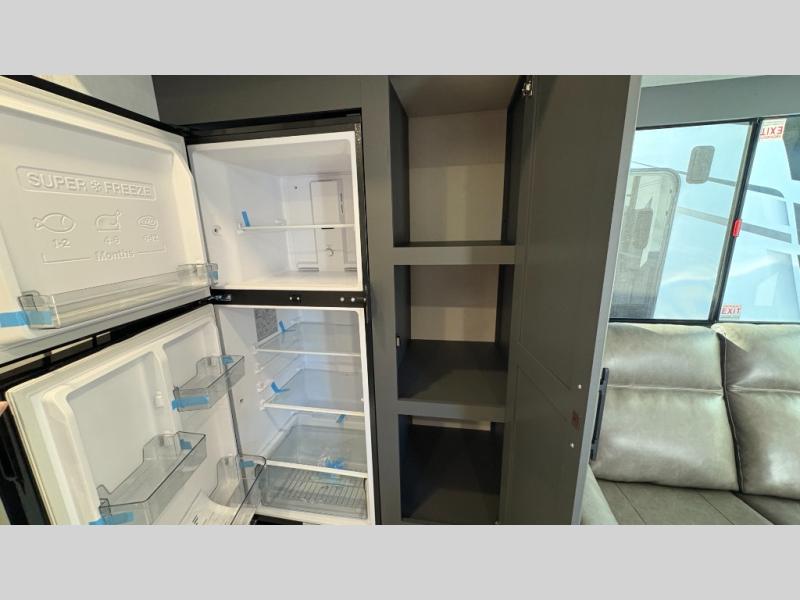 Designed for thrill-seekers and families alike, this incredible RV offers the perfect blend of comfort, convenience, and fun. Retreat to the bedroom, where you'll find a queen bed, a spacious wardrobe, and ample shelving for all your gear. The full bathroom features a generous 30” x 36” shower, perfect for washing away the dirt and grime of a day on the trails. The kitchen/living room is the heart of the toy hauler, equipped with a 12 cu refrigerator, microwave, dual sofa, and pantry for all your favorite snacks. But the real excitement begins in the 13’ 6” garage, where you'll find a power bed with sit & sleep, and laminated bed base, perfect for converting the space into a spacious bedroom or play area. Plus, a TV mount for entertainment. When you're ready to take the party outside, simply open up the ramp door and enjoy the fresh air with our patio rail kit, or, fire up the outside kitchen and cook up a storm!