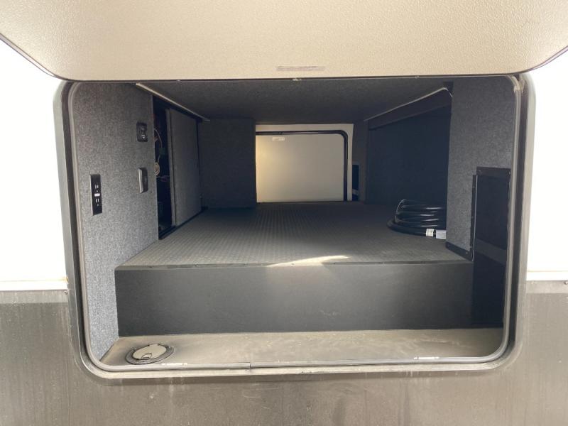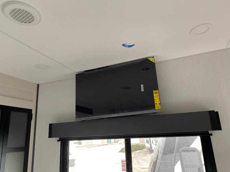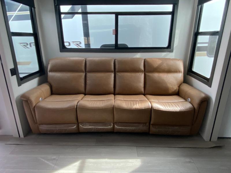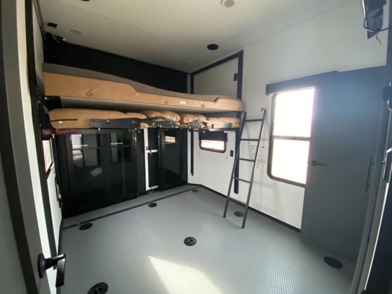 Designed with the ultimate adventurer in mind, this luxurious toy hauler fifth wheel offers the perfect blend of comfort, convenience, and fun. The front bedroom is a serene retreat, featuring a plush queen bed and a dresser with hidden storage for all your valuables. The full bathroom is a spacious oasis, complete with a generous 30” x 36” shower. The kitchen/living room is the heart of the fifth wheel toy hauler, equipped with a 16 cu refrigerator, microwave, super theater sofa, pantry, entertainment center, and a convenient half bathroom. Whether you're cooking up a storm or relaxing with family and friends, this space has everything you need. The 11’ garage is the ultimate playground, featuring a power bed, with laminated bed base, and a 32" x 96" loft bed. Finally, when you're ready to take the party outside, simply open up the ramp door and enjoy the fresh air with our patio rail kit. Relax in the shade with our massive 11’ & 15’ awnings, perfect for outdoor entertaining.