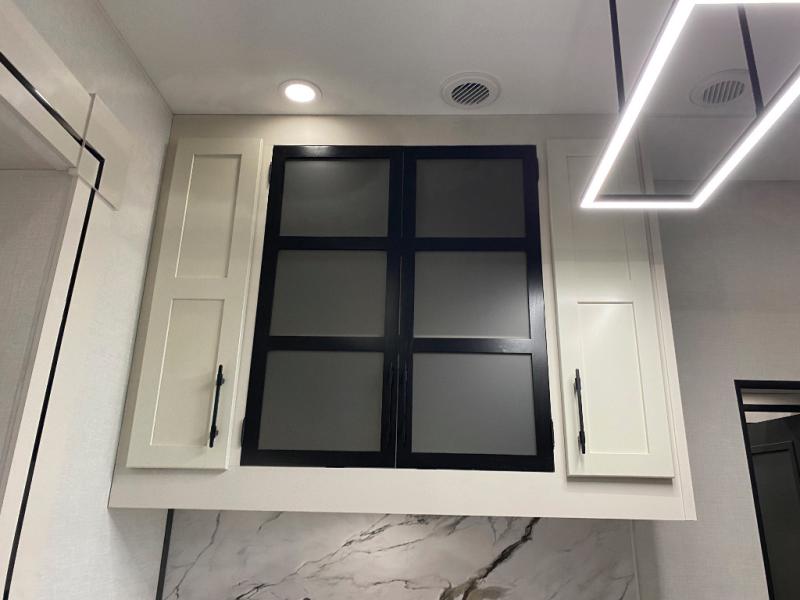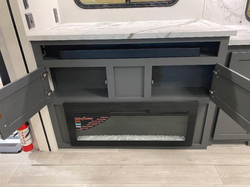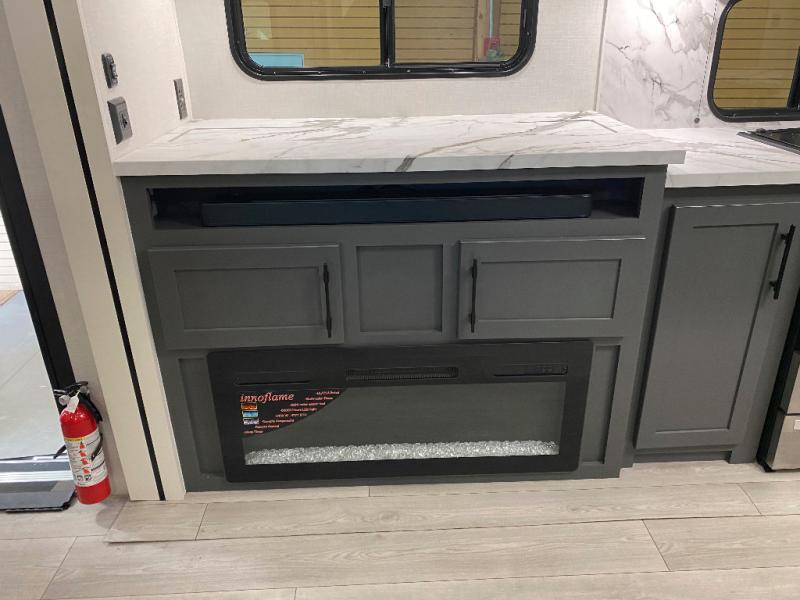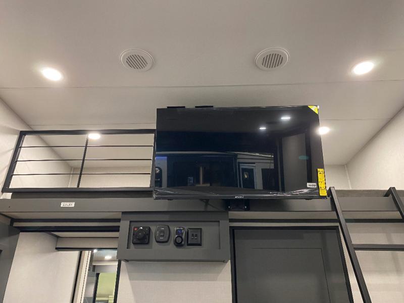 This fifth-wheel toy hauler is the perfect vehicle for unwinding on the road. The front bedroom boasts a plush queen bed, dresser with hidden storage, and washer and dryer prep for added convenience. The full bathroom is complete with a generous 30” x 36” shower. The kitchen is a culinary dream, equipped with a 16 cu refrigerator, microwave, 3-burner cooktop, and pantry for all your favorite snacks. The living room is the perfect place to relax and entertain featuring theater seating, a spacious 64” sofa, a cozy fireplace, and an LED TV for movie nights. The 13’ 6” garage is the ultimate playground, featuring a 60” x 84” power bed with seat & sleep, and a laminated bed base, perfect for converting the space into a spacious bedroom or play area. Plus, a 32” x 96” loft bed for added sleeping capacity. Step outside and enjoy the fresh air with our patio rail kit, perfect for outdoor entertaining, and enjoy nature in the shade with our massive 14’ & 20’ awnings, and get ready to take your adventures to new heights!