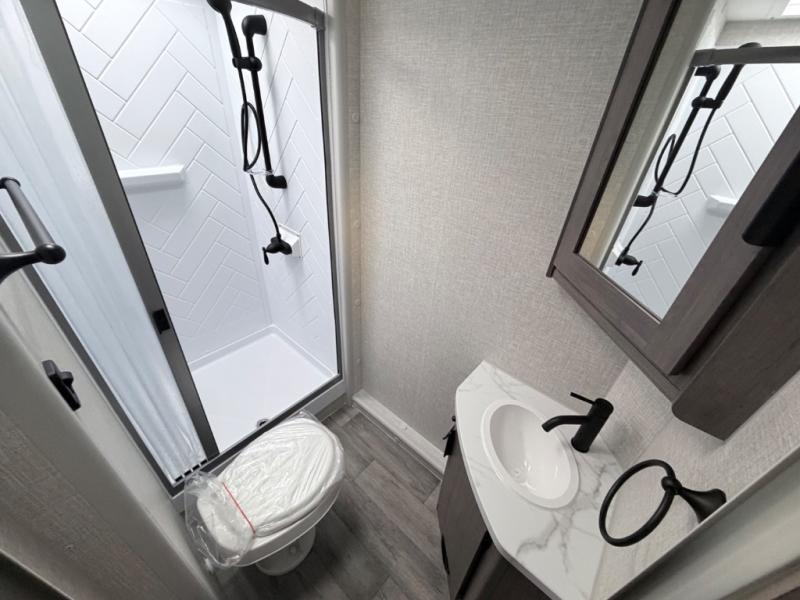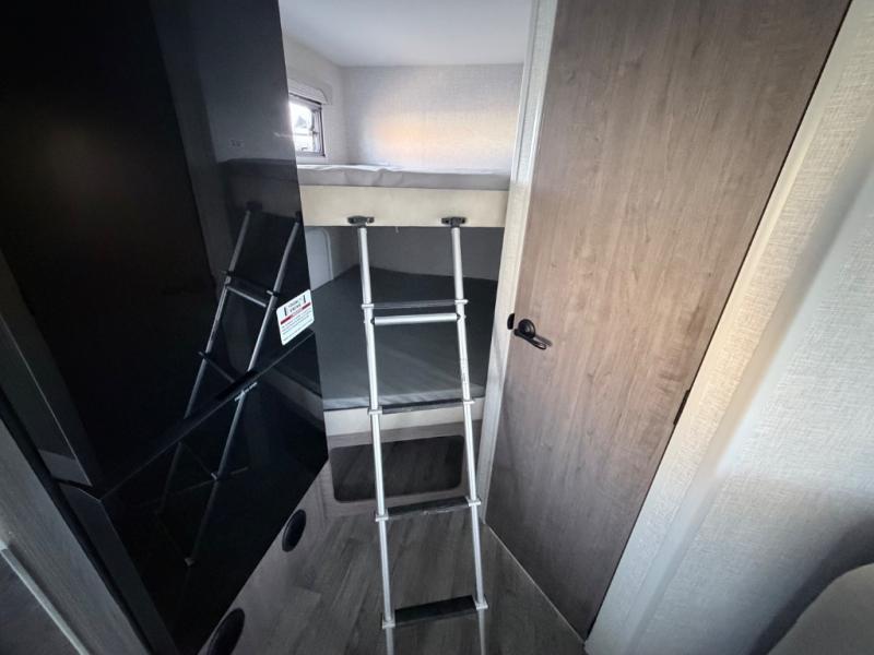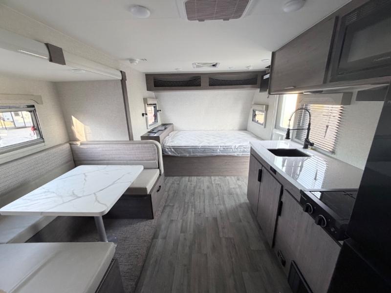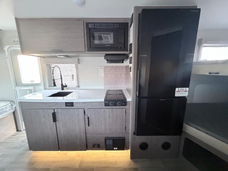 This travel trailer with double-size bunks, a front queen bed, plus a U-shaped dinette can sleep eight happy campers each night! You'll find a flush mount two-burner cooktop with a glass cover and a convection microwave oven to make meals each day, along with a 10.7 cu. ft. Furrion refrigerator to keep food fresh. The rear corner full bath is right next to the bunks for easy nighttime use, and here you'll find a residential radius soft shower door enclosure, a medicine cabinet with a mirror door, plus a dual pane skylight for added head room and natural lighting. Outside, the power awning will provide shade as you visit with campground neighbors, and the pass-through storage with Slam Latch will let you easily grab the fishing poles before heading down to the dock!