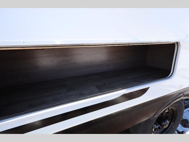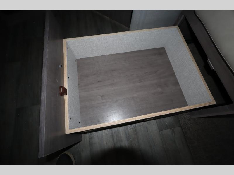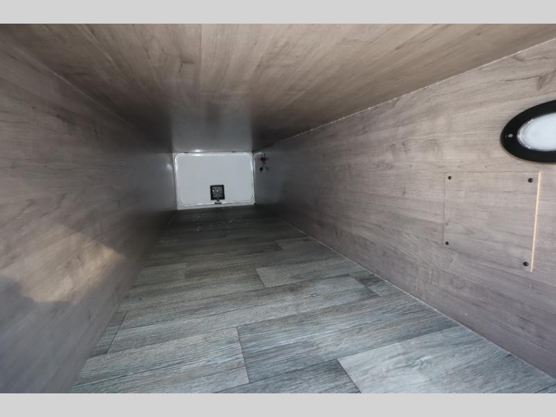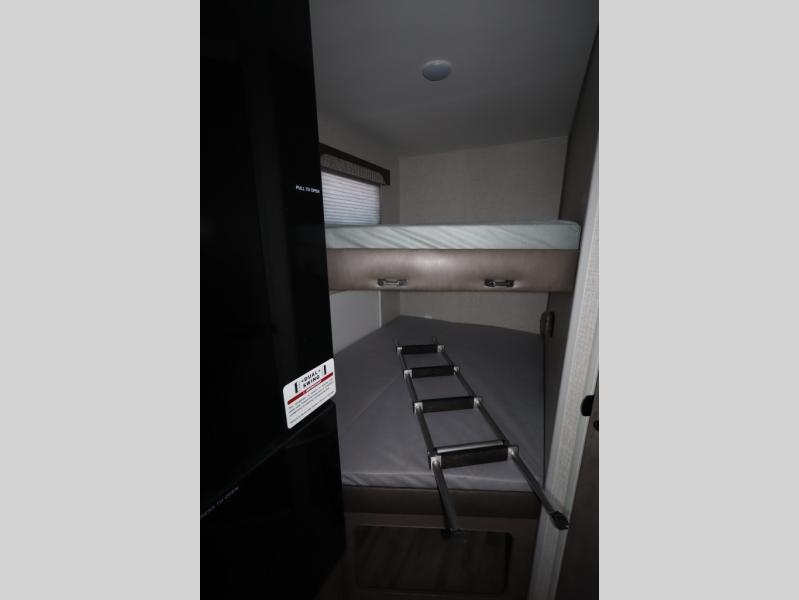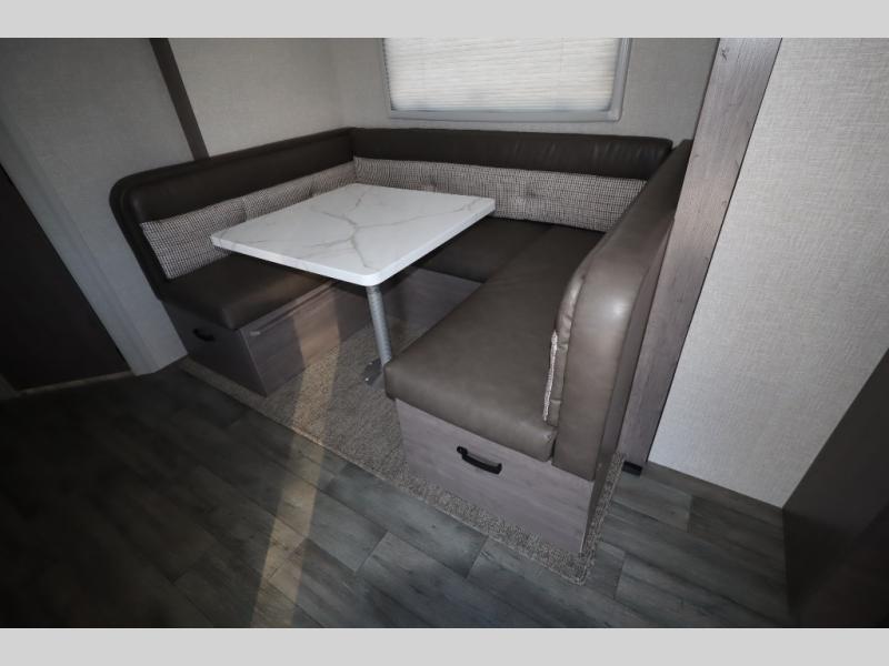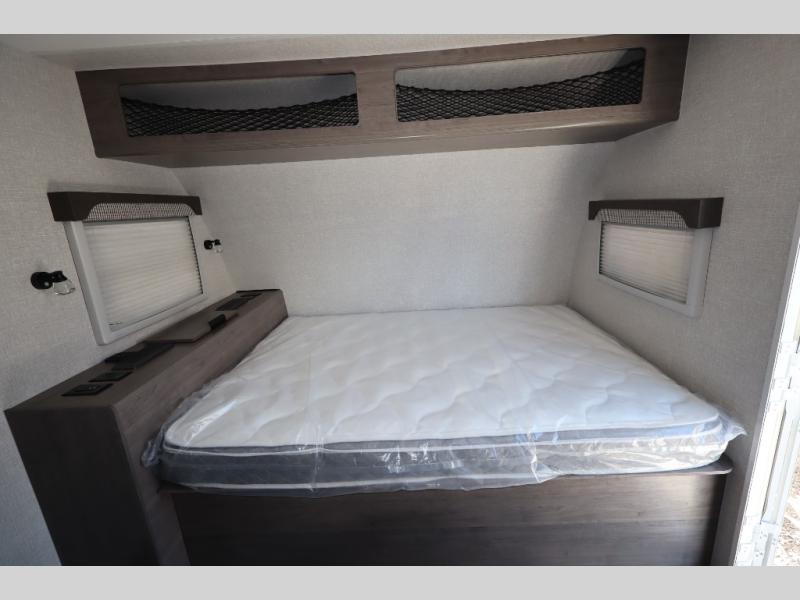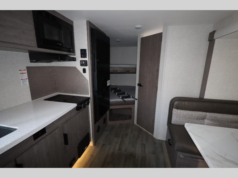 This travel trailer with double-size bunks, a front queen bed, plus a U-shaped dinette can sleep eight happy campers each night! You'll find a flush mount two-burner cooktop with a glass cover and a convection microwave oven to make meals each day, along with a 10.7 cu. ft. Furrion refrigerator to keep food fresh. The rear corner full bath is right next to the bunks for easy nighttime use, and here you'll find a residential radius soft shower door enclosure, a medicine cabinet with a mirror door, plus a dual pane skylight for added head room and natural lighting. Outside, the power awning will provide shade as you visit with campground neighbors, and the pass-through storage with Slam Latch will let you easily grab the fishing poles before heading down to the dock!